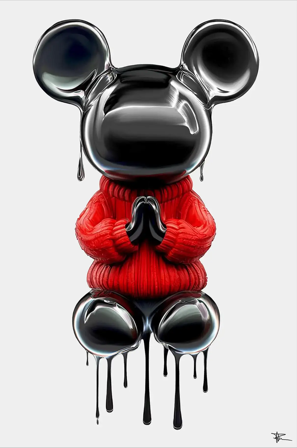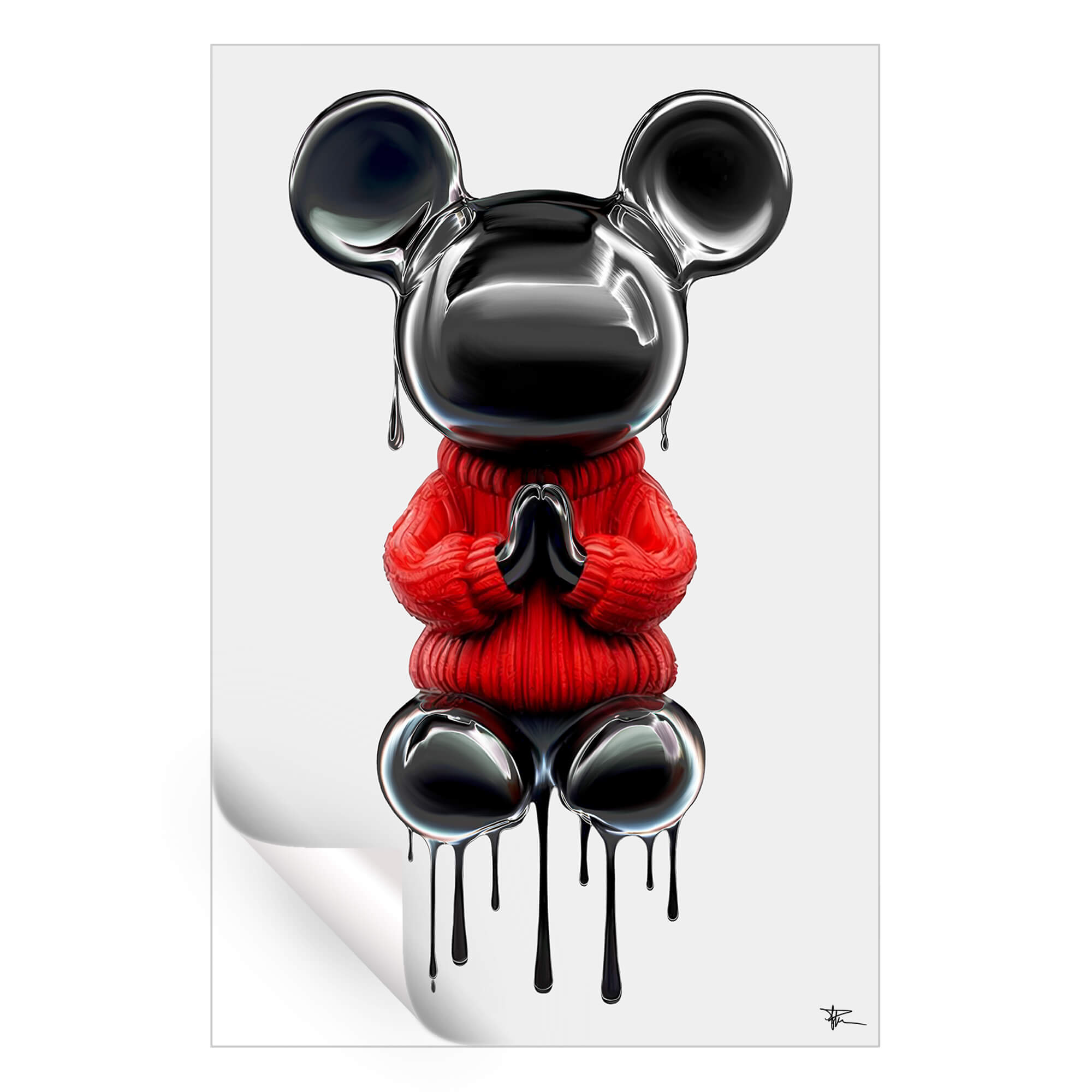 Embrace the edgy charm of the Graffiti Sweater with its striking black, white, and red palette. This fun wall art captures a rebellious spirit, blending urban elements with a playful twist. The artwork features a teddy bear in a bold red sweater, dripping with black paint, epitomizing the punk wall art genre.