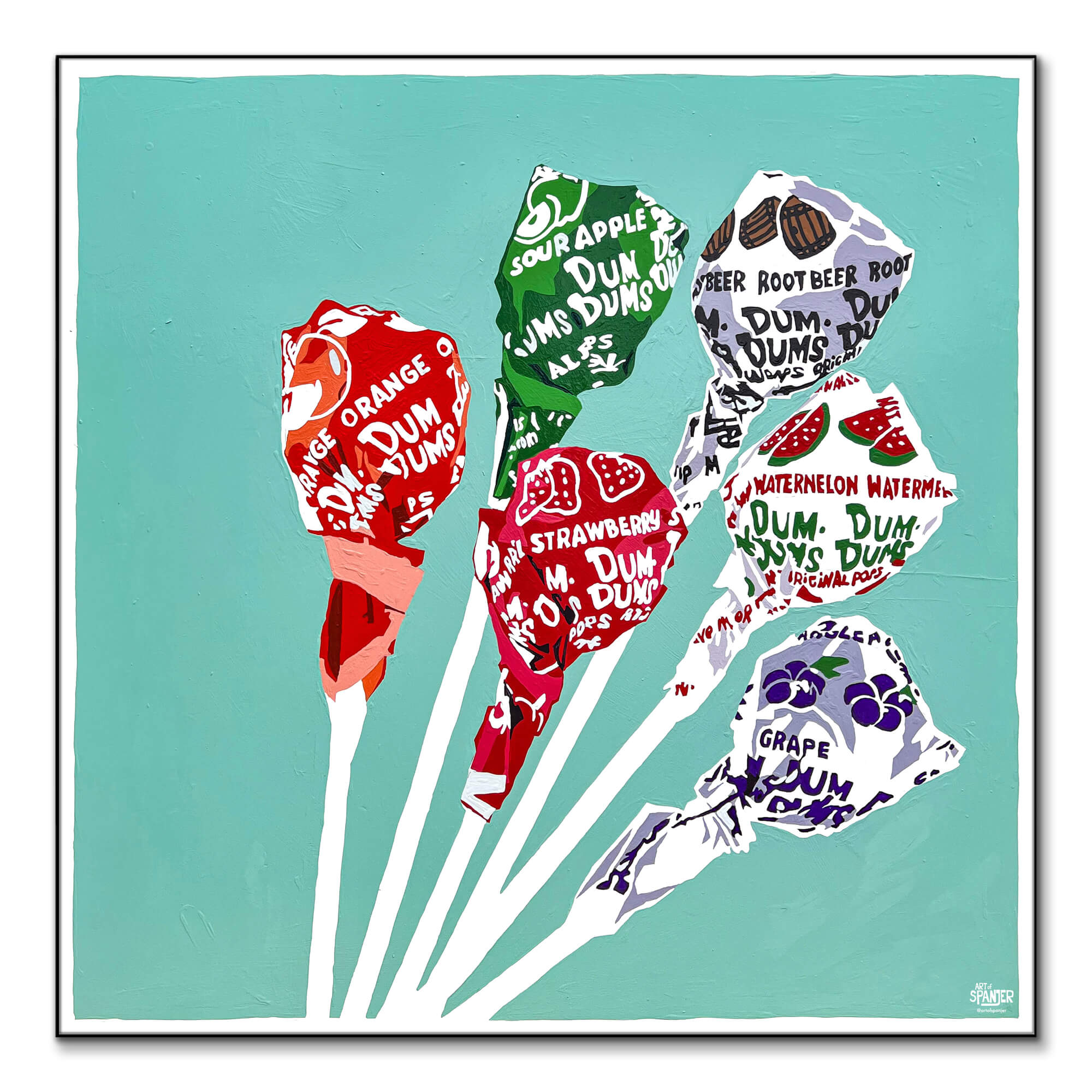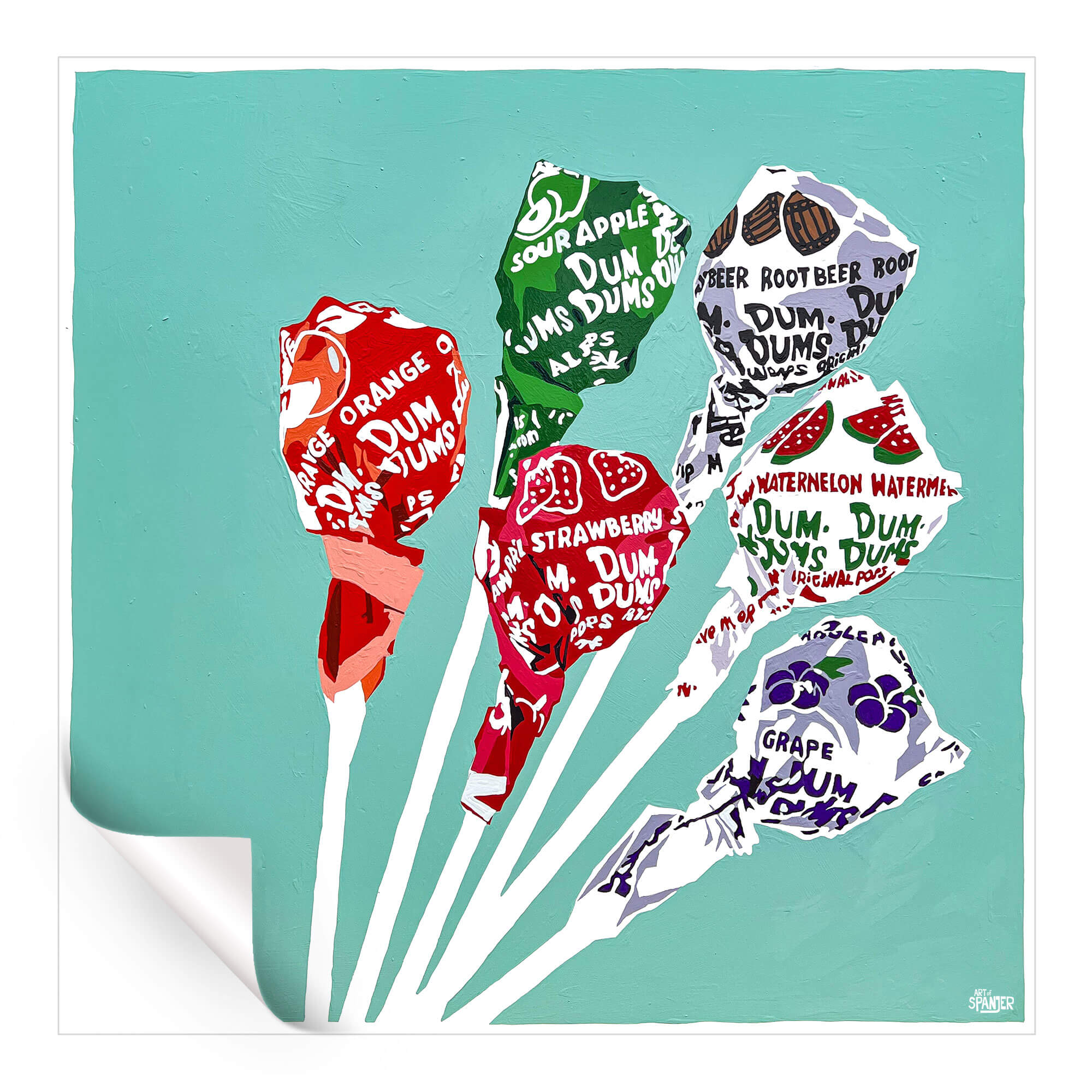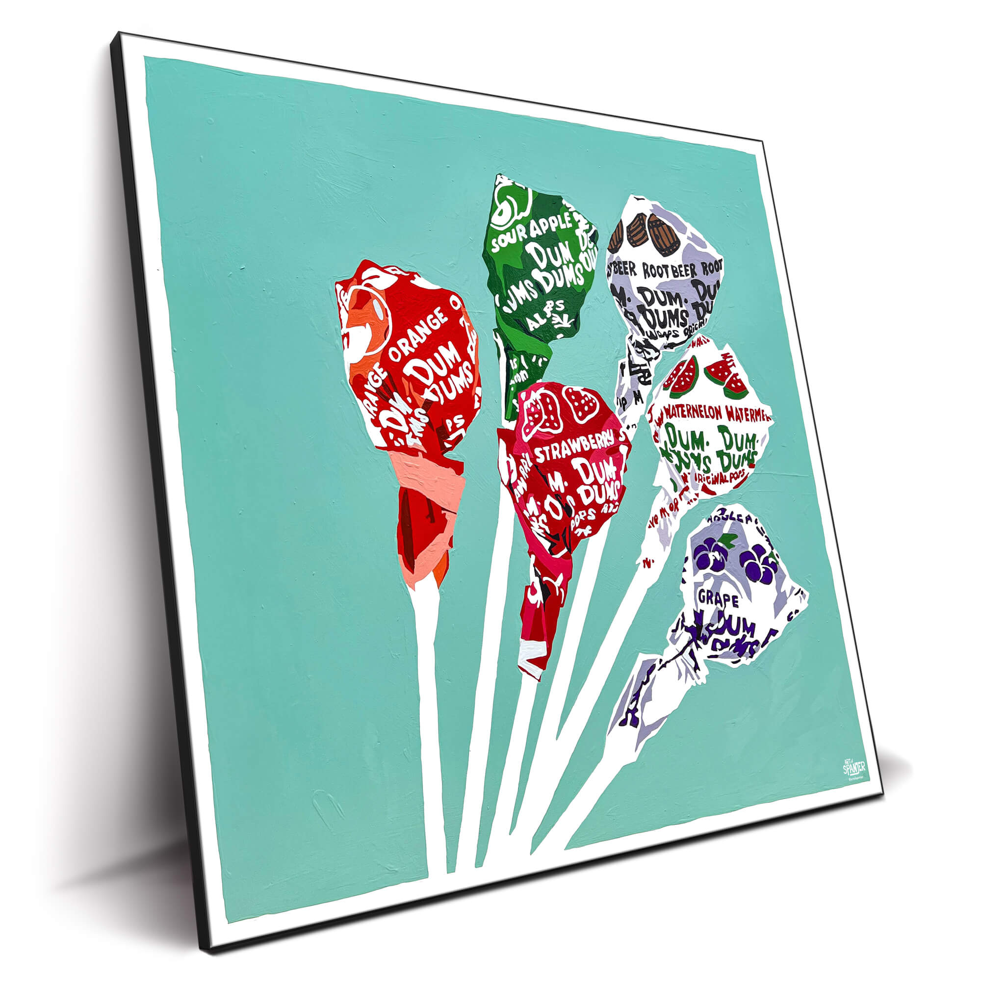 The flat, bold painting style keeps the focus on the shapes and colors, bringing a nostalgic candy-shop feel with a modern pop art twist. Visible brush texture in the teal backdrop adds a hand-painted touch, while the clean white sticks and border keep it crisp. This pop art piece feels fun, youthful, and a little retro, perfect for anyone who loves color, nostalgia, or a quirky touch in their space. It has candy-store energy without feeling childish, just bright, sweet, and instantly eye-catching. The simplicity of the composition makes the artwork easy to style and gives it playful personality in any room.