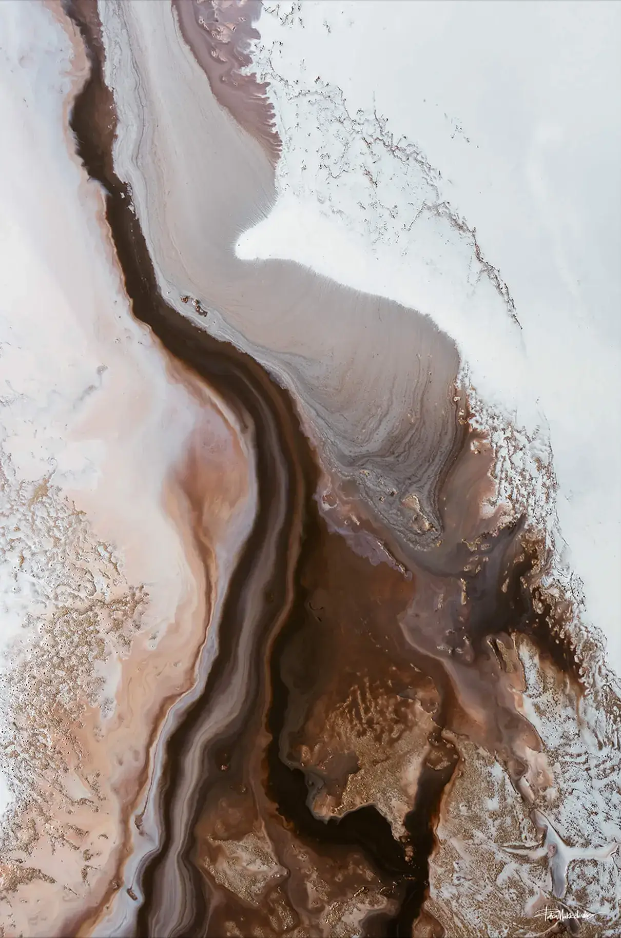 This stunning abstract piece features a harmonious blend of soft earthy tones and fluid movement. Rich browns, whites, and creams flow together, creating a sense of depth and texture that evokes natural landscapes, like the winding curves of a river or the layers of sediment over time. The delicate details and smooth transitions between light and dark areas bring an organic elegance to this artwork, making it a sophisticated addition to any modern or minimalist space. Printed on high-quality materials, this piece adds warmth and serenity while maintaining a striking, contemporary look.