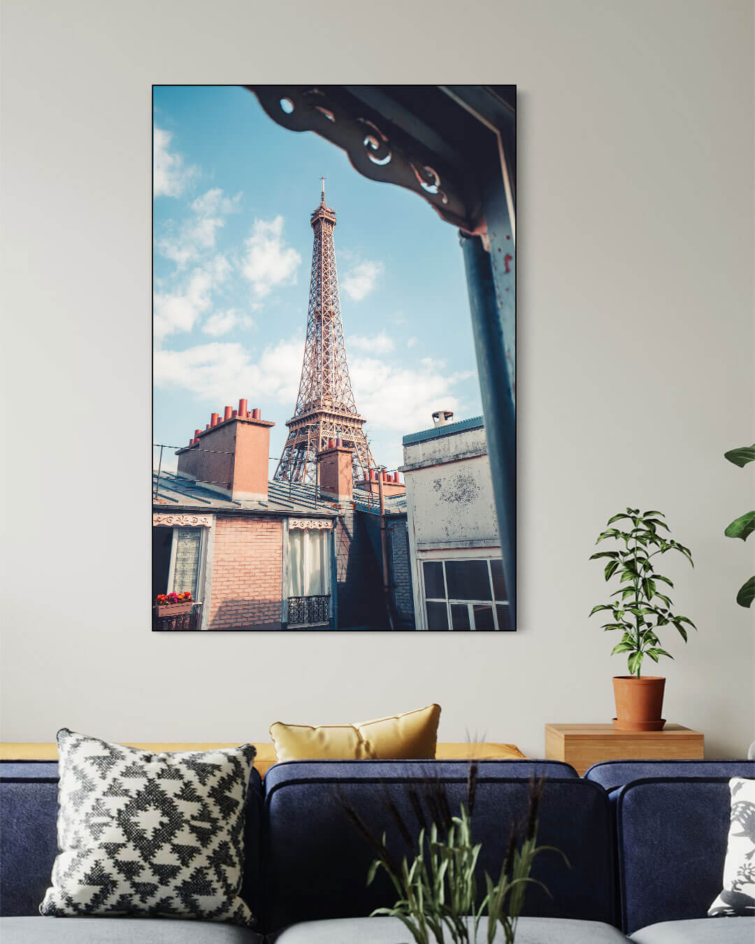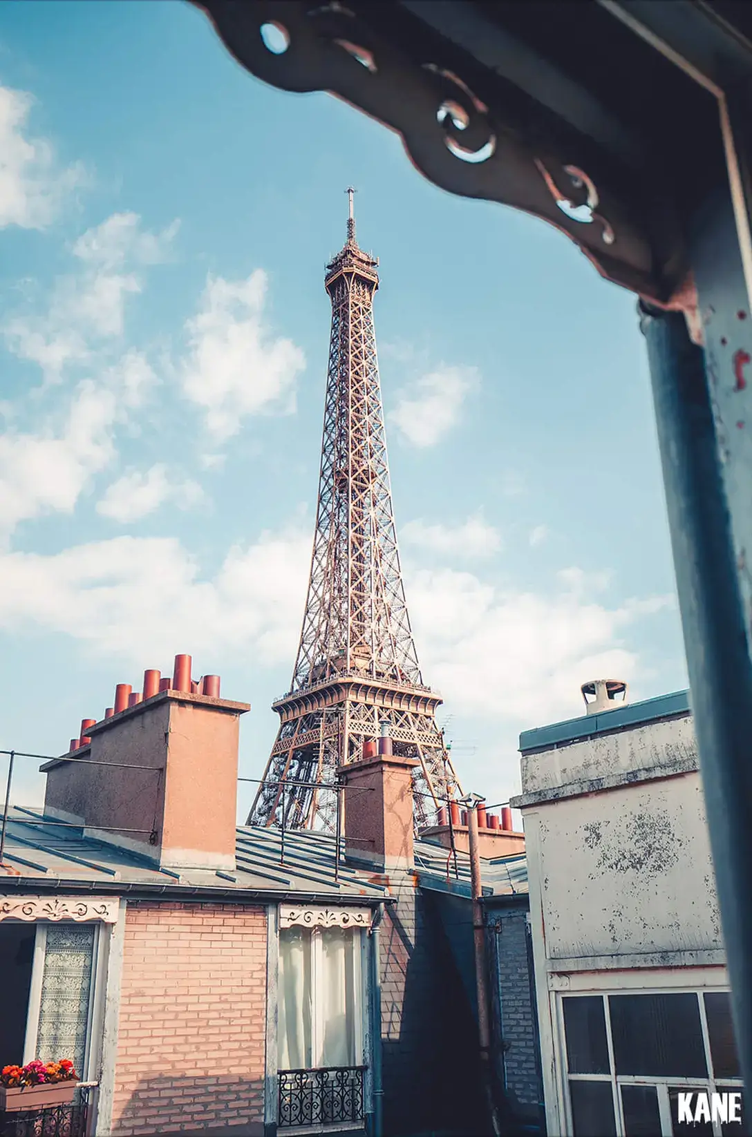 Above the rooftops, the Eiffel Tower stretches into the blue sky, a sight known around the world.