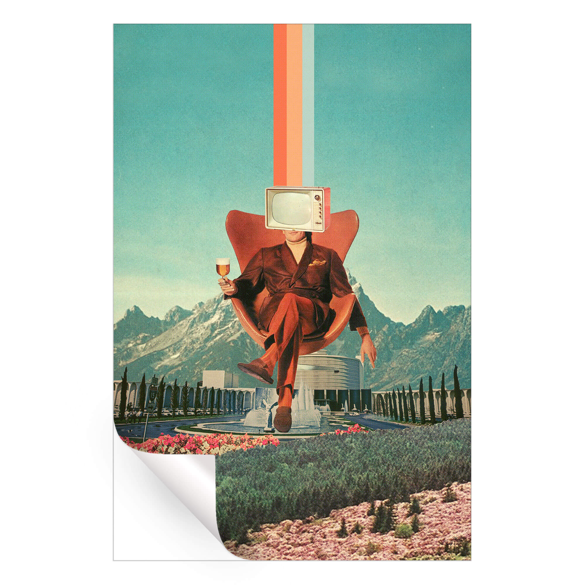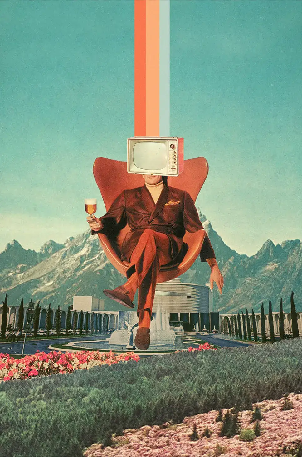 A figure sits in a modernist chair, a vintage television set for a head, all against a contrasting backdrop that marries nature and architecture. Vertical stripes shoot upwards from the figure, slicing through the composition. They’re clad in a tailored suit, holding a glass, poised and relaxed amidst this surreal setting. The juxtaposition of leisure, technology, and the idyllic landscape plays with themes of relaxation in the digital age.