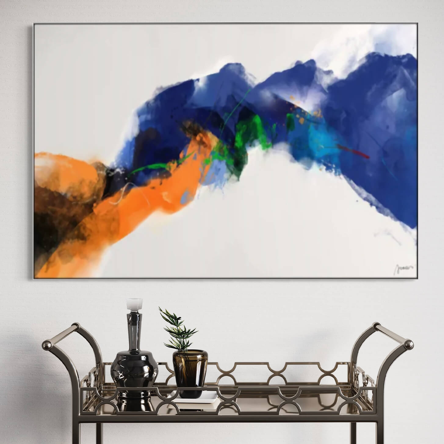 Vivid blue and rich indigo tones surge across space, cut through by an earthy orange swath that ignites the composition with warmth. Splatters and drips of green and red suggest an organic, lively presence. The colors clash and coalesce, forming an almost topographical intensity that mimics the contours of a landscape.