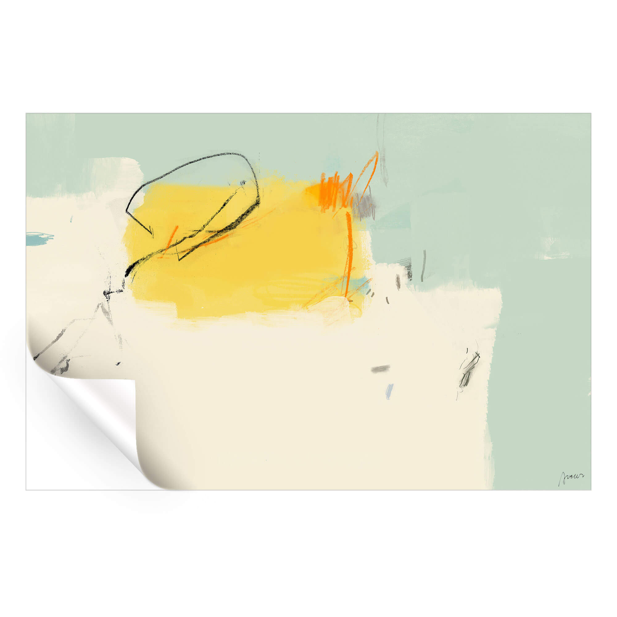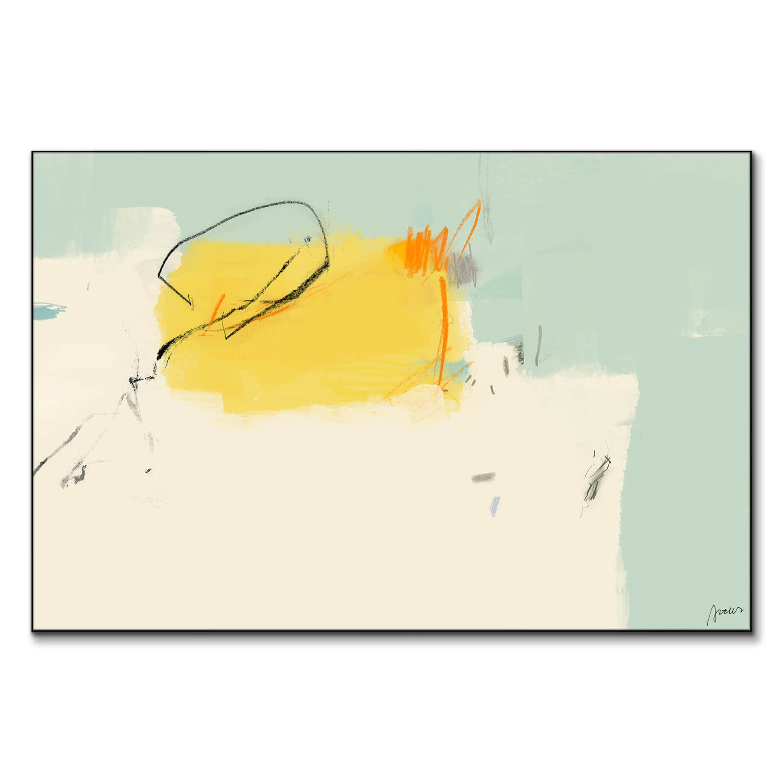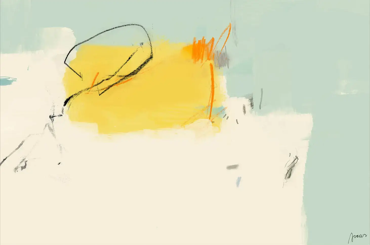 Amid a gentle sea of soft, sky blues and creamy whites, a burst of sunshine yellow takes center stage, exuding warmth and vivacity. The yellow is not neat or contained, spilling and reaching out as if it’s light trying to touch every corner of the scene.