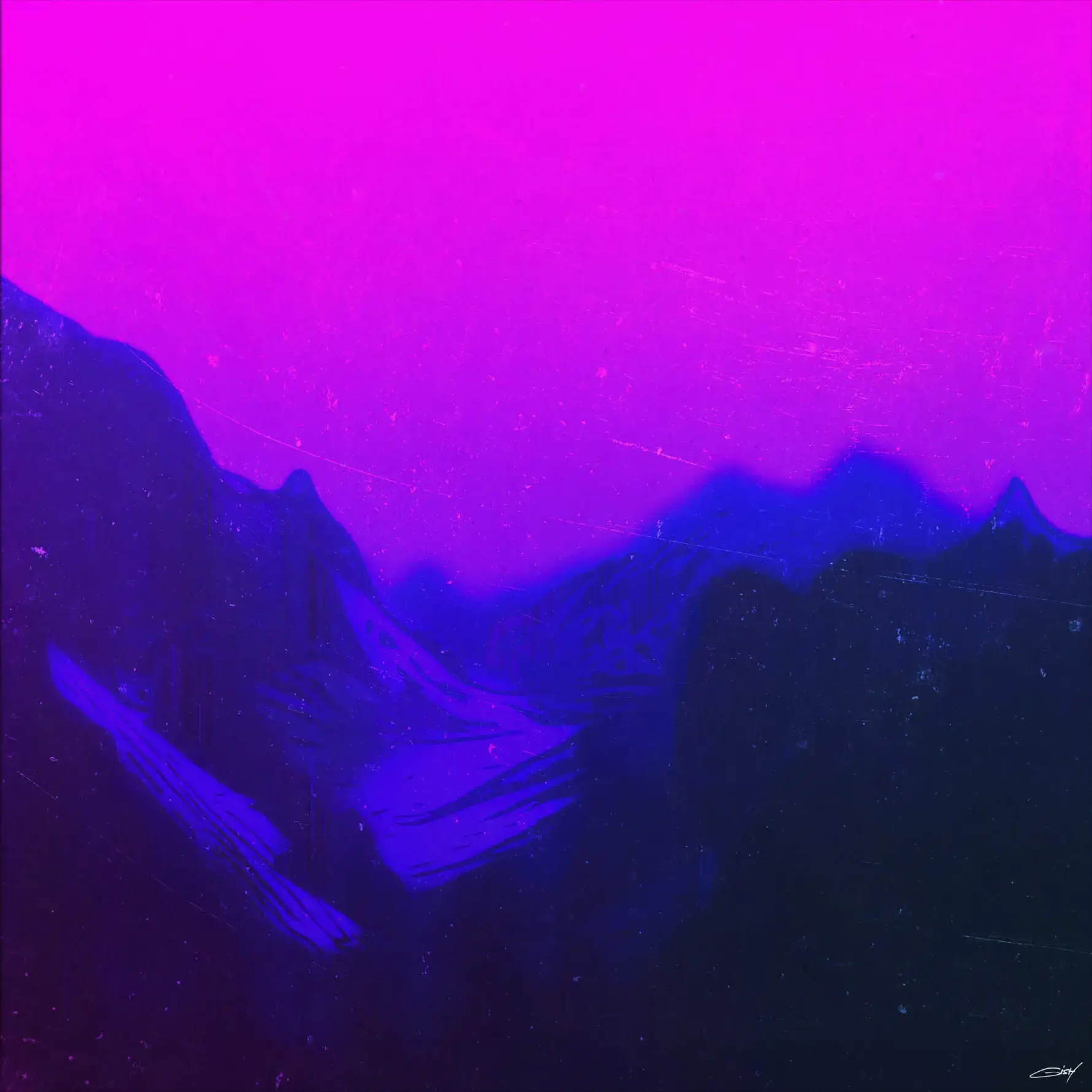 Dark silhouetted mountains rest below a vivid purple sky. The composition focuses attention on the contrast between the vibrant sky and the dark mountainous forms.