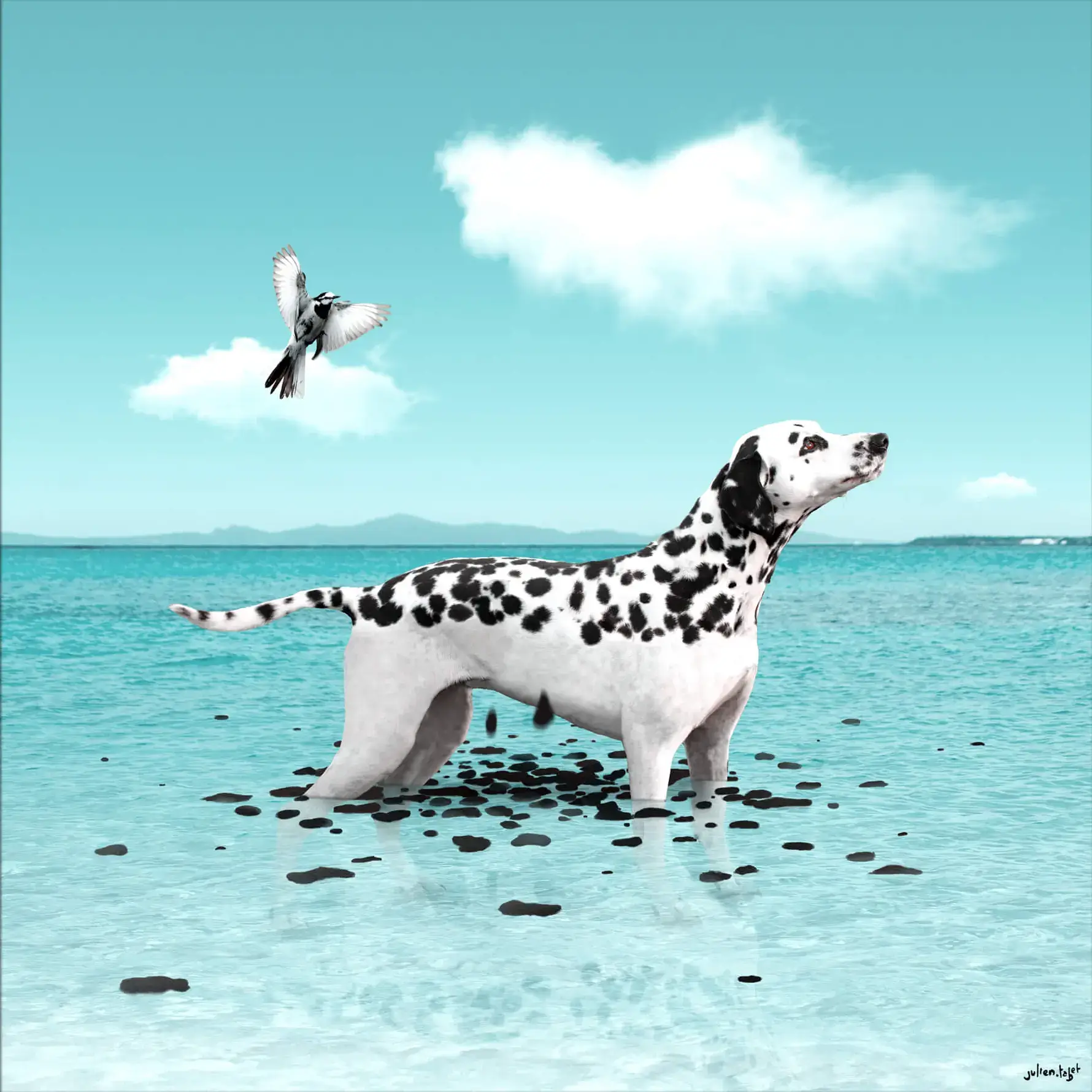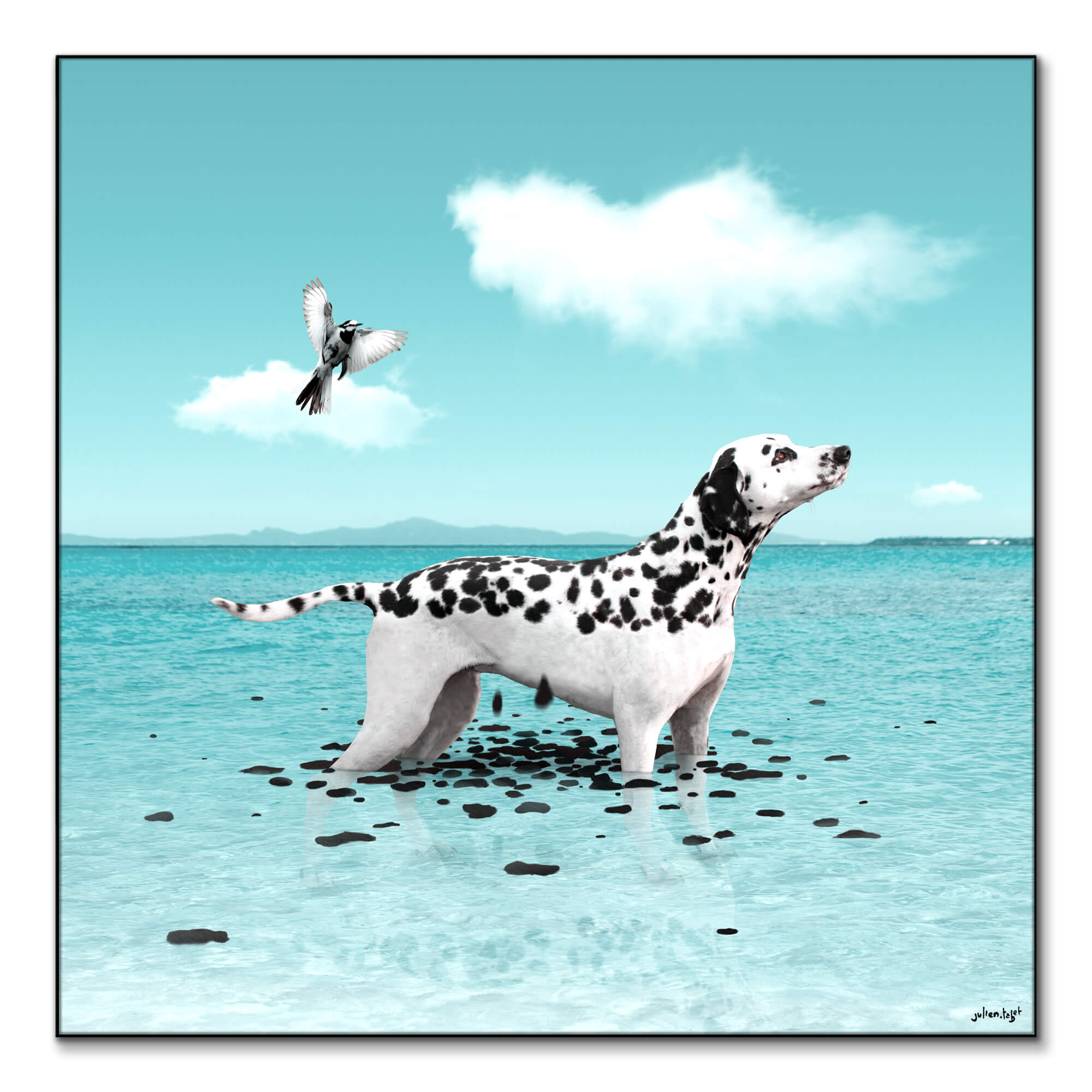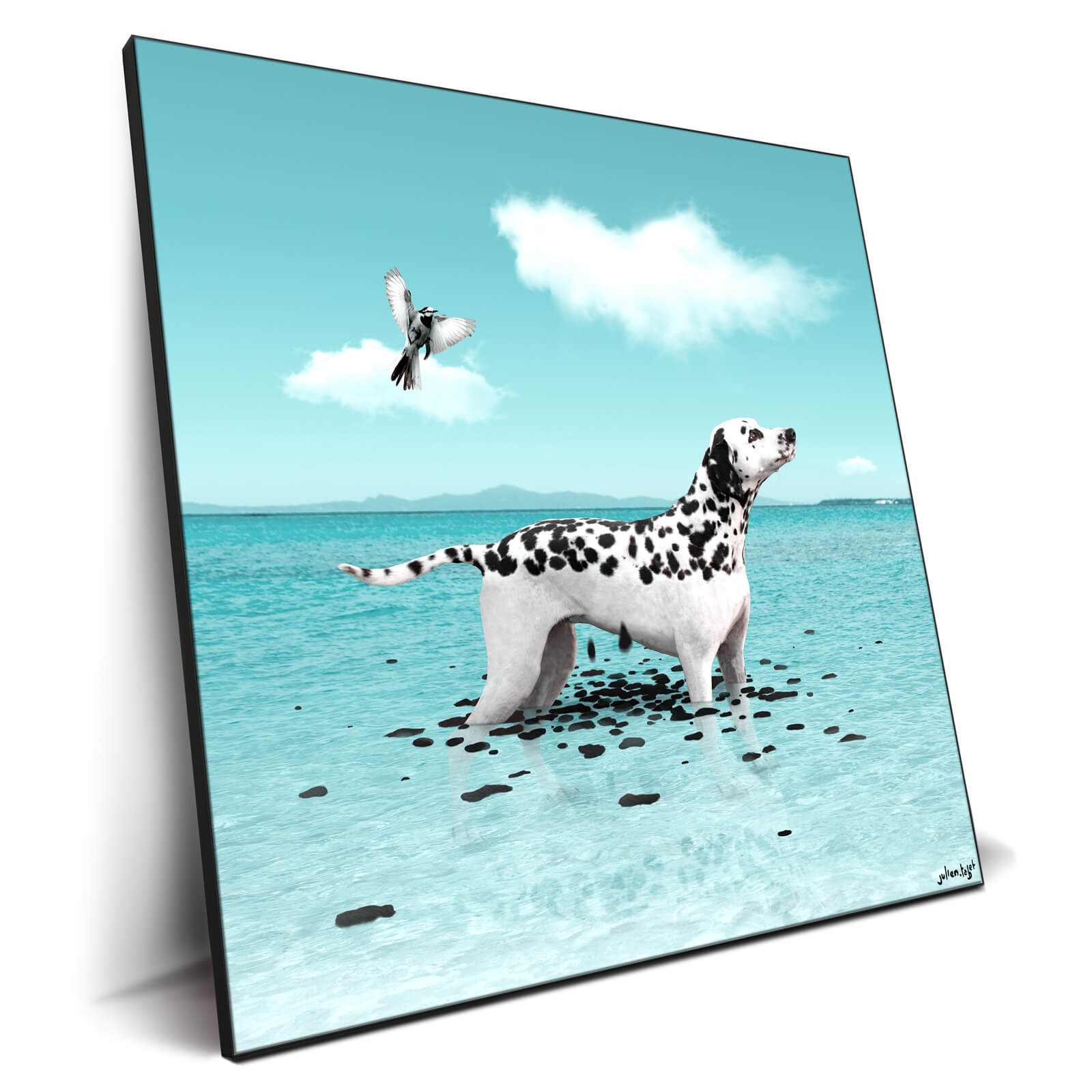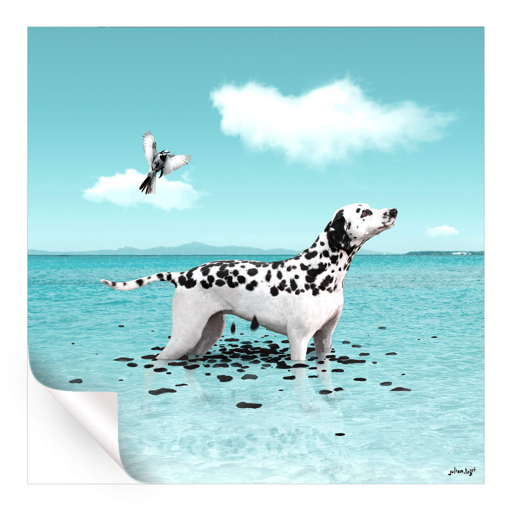 Against the canvas of a cerulean sea, a Dalmatian stands, its spots whimsically escaping to become the pebbles beneath the shallow waters. A bird, mirroring the dog’s spots in its spread of feathers, takes flight above, enhancing the scene’s airy playfulness.