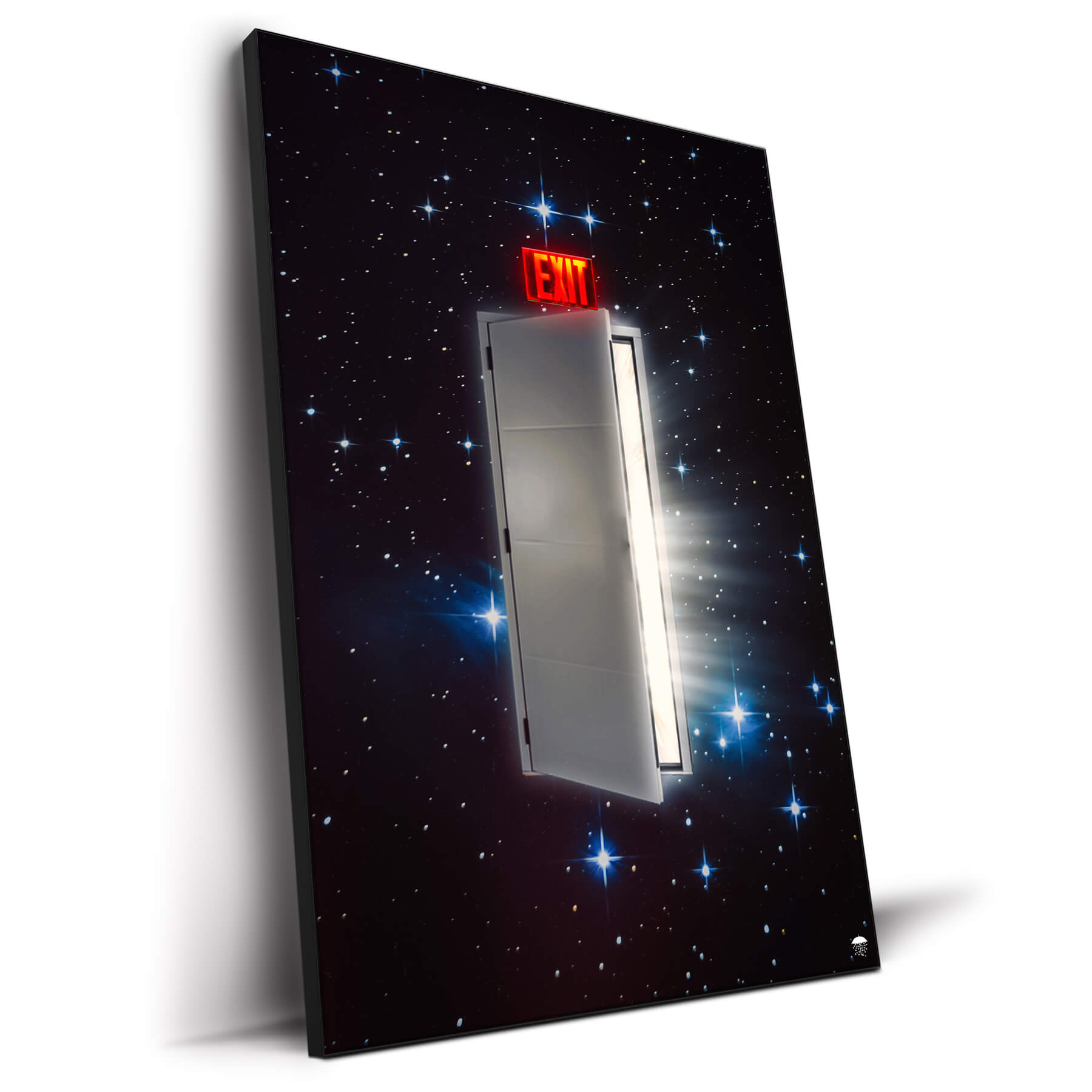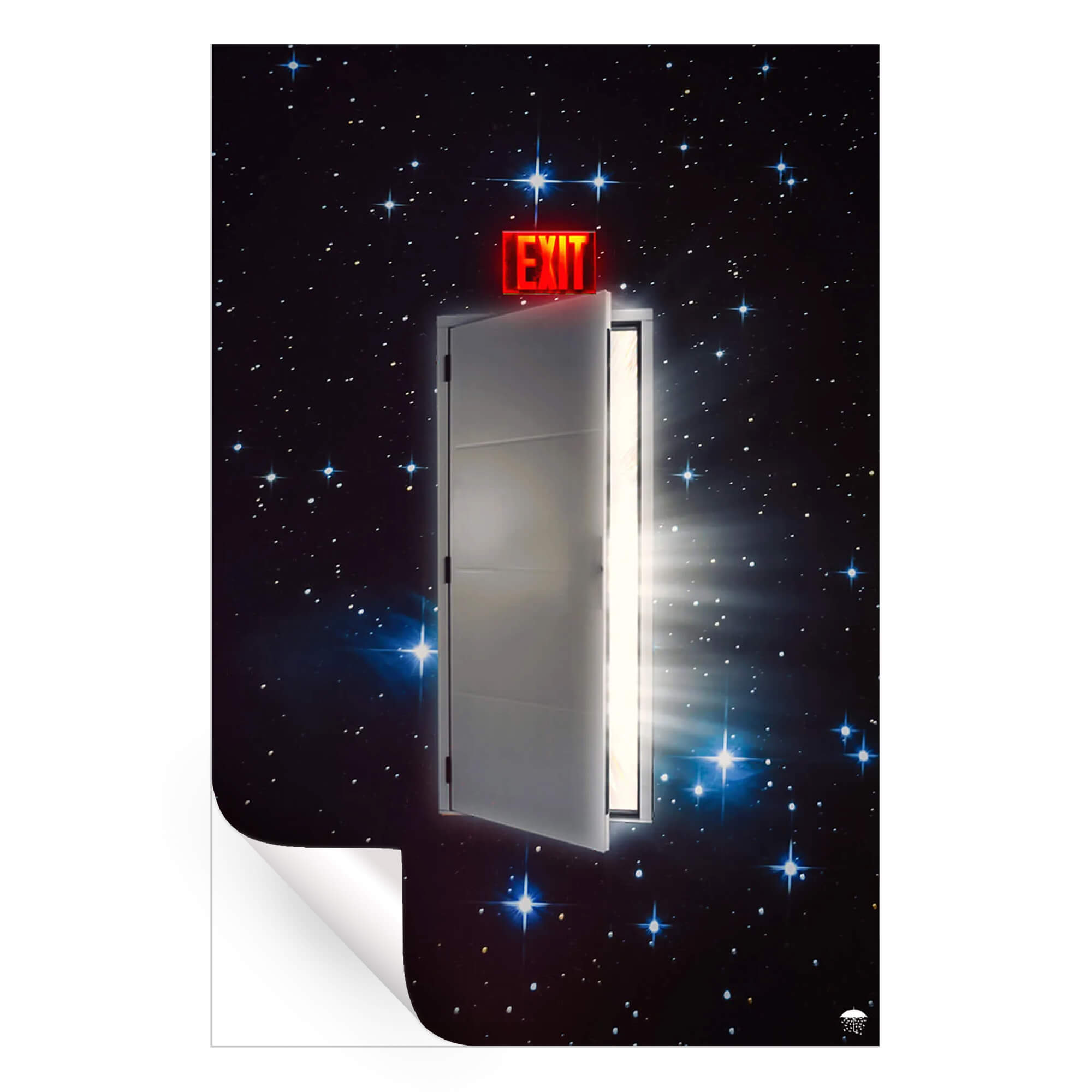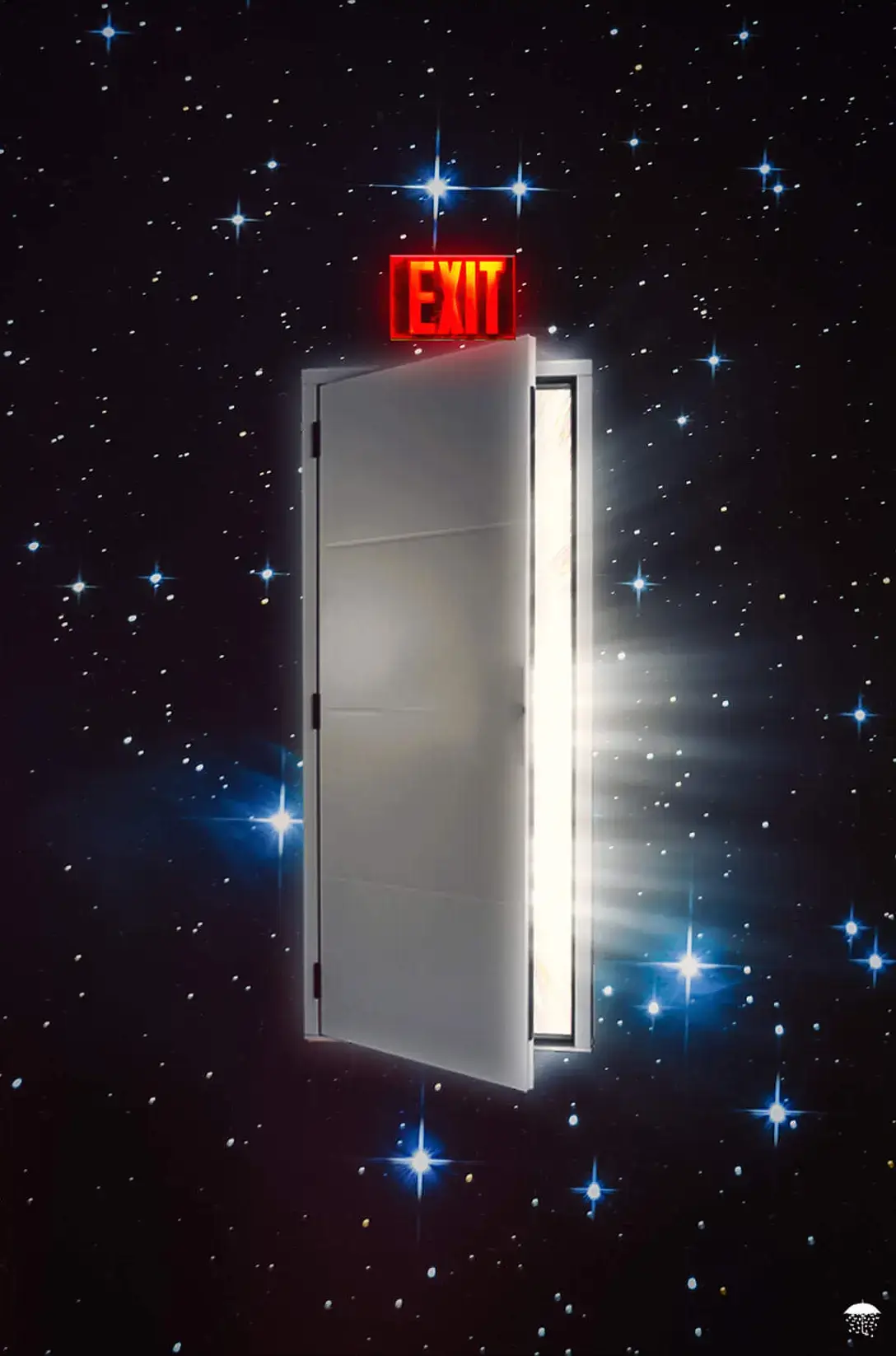 A door stands ajar, spilling light into the vastness of space where stars twinkle against the dark cosmos. Above the door, a red “EXIT” sign glows, acting as a threshold between dimensions.