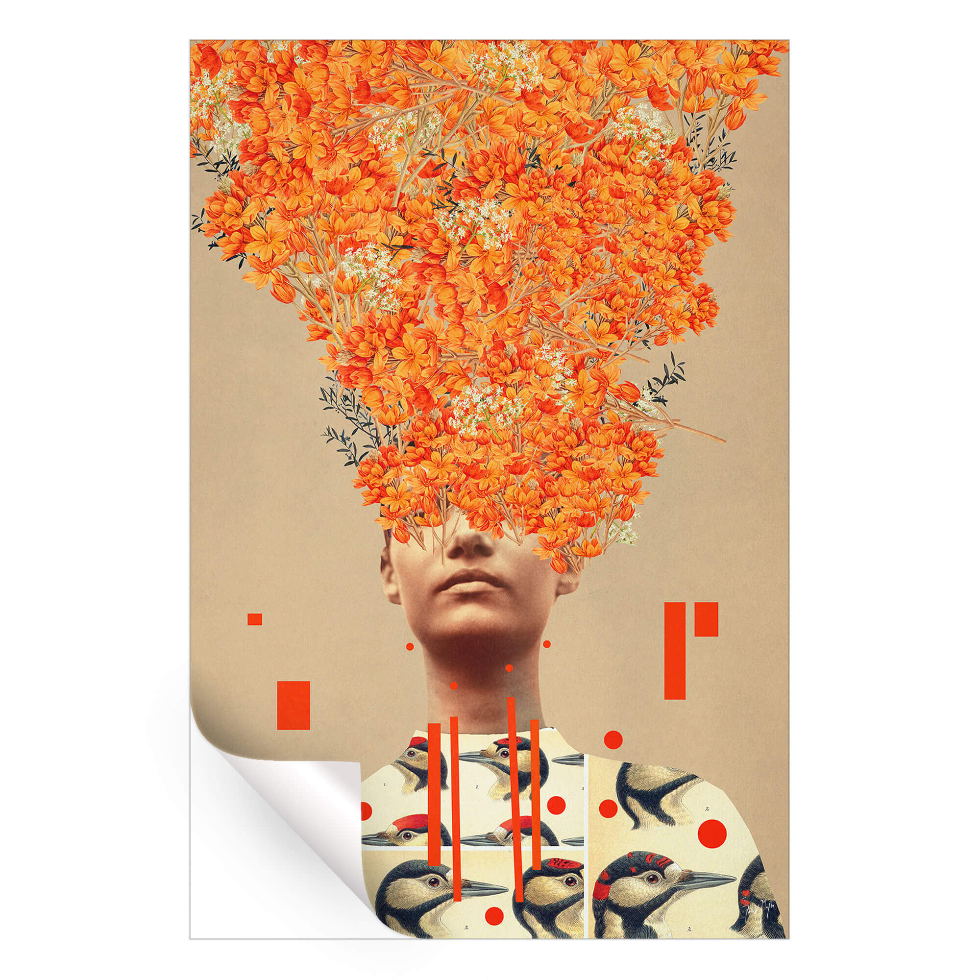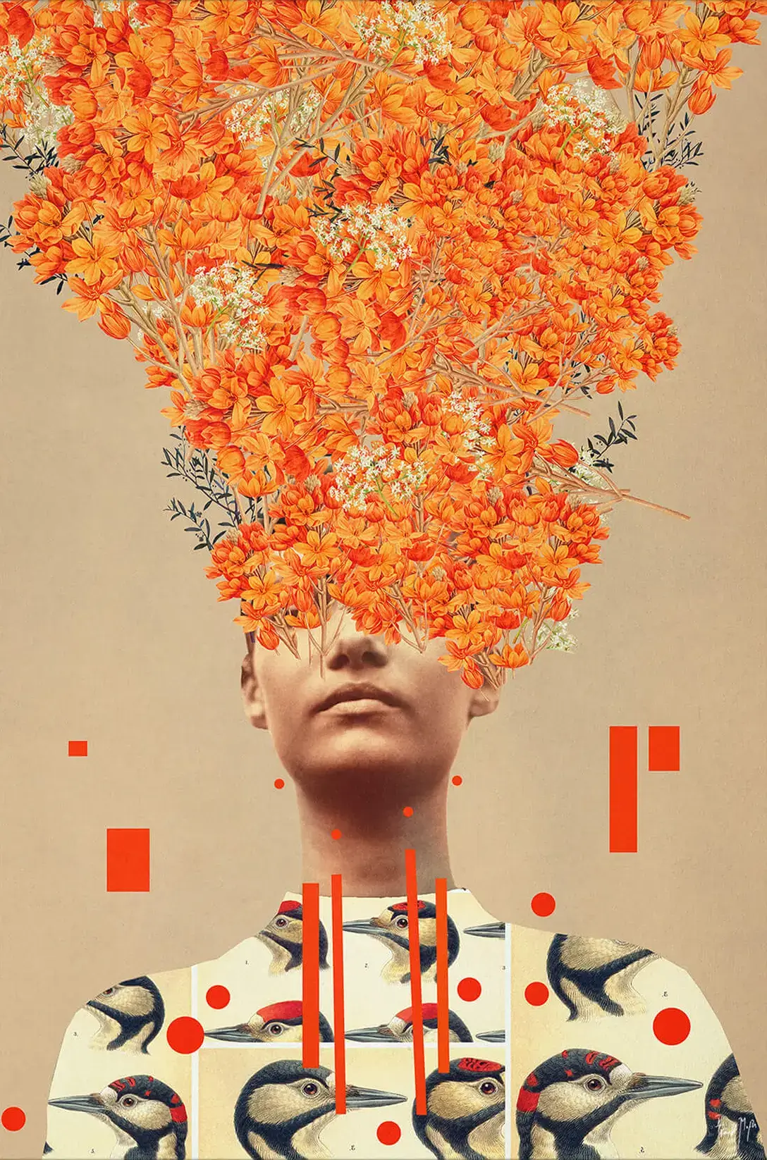 Orange flowers burst upward like a flame of thought while small red blocks drip and scatter across the figure’s patterned shirt of woodpeckers. Bird Flight In Autumn fuses vintage portraiture with bright fall botanicals, creating a calm yet euphoric scene that glows in warm orange tones. The neutral background lets the floral plume steal focus, and the scattered geometric dots give the artwork a playful digital twist. Subtle shadows on the neck and collarbone ground the surreal bloom, keeping the composition balanced. Every tiny bird on the shirt mirrors the upward motion, guiding the eye from torso to sky. Soft textures in the petals contrast with the flat color fields, enriching depth. The vertical layout elongates the plume, making the print perfect for tall walls.
