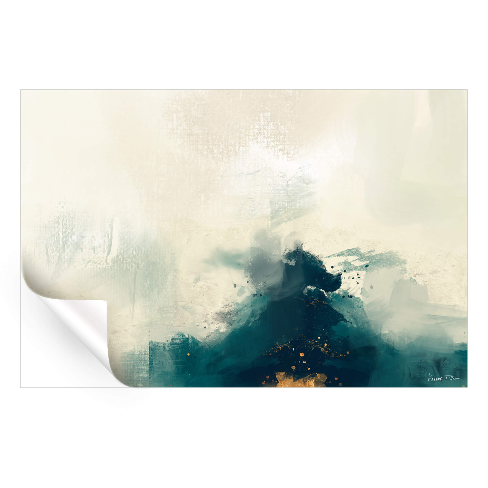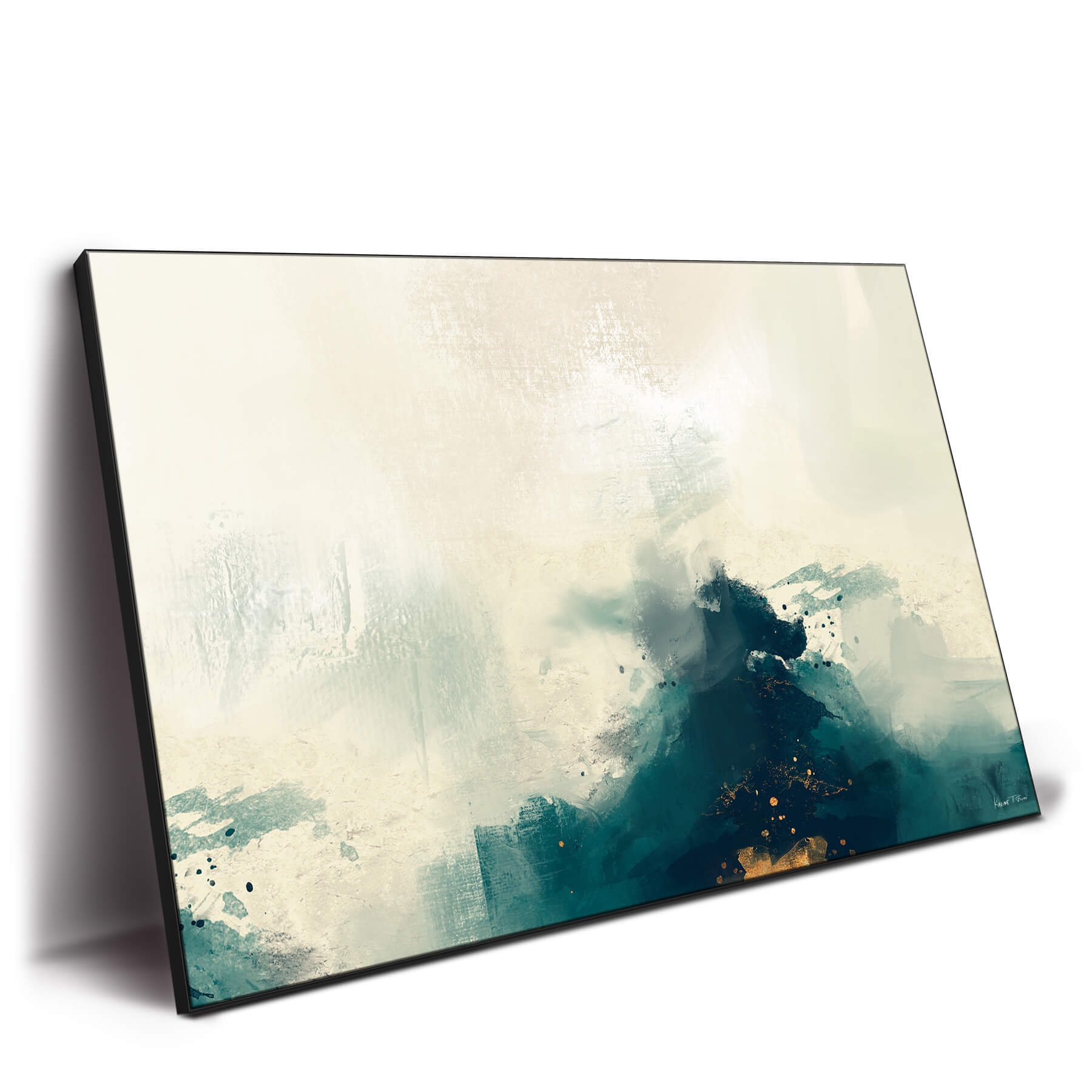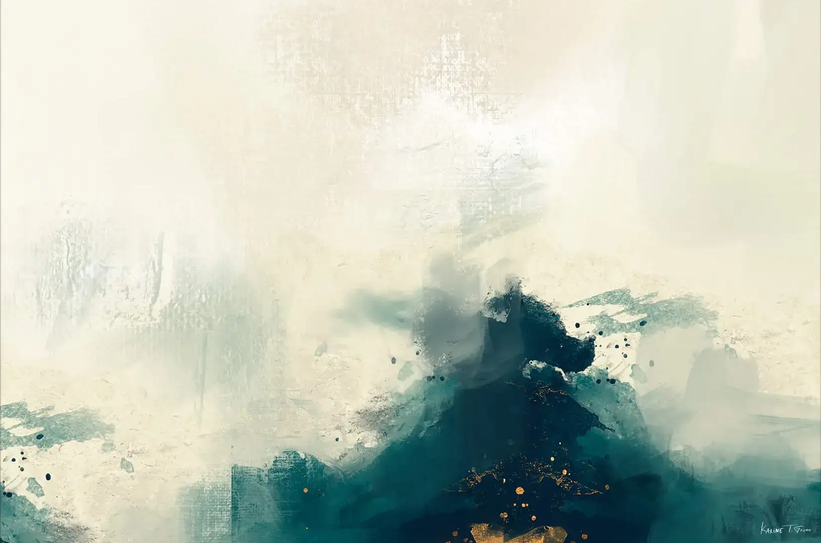 Misty veils of muted white and gray are disrupted by a tumultuous undercurrent of deep teal and black. Flecks of gold are caught in the fray, scattered like precious moments. The textures speak of nature’s untamed moments, each mark contributing to a sense of chaotic beauty.