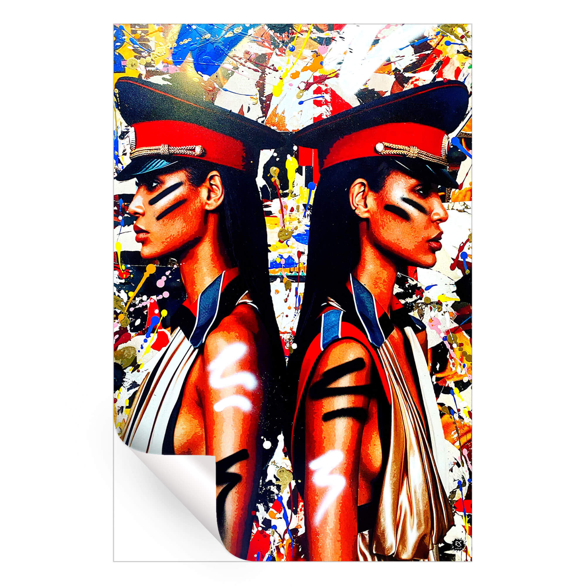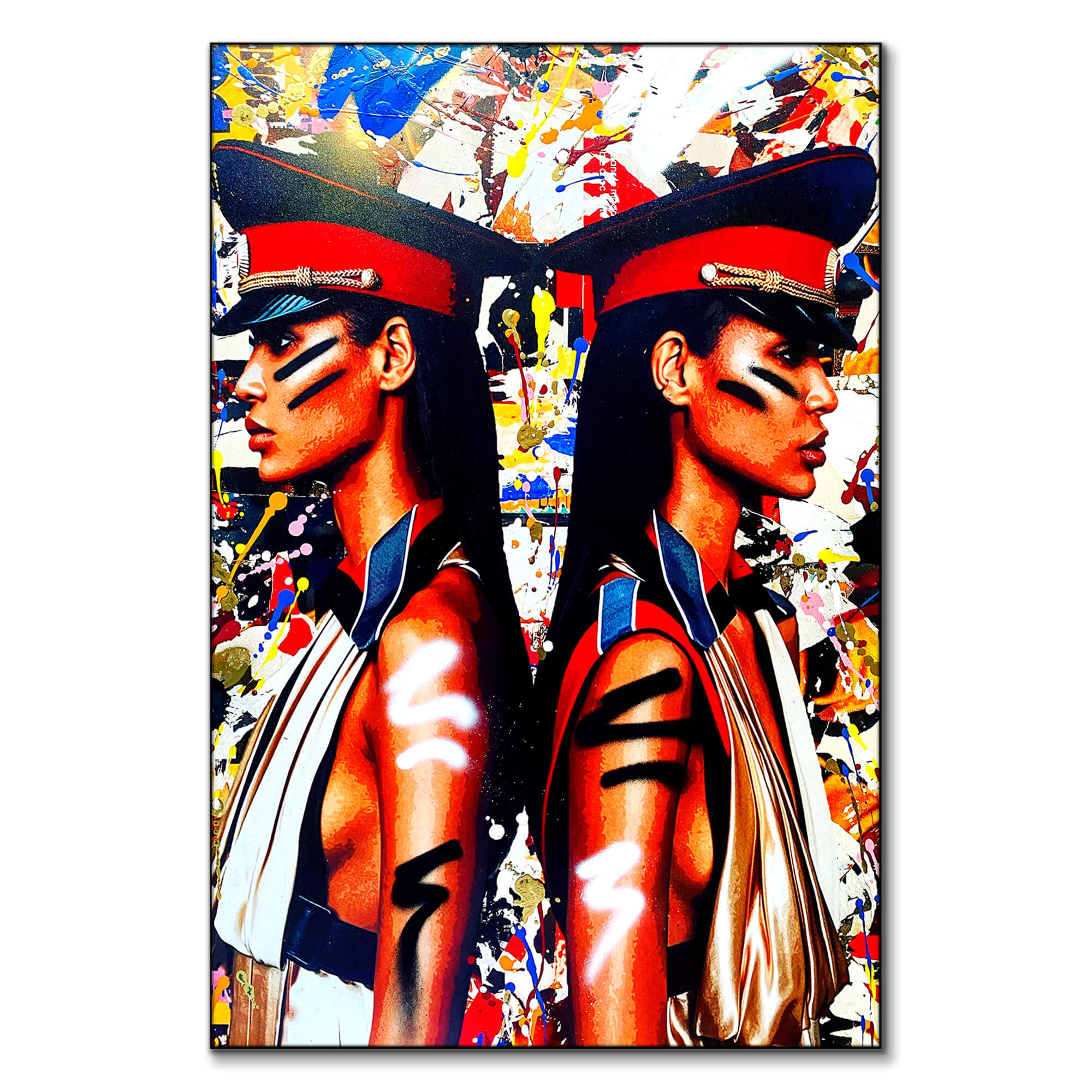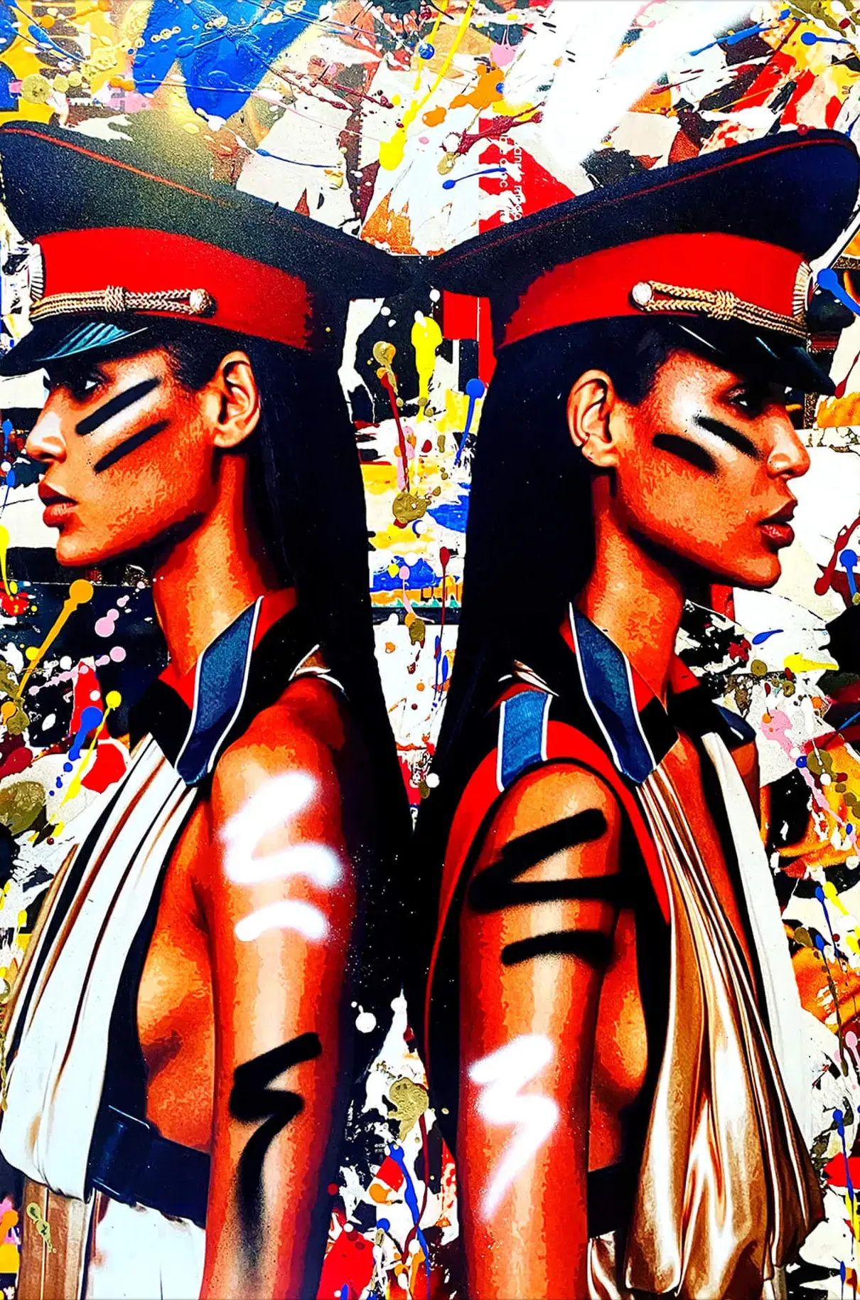 This artwork presents a striking depiction of twin models against a dynamic backdrop, encapsulating the fusion of high fashion with the raw edge of graffiti art. The models’ sharp features and bold makeup are accentuated by vibrant splatters and strokes, portraying a powerful and confident vision of contemporary style.