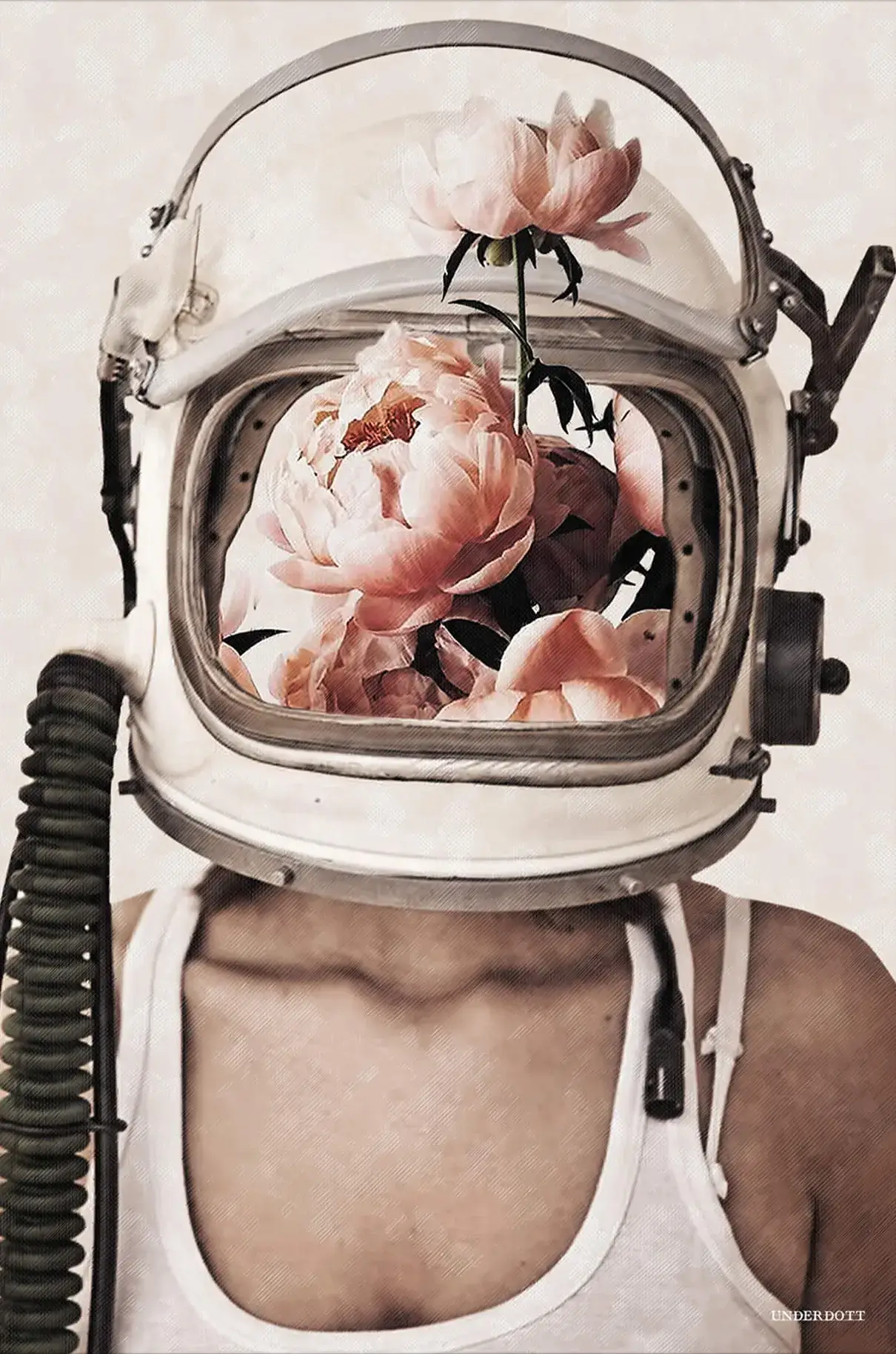 Delicate pink peonies fill the helmet of an astronaut, obscuring the wearer’s face inside. Details and technical features, such as the visor, clasps, and breathing apparatus, are set against a subtle textured background.