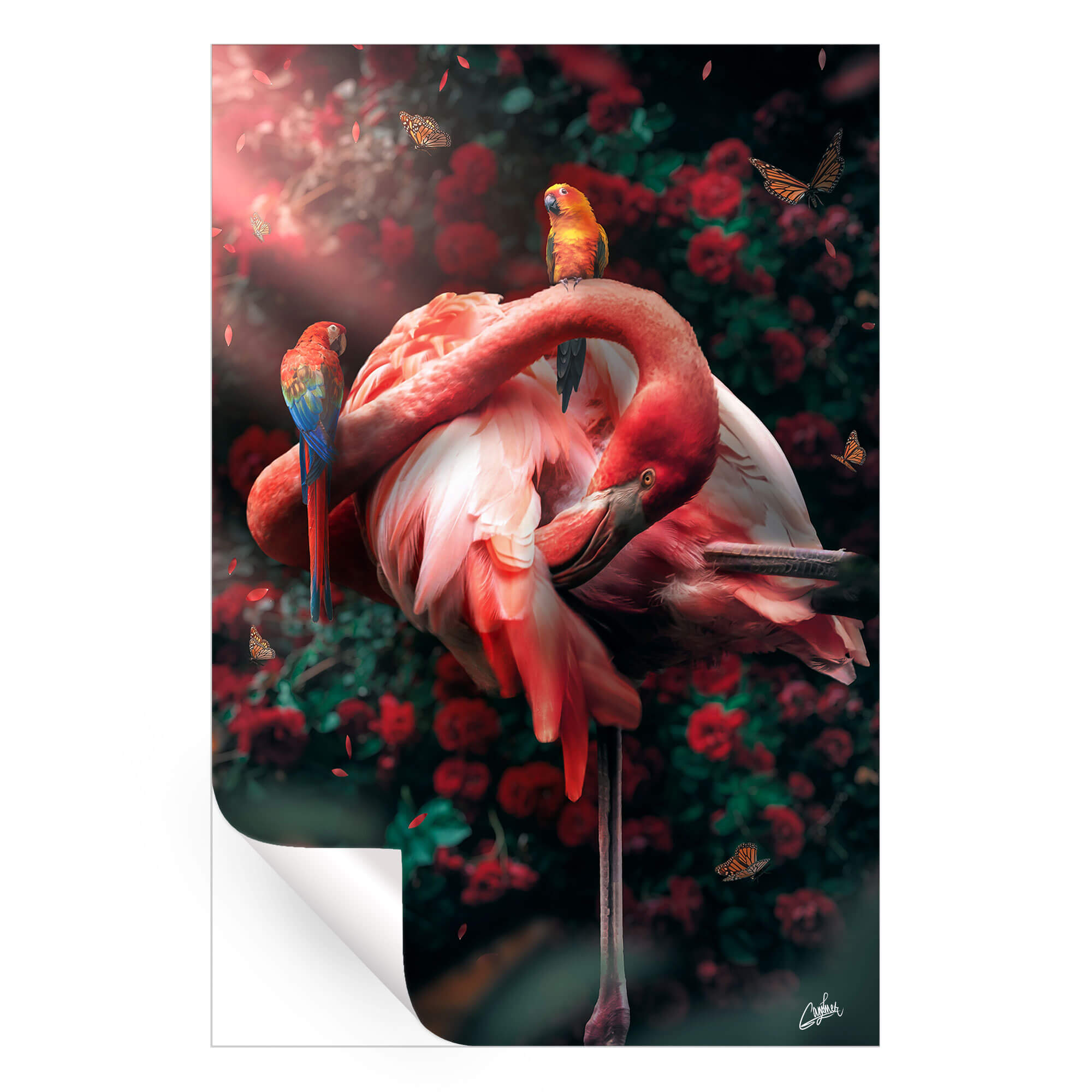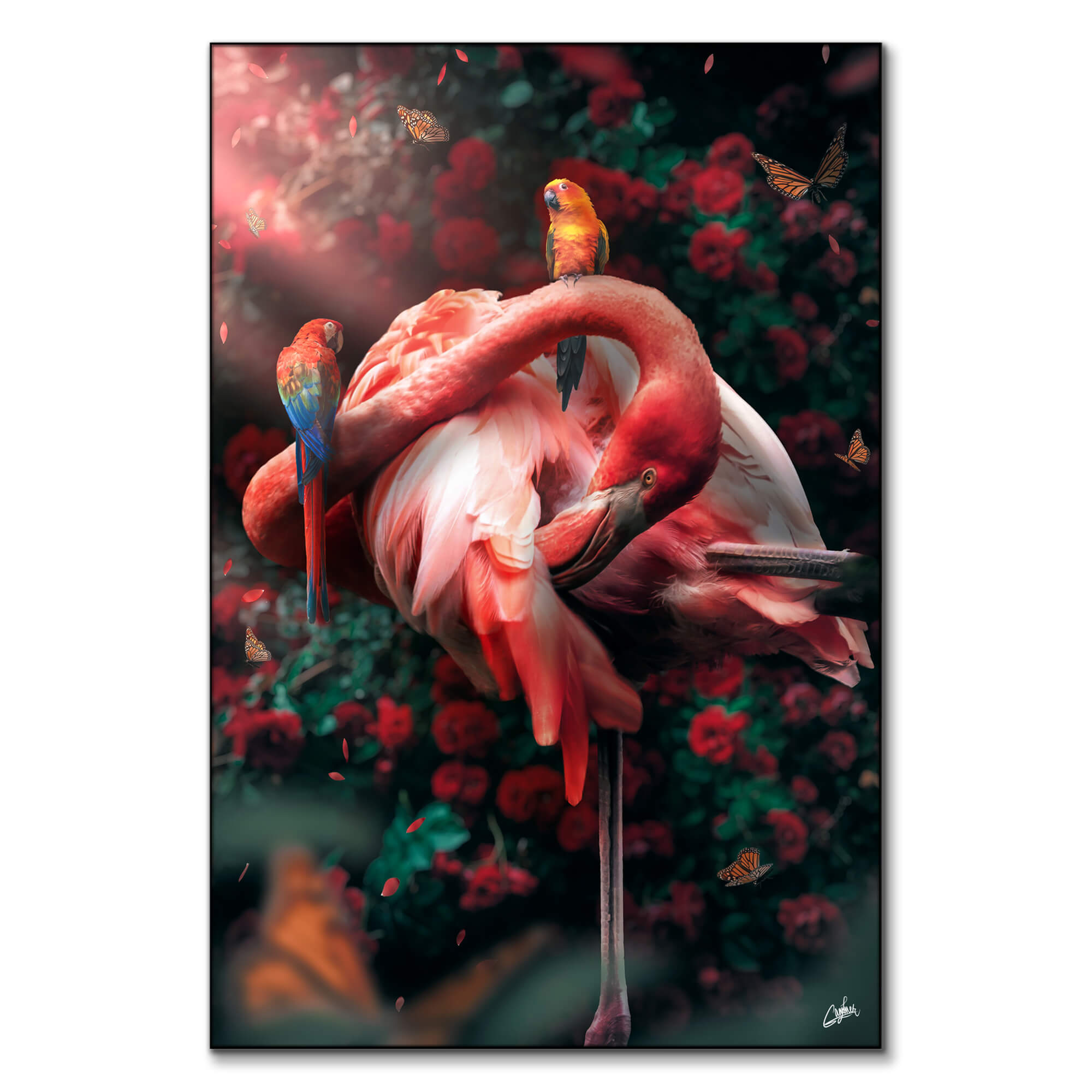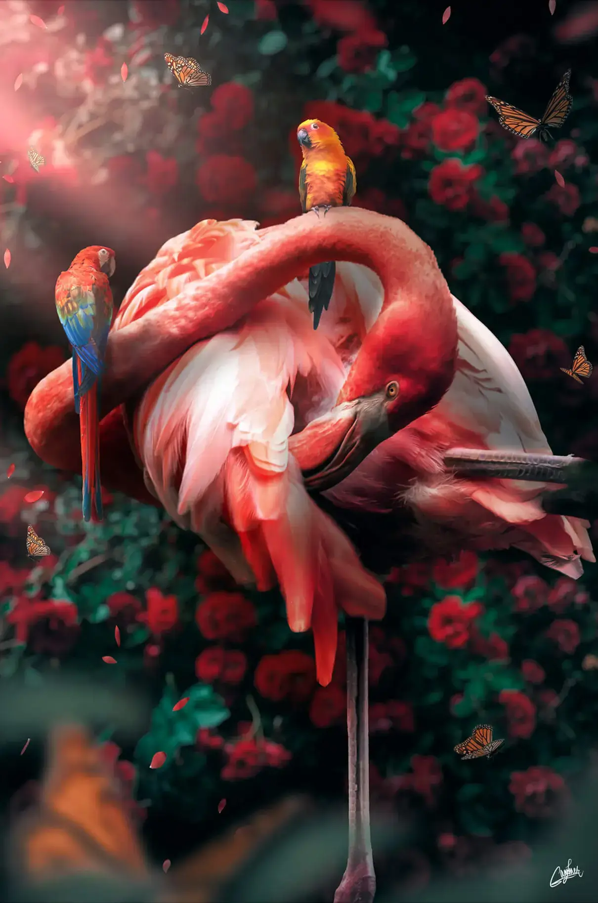 Amidst a floral backdrop rich with roses, Zenja Gammer’s artwork showcases a flamboyant flamingo gracefully preening itself, sharing a tender moment of serenity. Perched atop the flamingo’s vibrant feathers are two companion parrots, adding a splash of vivid blue and yellow to the scene.