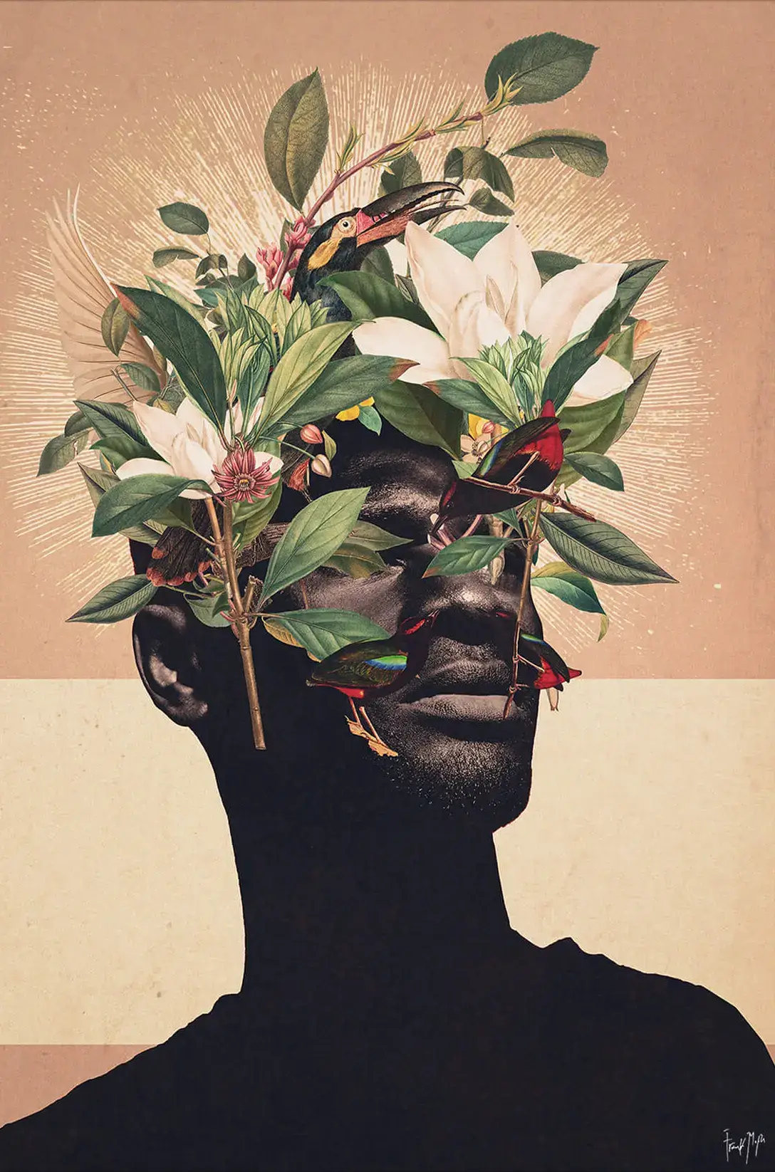A silhouette of a person is overlaid with a vibrant burst of natural elements. Flowers in full bloom, rich greenery, and exotic birds compose a living crown, set against a background that radiates with illustrative rays of light. This artwork juxtaposes the human form with the splendor of the natural world.