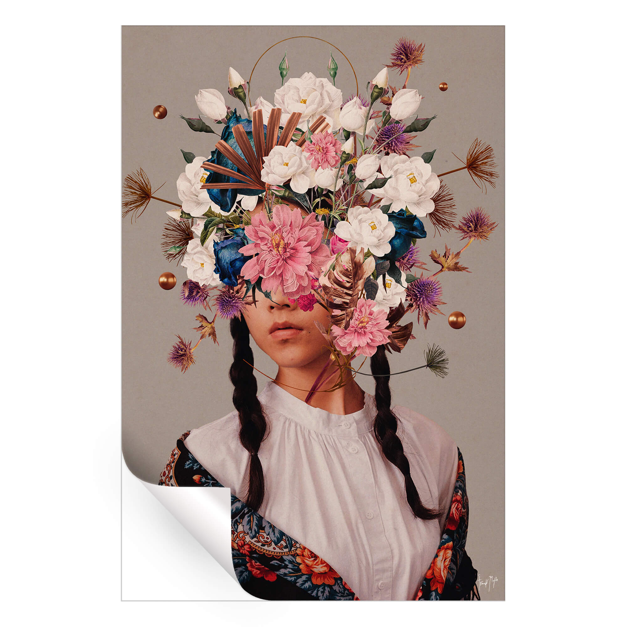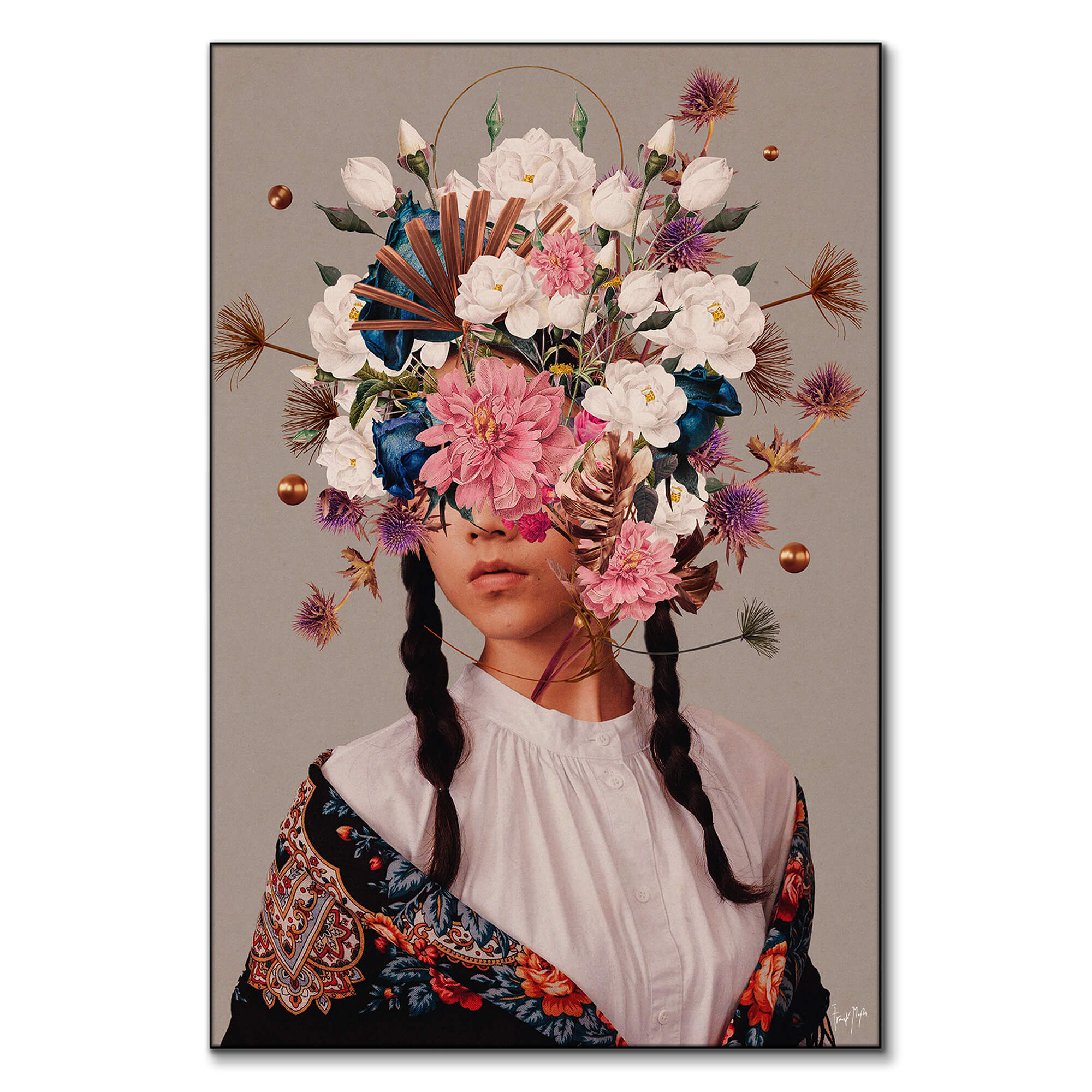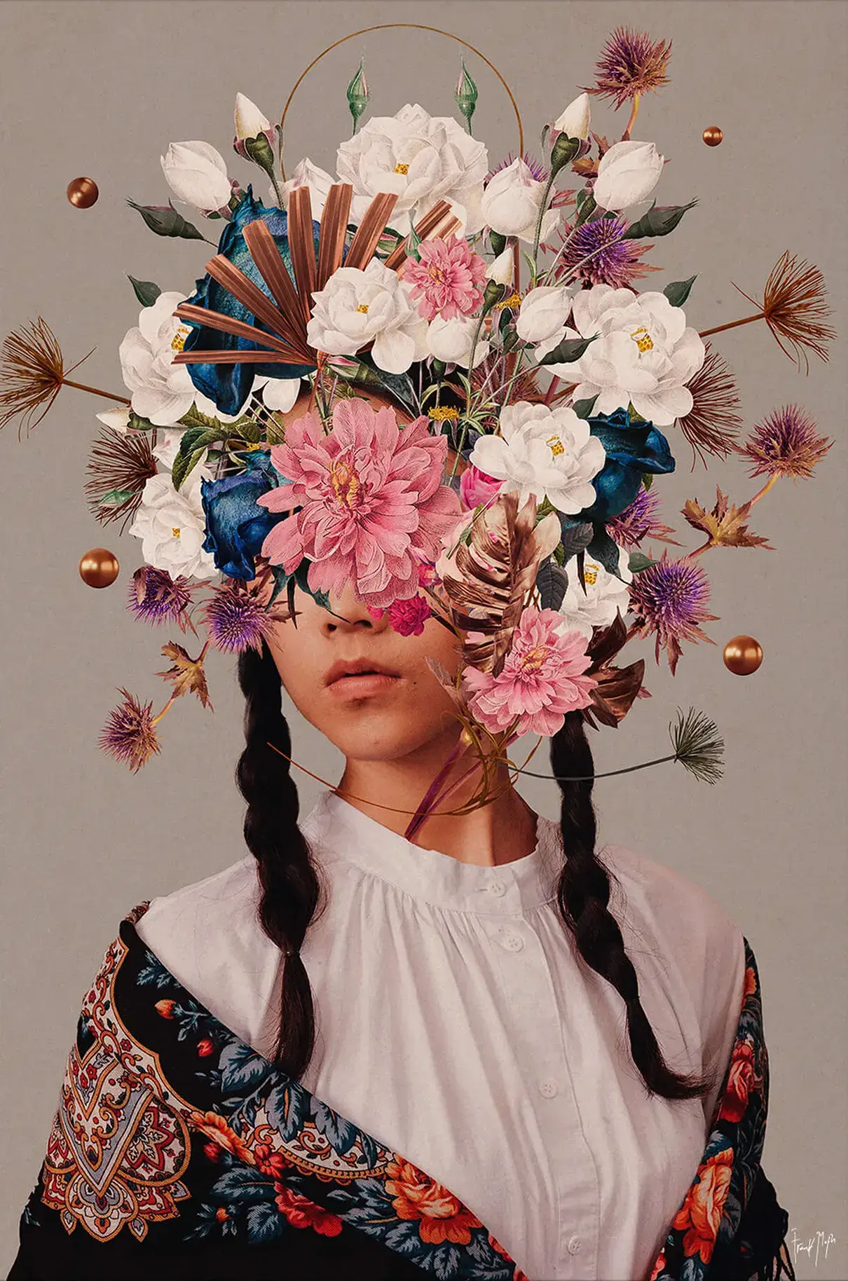 This surreal floral portrait merges tradition and imagination into one captivating image. A woman with braided hair gazes forward, her face transformed into a blooming arrangement of peonies, tulips, and thistles. The palette—muted grays, soft whites, and deep magentas—feels timeless yet bold, while touches of gold add a subtle glow of sophistication.
