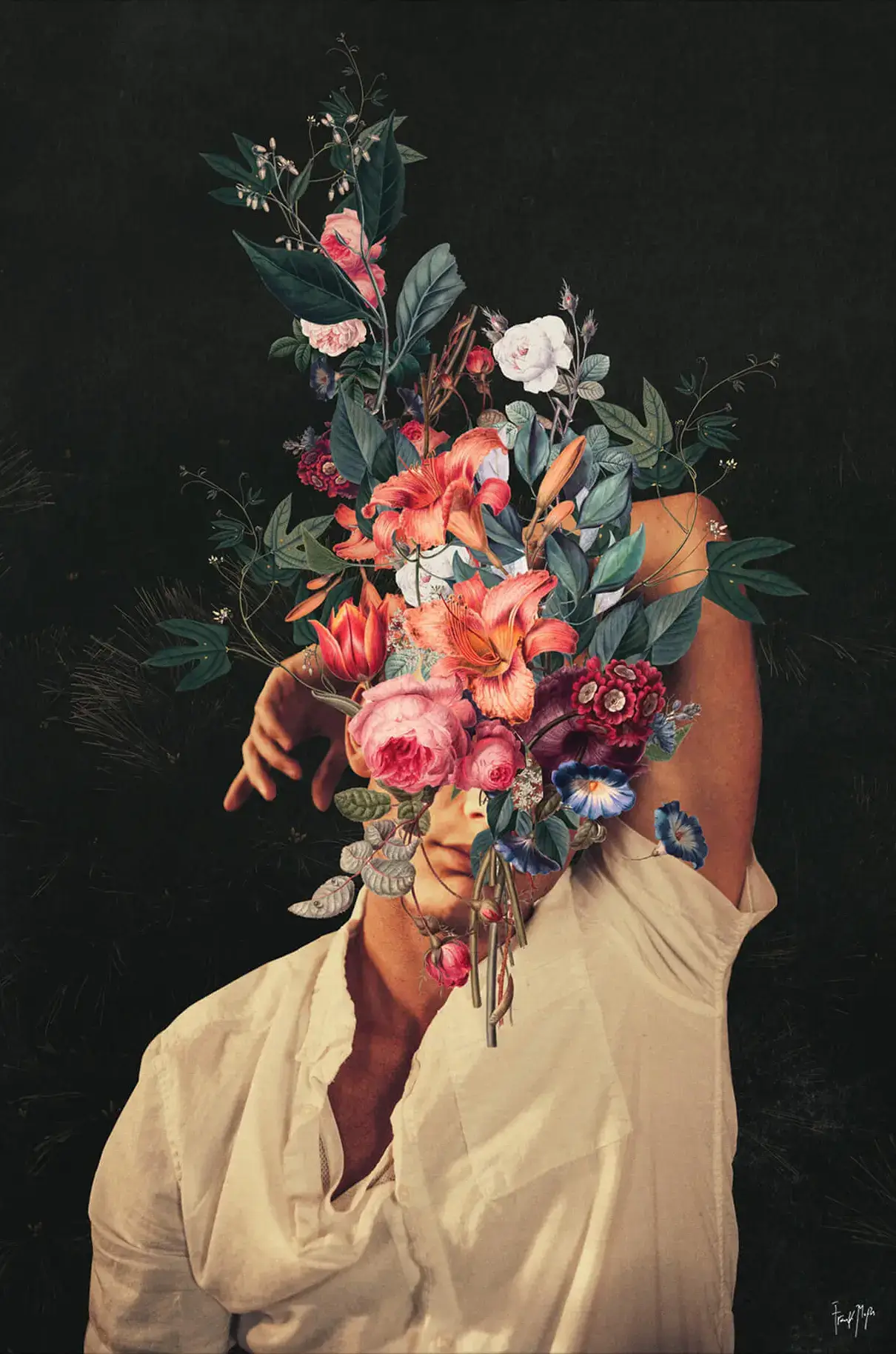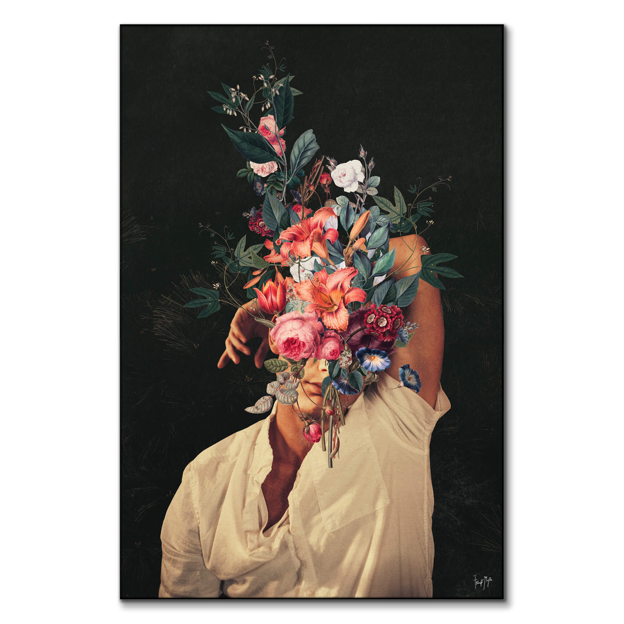 This floral portrait redefines surreal beauty through light, texture, and symbolism. A man’s face blooms into an intricate cascade of vivid florals against a dark, velvety background. The richness of the colors—pinks, corals, and deep greens—contrasts with the softness of his white shirt, creating harmony between emotion and form.