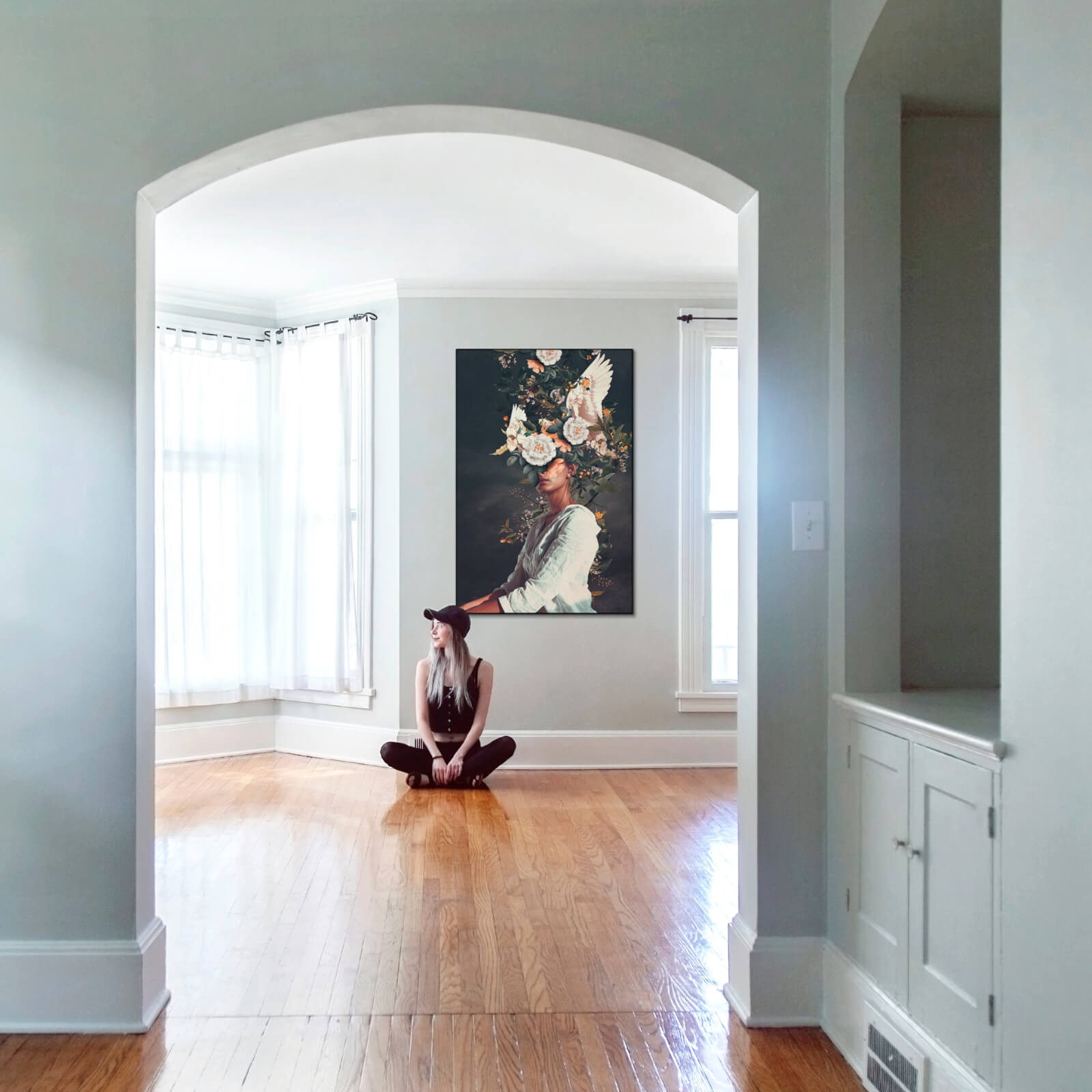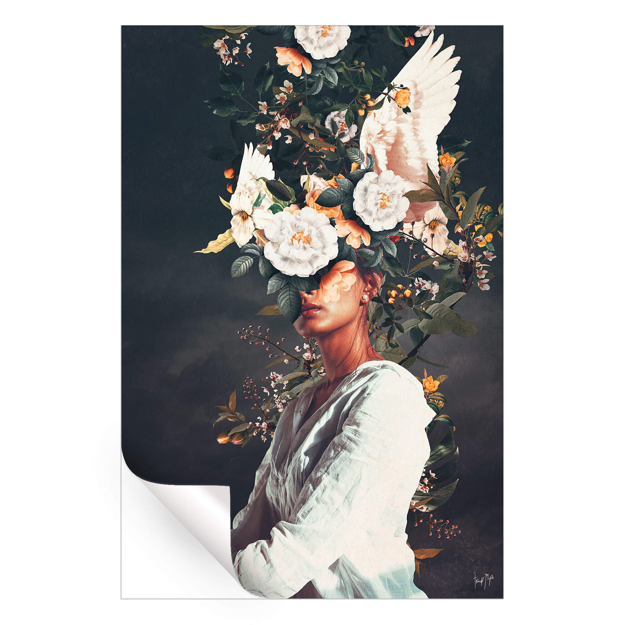 This ethereal collage radiates serenity. A seated figure draped in white appears lost in thought as white blossoms and doves bloom from her head. The composition merges purity and transcendence, contrasting soft petals with a moody backdrop.