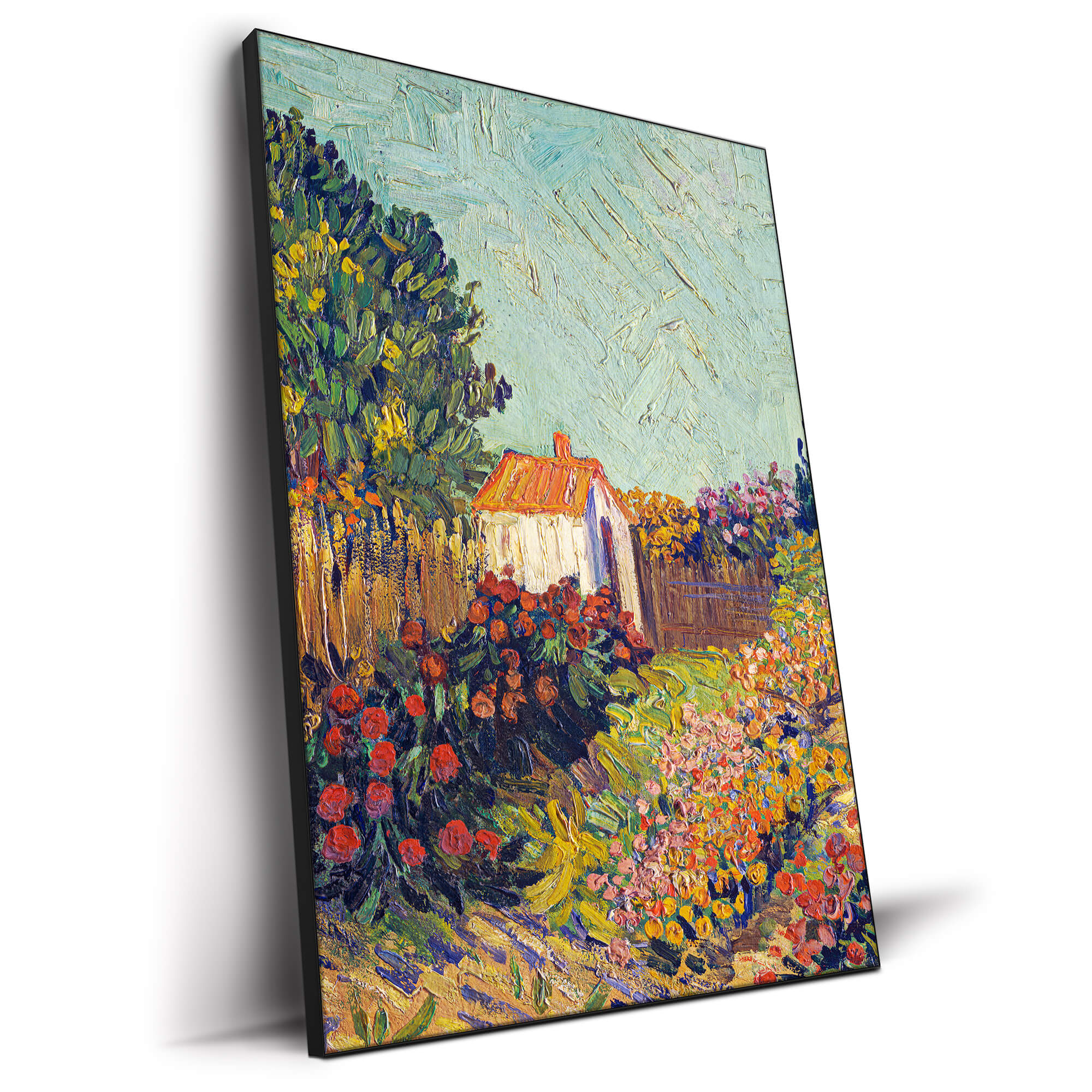 Flower Garden by Vincent Van Gogh fills a wall with a rush of color – rows of ruby, coral, and saffron blooms lead to a tiny cottage under a bright spring sky. Printed on our washable ArtFab fabric and stretched edge-to-edge in a sleek Infinity Frame, this vibrant romantic artwork invites wanderlust and brings cheerful décor energy to any space.
