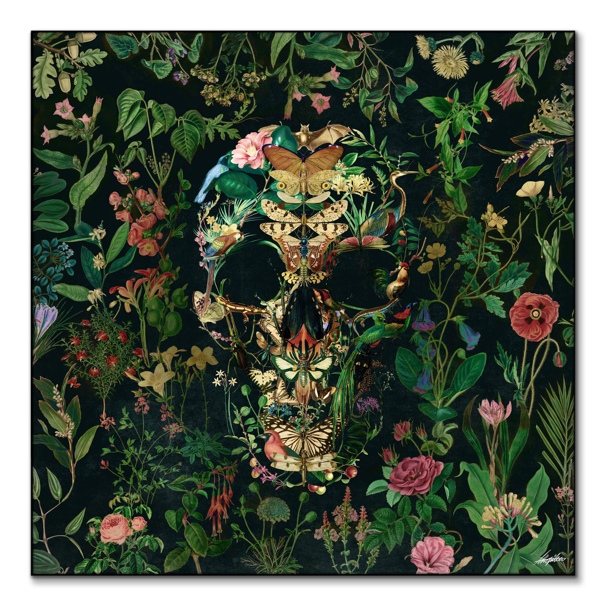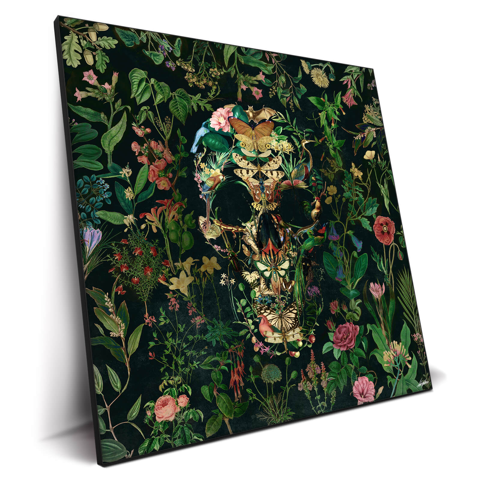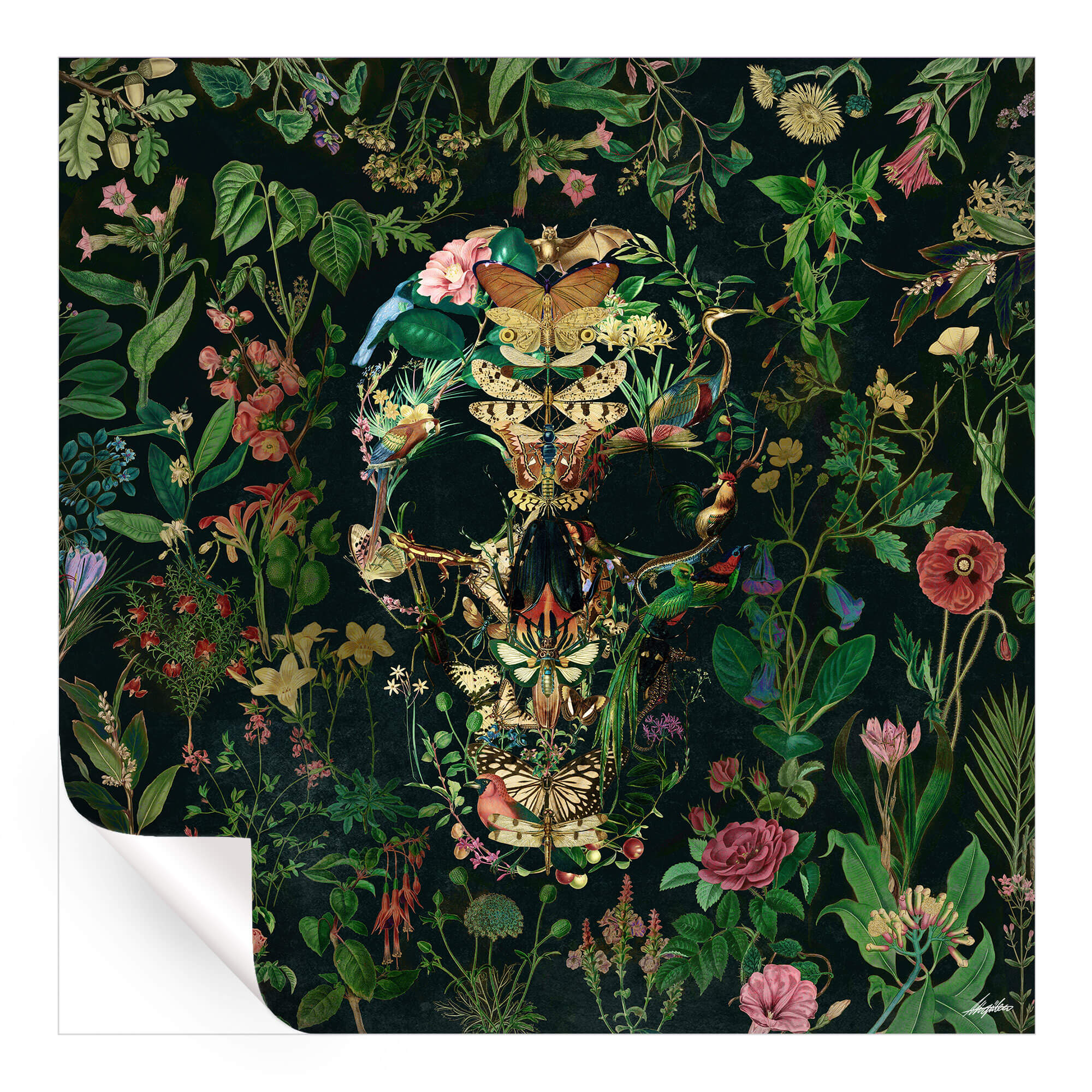 Around this floral skull, a garden thrives, wild and untamed, a testament to beauty born from the dark. Butterflies perch delicately on leaves, and blooms reach out.