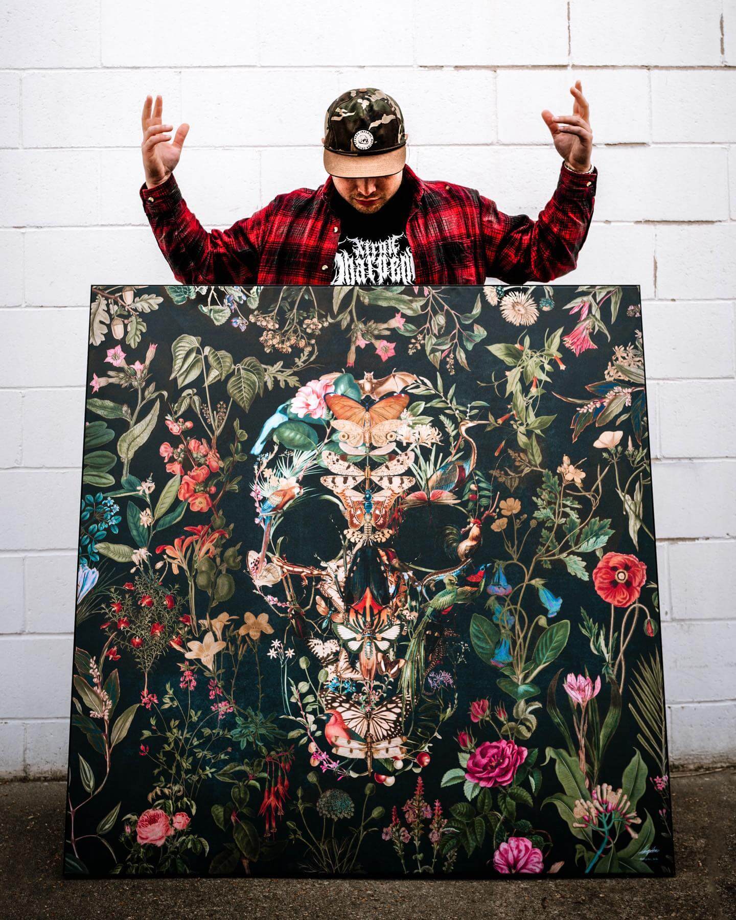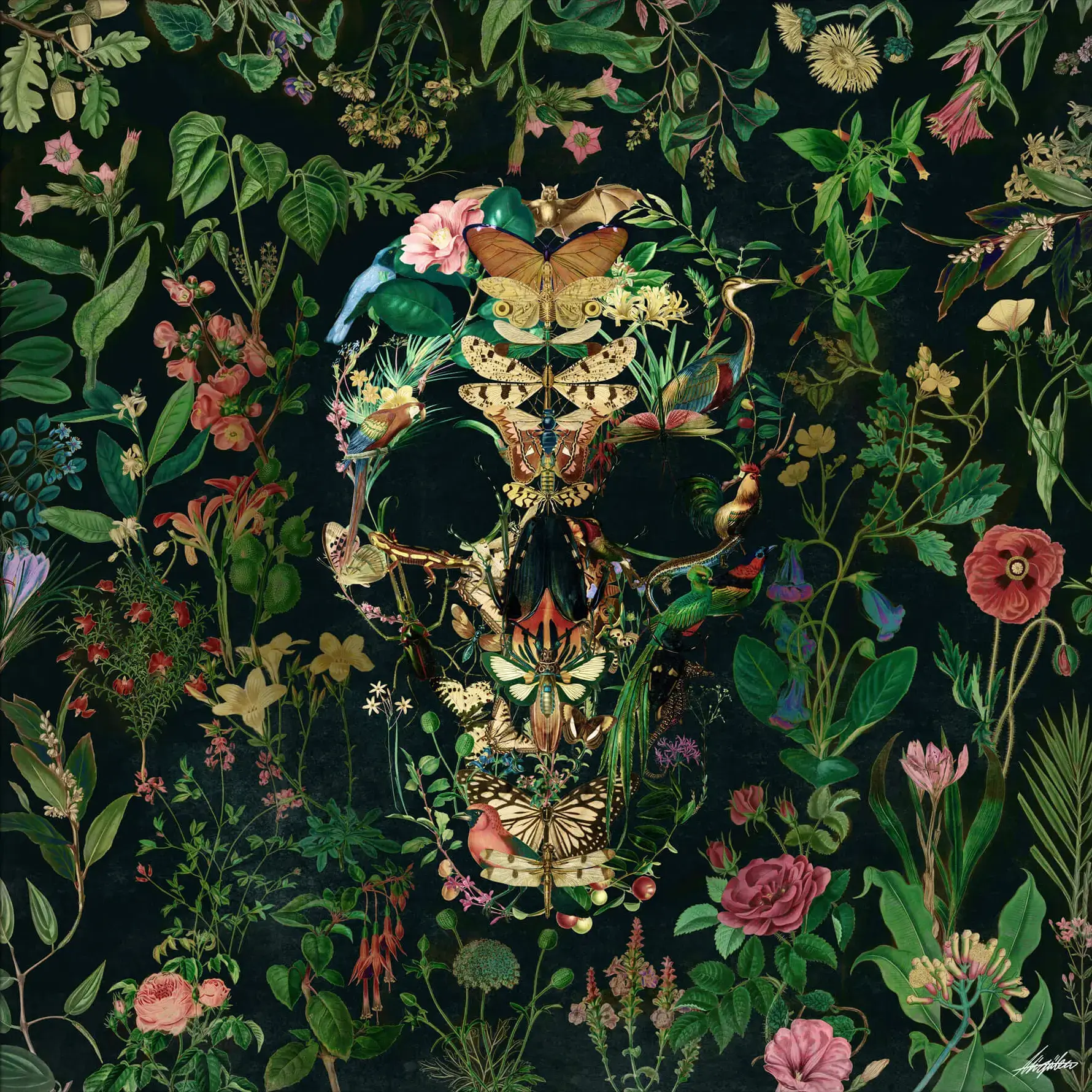 In the embrace of midnight flora, Ali Gulec’s creation blooms—a skull not of bone but of petals and wings, a celebration of life’s cycle.