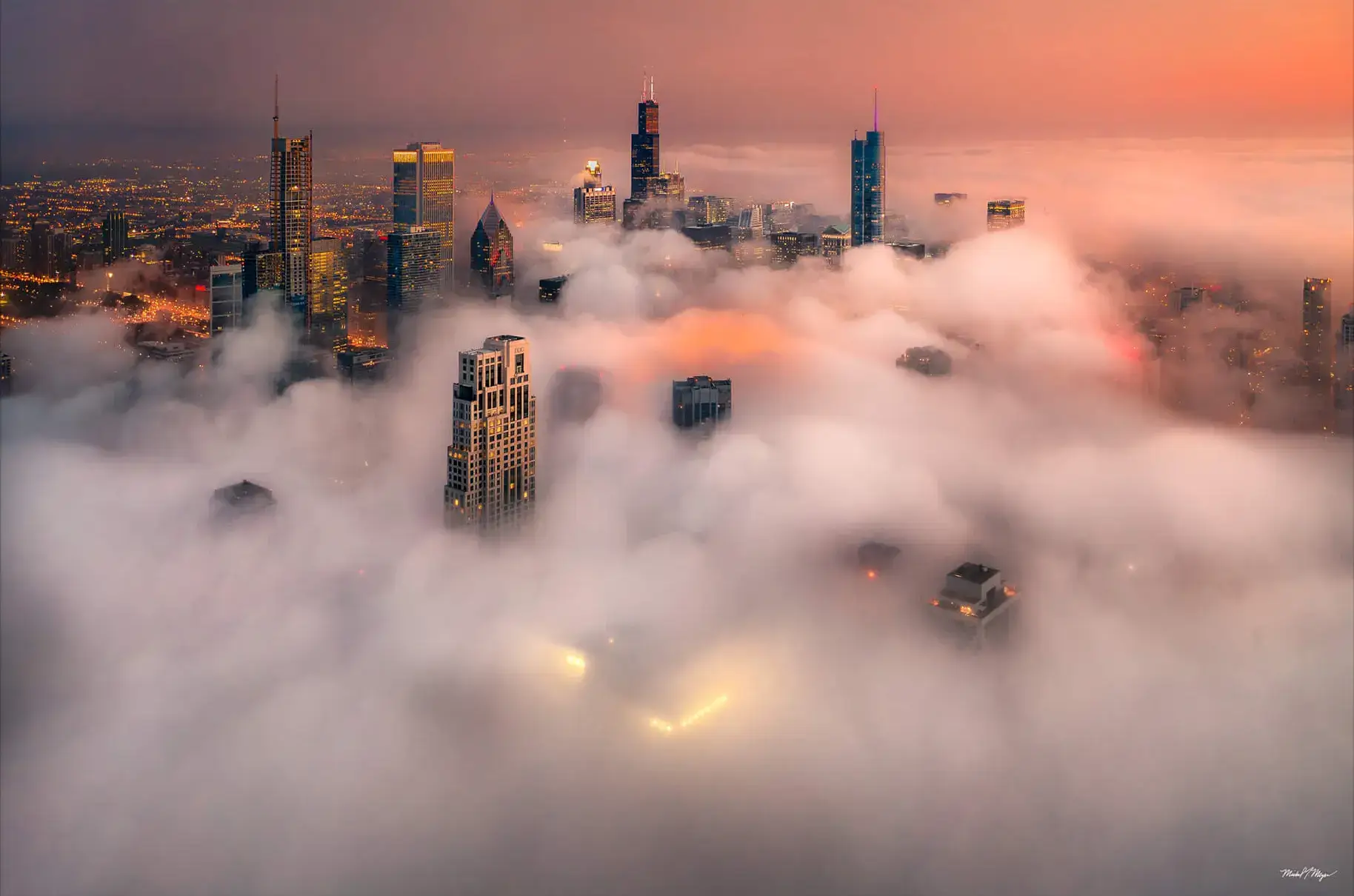 As a dense fog envelopes the city, the Chicago skyline emerges like islands in a cloud-covered sea. The tallest skyscrapers rise above the mist, their lights a warm glow against the cool tones of dawn or dusk.
