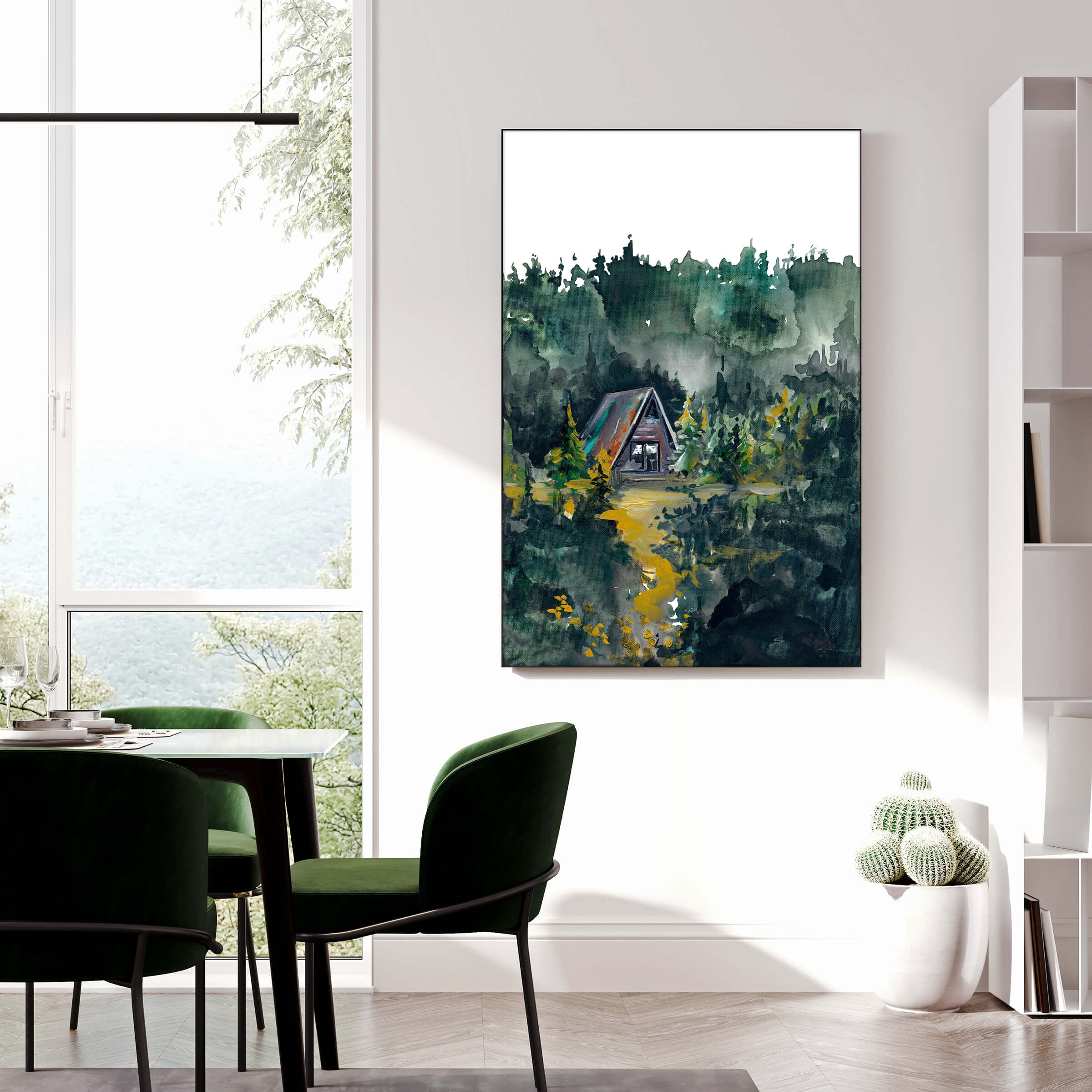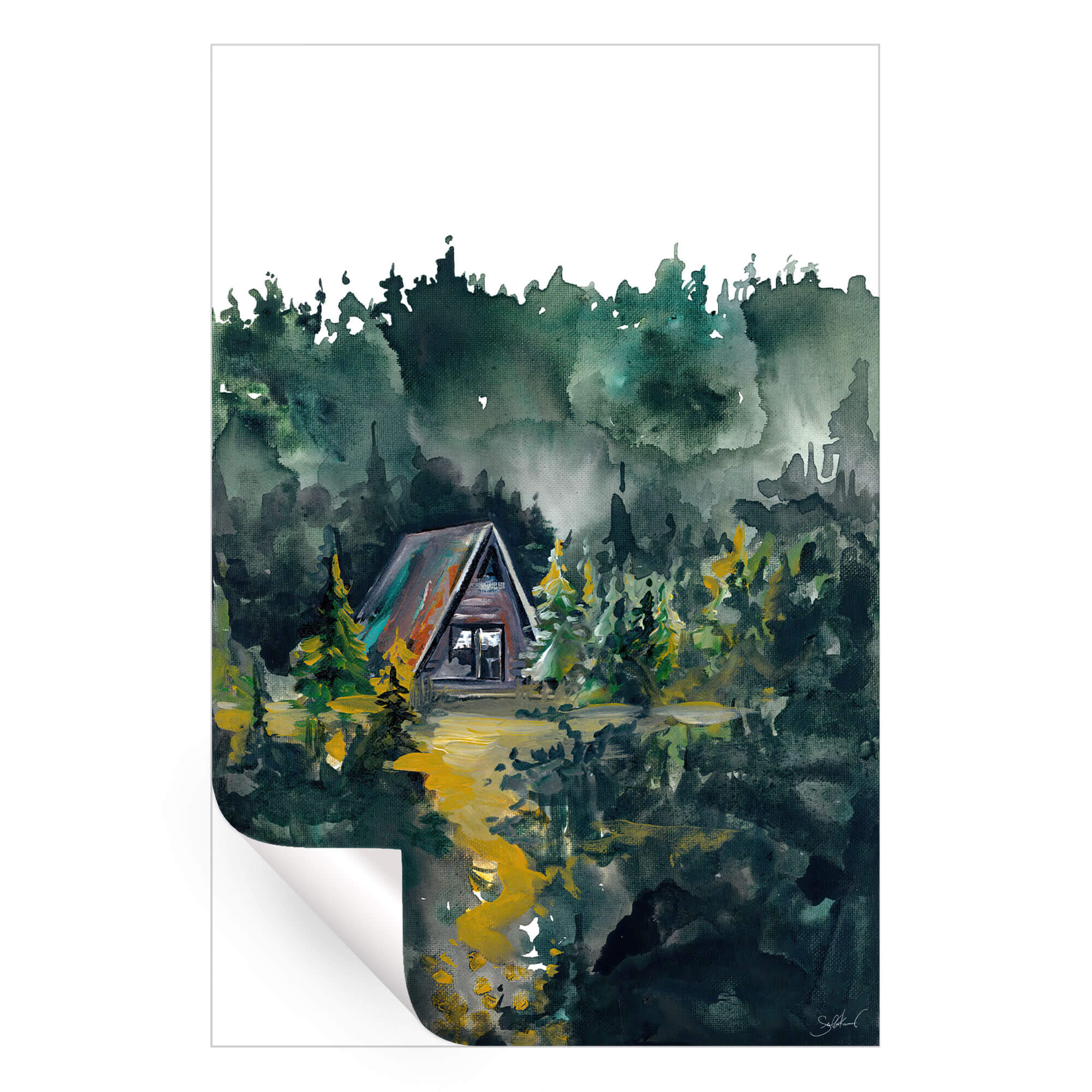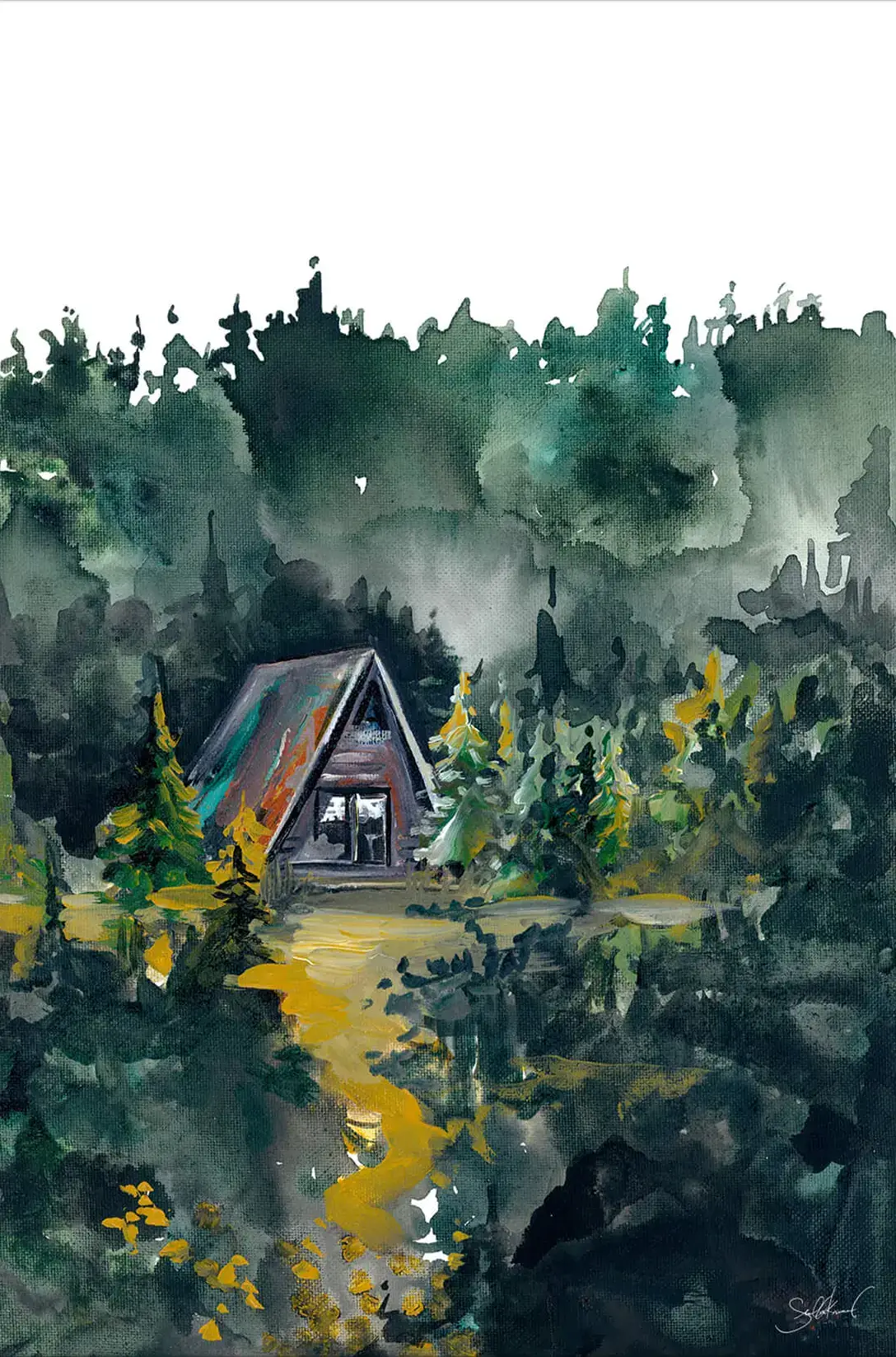 The image depicts a small, A-frame cabin amidst a green landscape with trees. The colors are mostly dark greens and yellows with some hints of orange. The sky and the trees in the background are painted with broad, loose brushstrokes. A yellow path leads to the cabin and is reflected in a body of water in front of it.