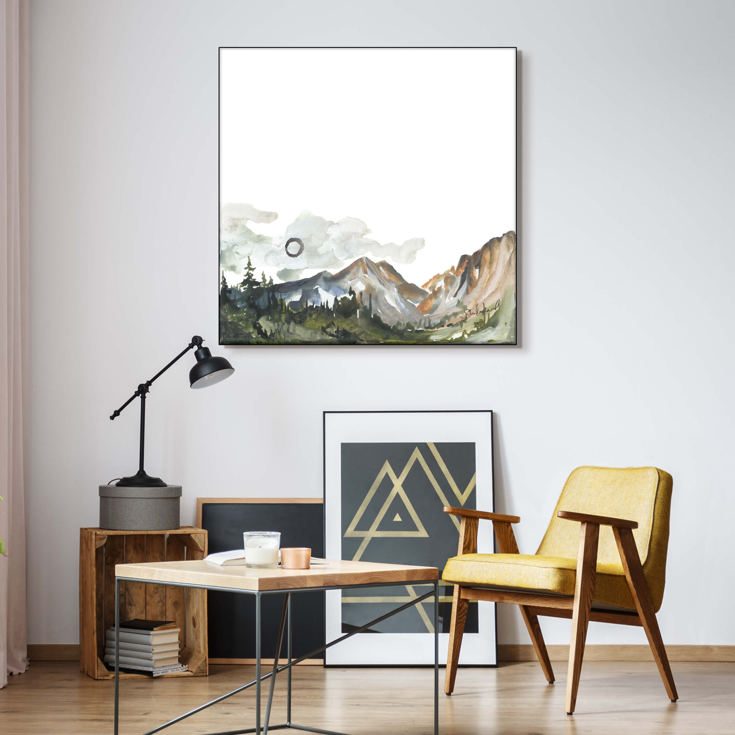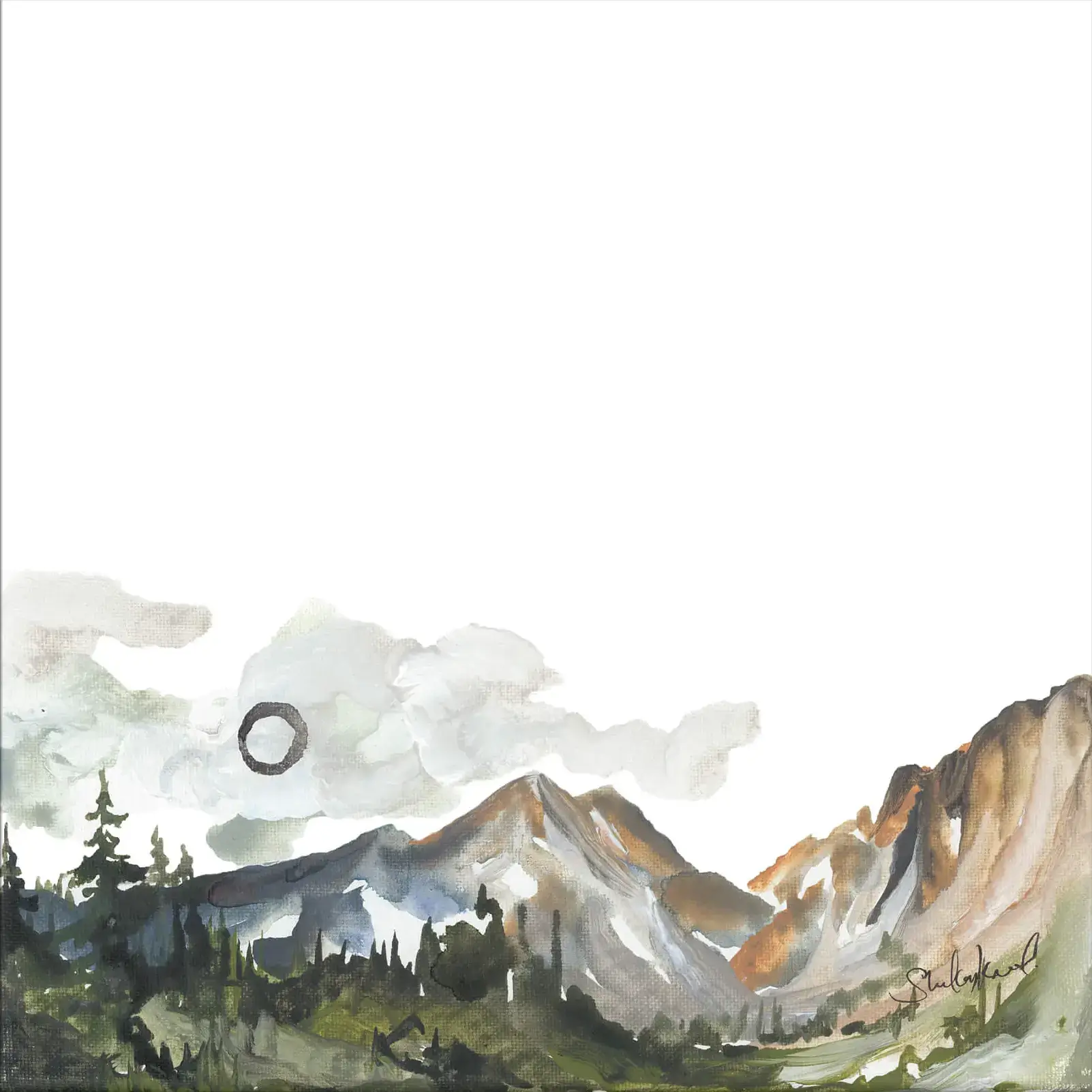 Watercolor painting showcases mountains with a mix of sharp and rounded peaks under a cloudy sky. The foreground features a range of trees in various shades of green. The overall color palette includes earth tones and hints of green.