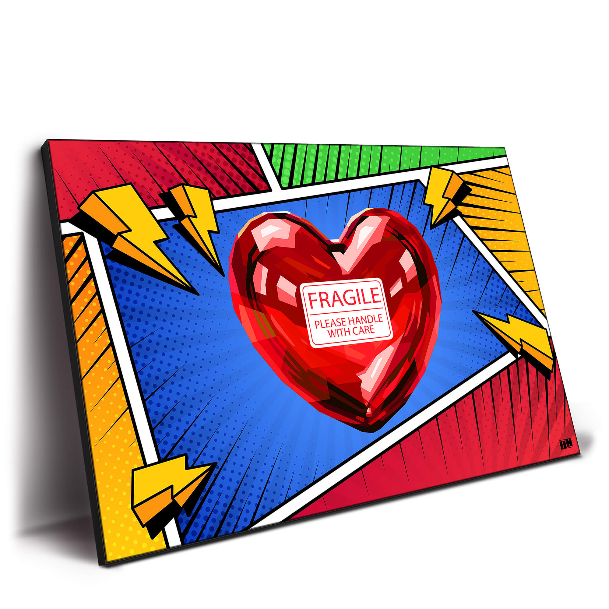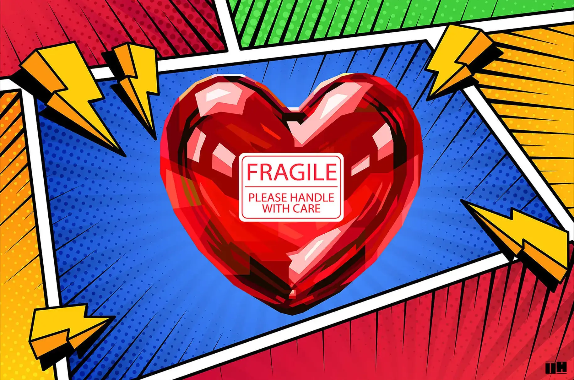 A vibrant pop-art style image featuring a shiny red heart with the label “FRAGILE, Please Handle With Care” in bold white text at the center. The heart is surrounded by comic-style, bright colors—blue, red, green, and yellow lightning bolts—set against a dynamic background with dotted textures and thick comic strip borders. The image blends elements of humor and emotional symbolism, creating a playful yet thought-provoking design.