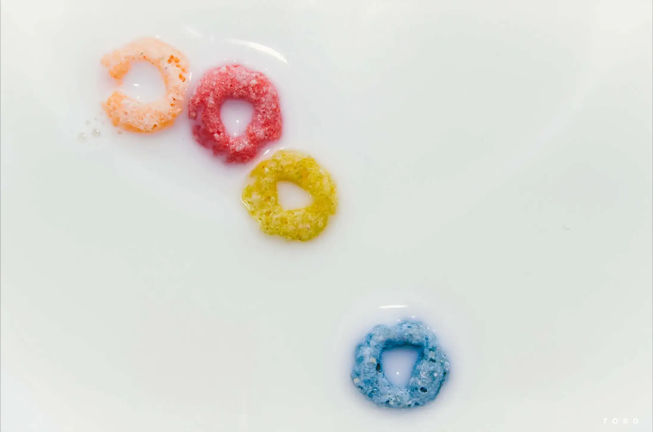 Four Fruit Loops in orange, red, yellow, and blue float gently in milk, forming a simple yet eye-catching pattern. The milk’s surface tension creates a slight dome around each colorful cereal piece, and the sugary grains partially dissolve, creating a soft halo effect. The minimalist composition is set against a pristine white background, with the subtle shadow and light play highlighting the cereal’s texture and the milk’s silky smoothness.