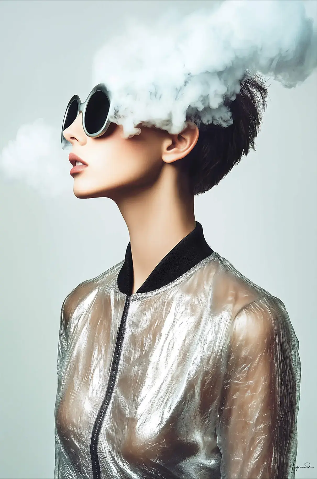 A confident profile emerges against a pale neutral background. Oversized round shades conceal the eyes while a billow of white vapor rolls across her face and out into open space. The short pixie cut keeps the silhouette clean, letting the strong jawline guide attention toward soft lips slightly parted. Metallic silver fabric clings to her shoulders and chest, reflecting cool ambient light in abstract ripples. Every surface feels sleek and modern, yet the mood stays quiet and contemplative. This mix of high-gloss fashion and gentle mist gives the piece a calming rhythm suited for slow mornings. Explore more modern fashion wall art and notice how this vertical layout naturally draws the gaze upward. From a distance the vapor looks like a thought balloon, adding playful intrigue to your décor.