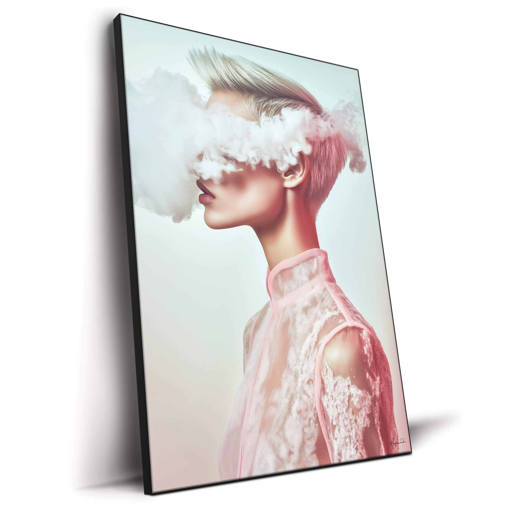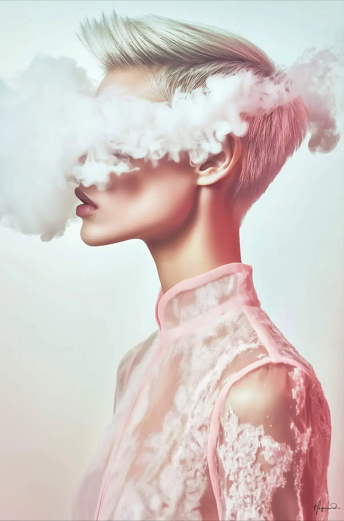 Pink vapor drifts across a model’s eyes, turning her sharp profile into a dreamlike silhouette. Short platinum hair catches cool light, contrasting with the warm blush that glows along her cheek and neck. A sheer lace blouse melts into the background, its delicate texture echoed by the rolling cloud. Subtle gradients move from ivory to rose, producing a gentle pastel haze. The vertical format elongates her poised neck, emphasizing serenity rather than motion. Muted edges cause the subject to feel half-remembered, as if seen through morning mist. Smooth skin, translucent fabric, and billowing smoke combine to create quiet tension. This balanced composition fits naturally among fashion inspired wall art and contemporary wall art prints.