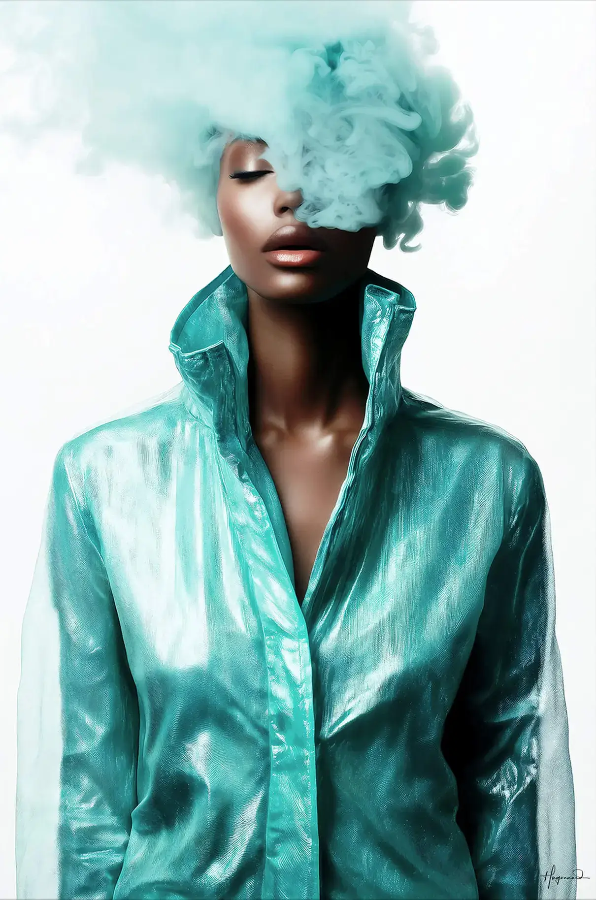 The portrait shows a tall, elegant woman centered against crisp white. A gauzy plume of teal smoke rises from her forehead, softening her closed eyes and relaxed lips. Light ricochets off a high-collar, metallic shirt that shifts between aqua and jade. The garment clings yet drapes, catching shadows that accentuate its liquid texture.