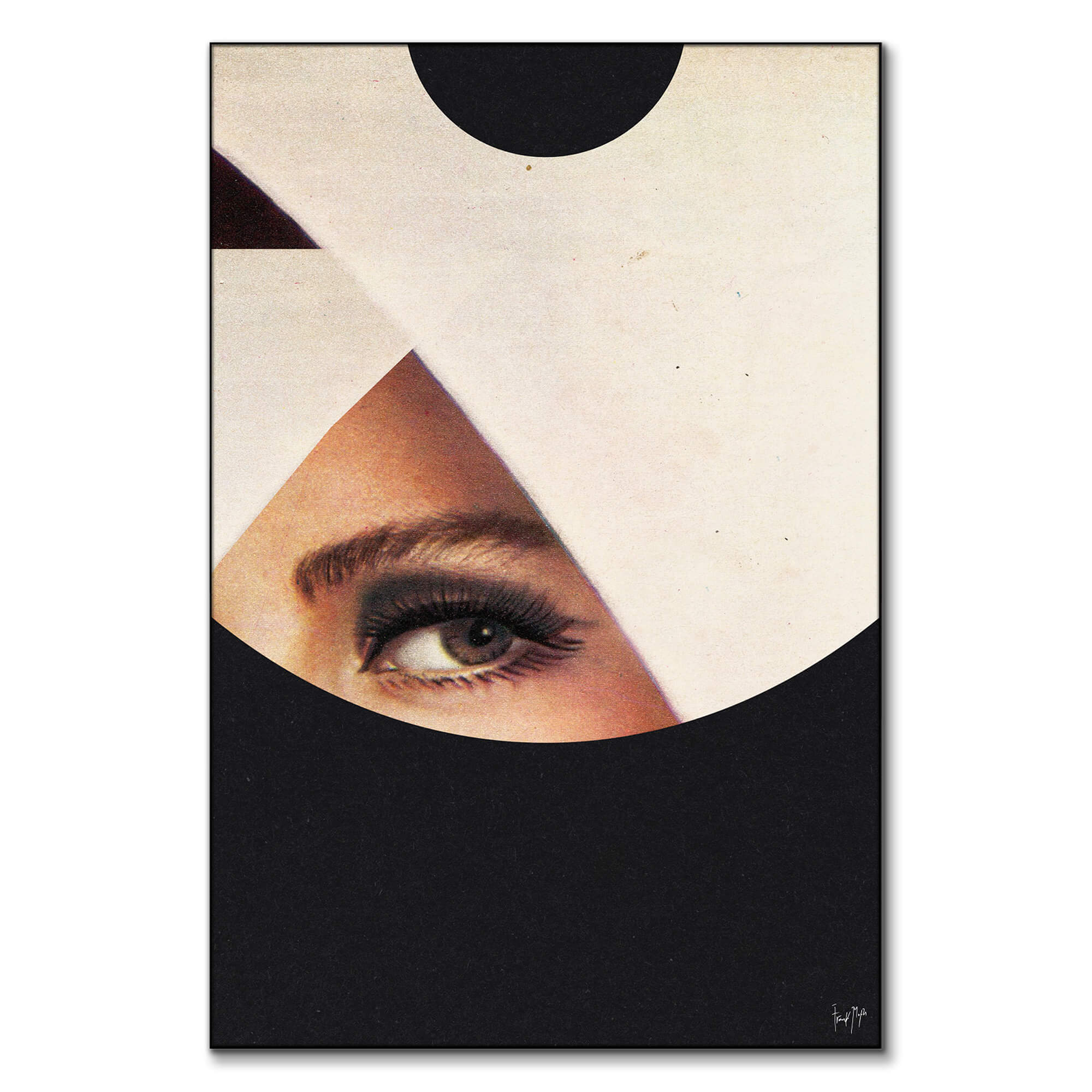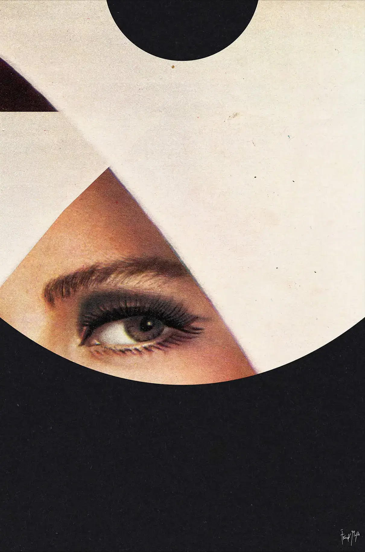 This minimalist portrait captures intrigue and elegance through simplicity. A single eye peers through layers of black and cream geometric shapes, creating a composition that feels cinematic and mysterious. The contrast of soft textures and sharp design gives it a modern editorial energy.