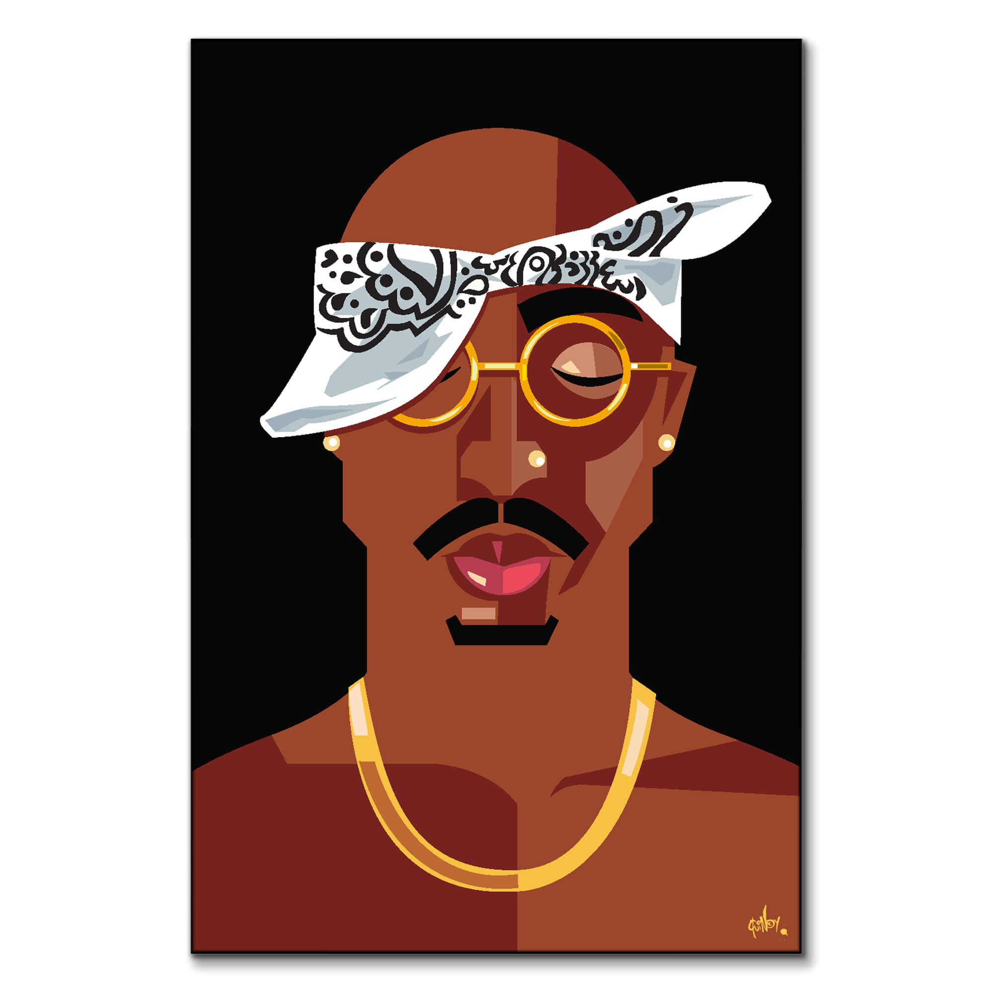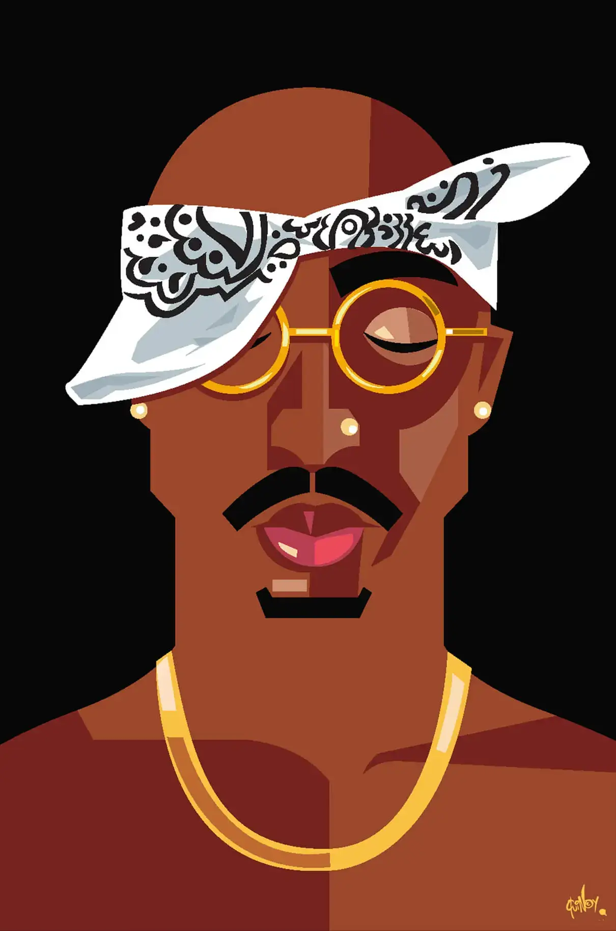 The digital illustration portrays legendary rapper Tupac with a patterned white bandana and round, gold-rimmed glasses. His gold chain necklace is set against a bare chest and is set against a dark background, emphasizing the figure’s facial features and accessories. The art style is geometric and abstract, with sharp angles and a rich, warm color palette that captures attention.
