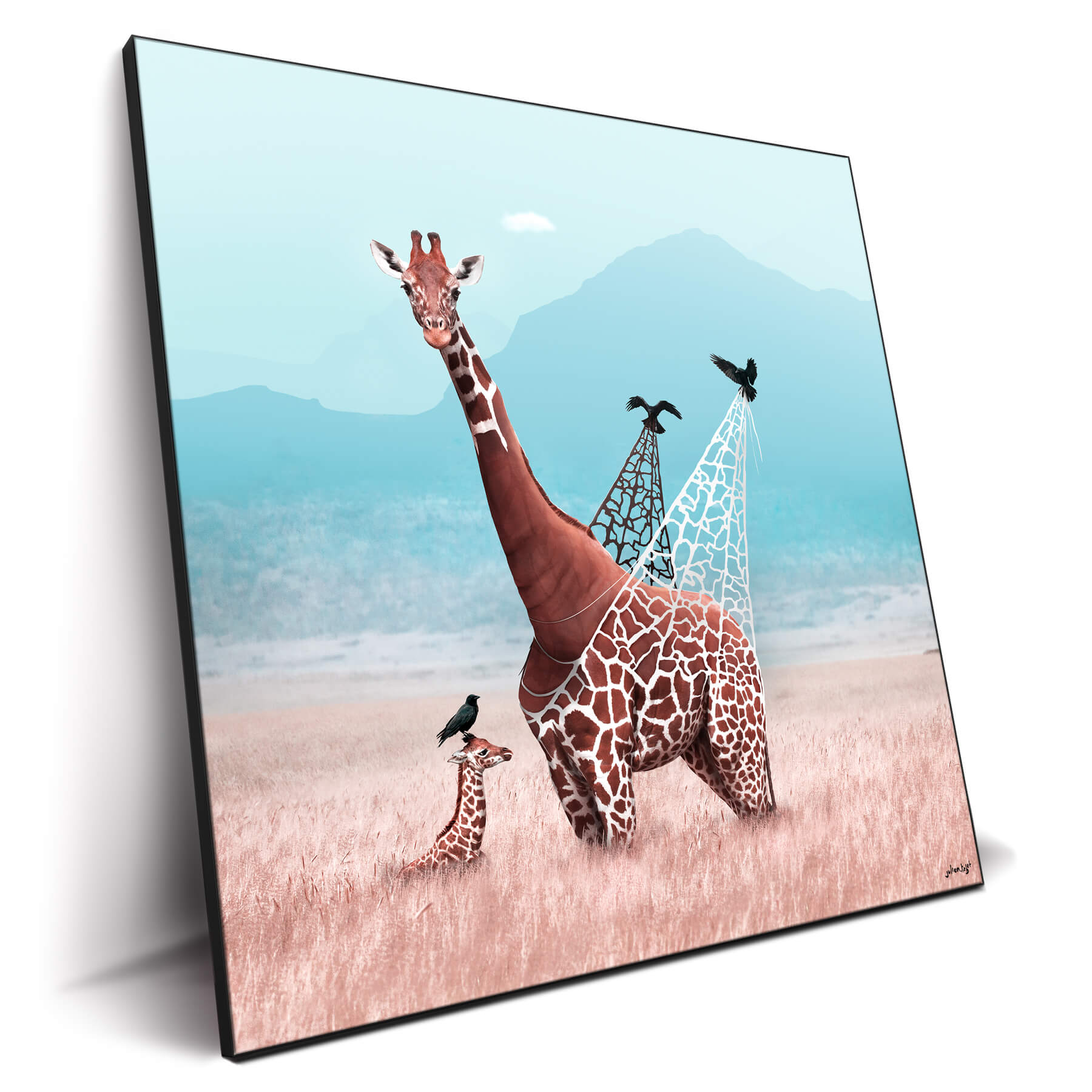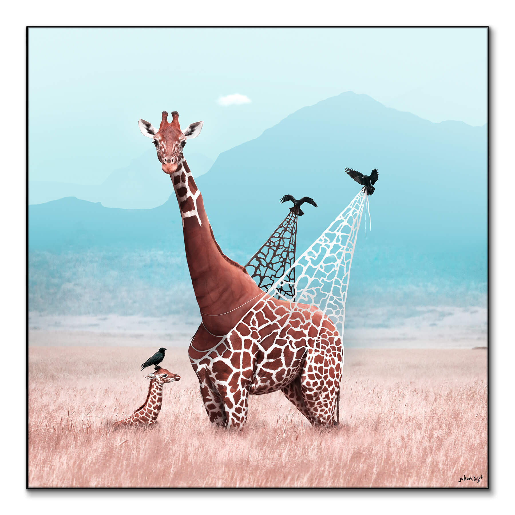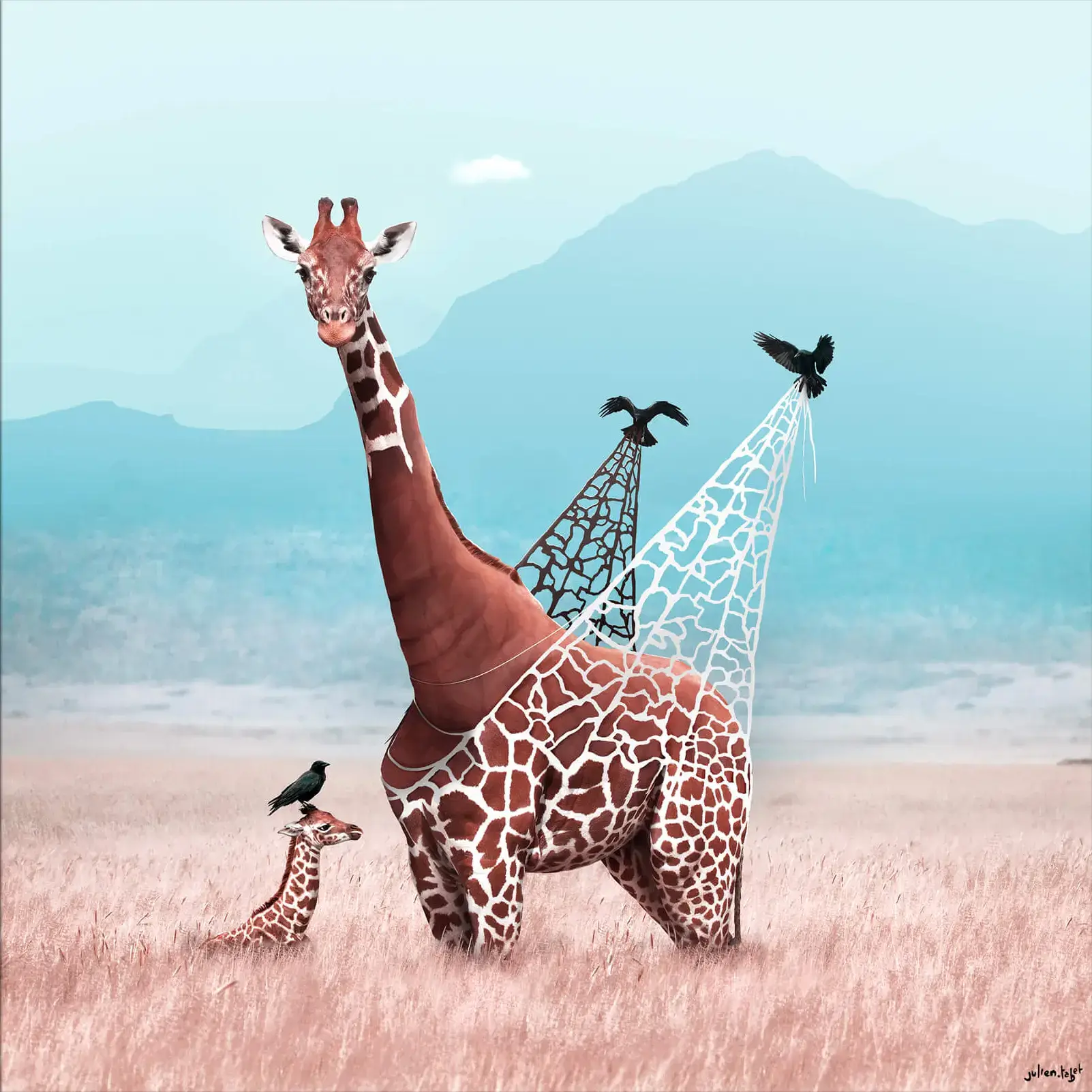 On the hazy plains, a giraffe becomes the canvas for Julien Tabet’s imaginative play, its spots transforming into gaping windows to a clear, blue sky.