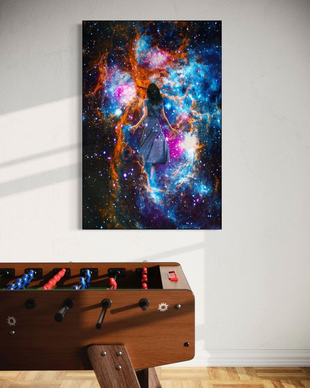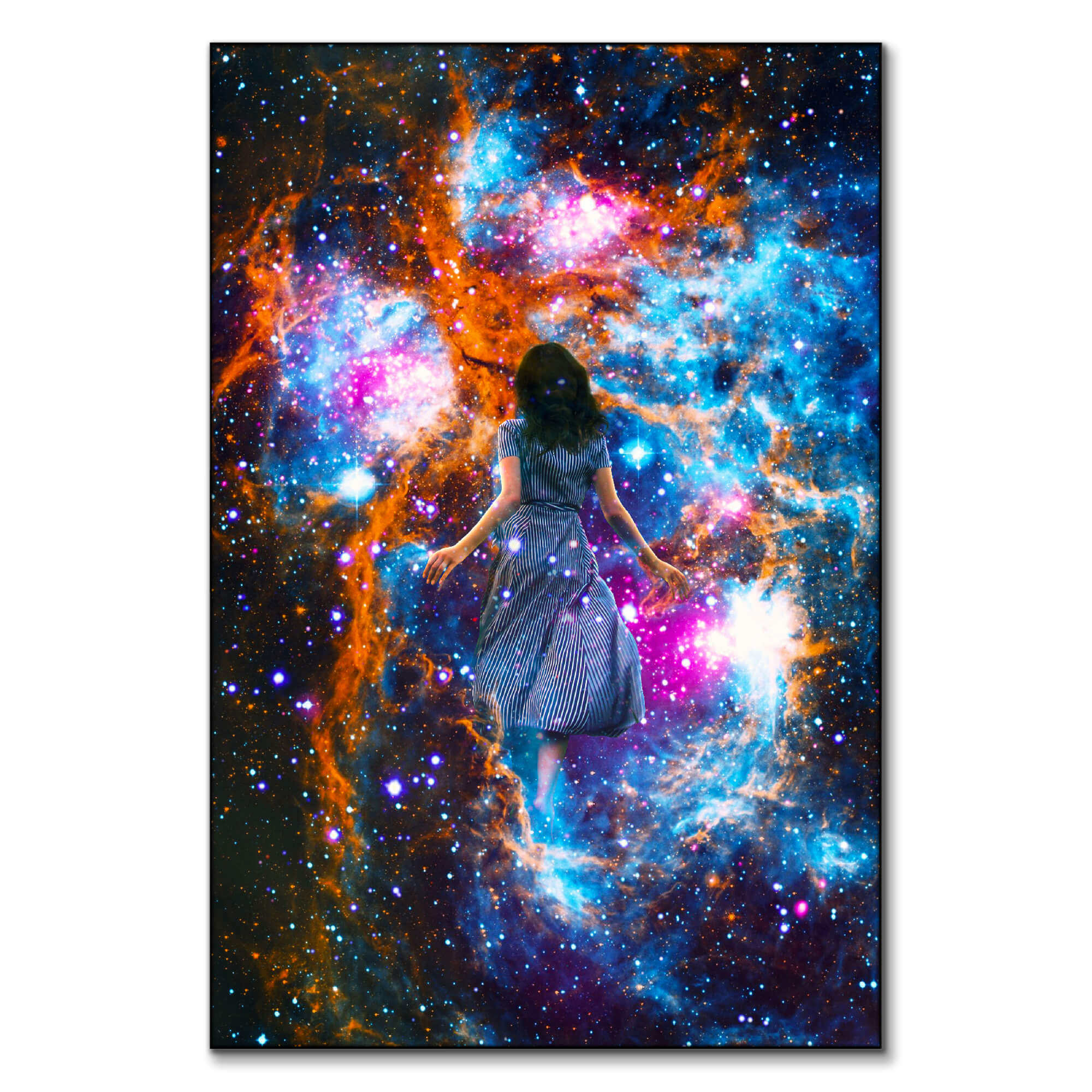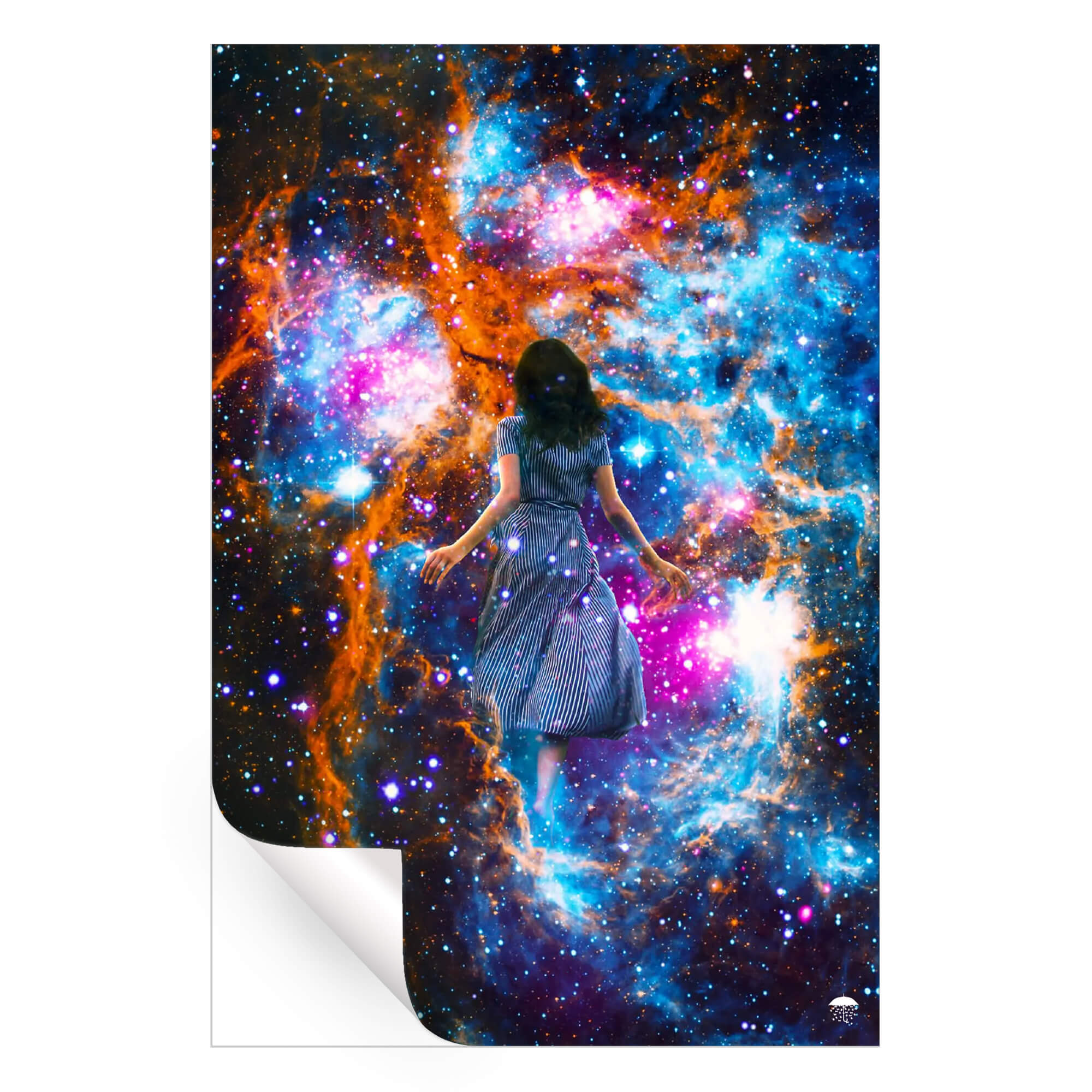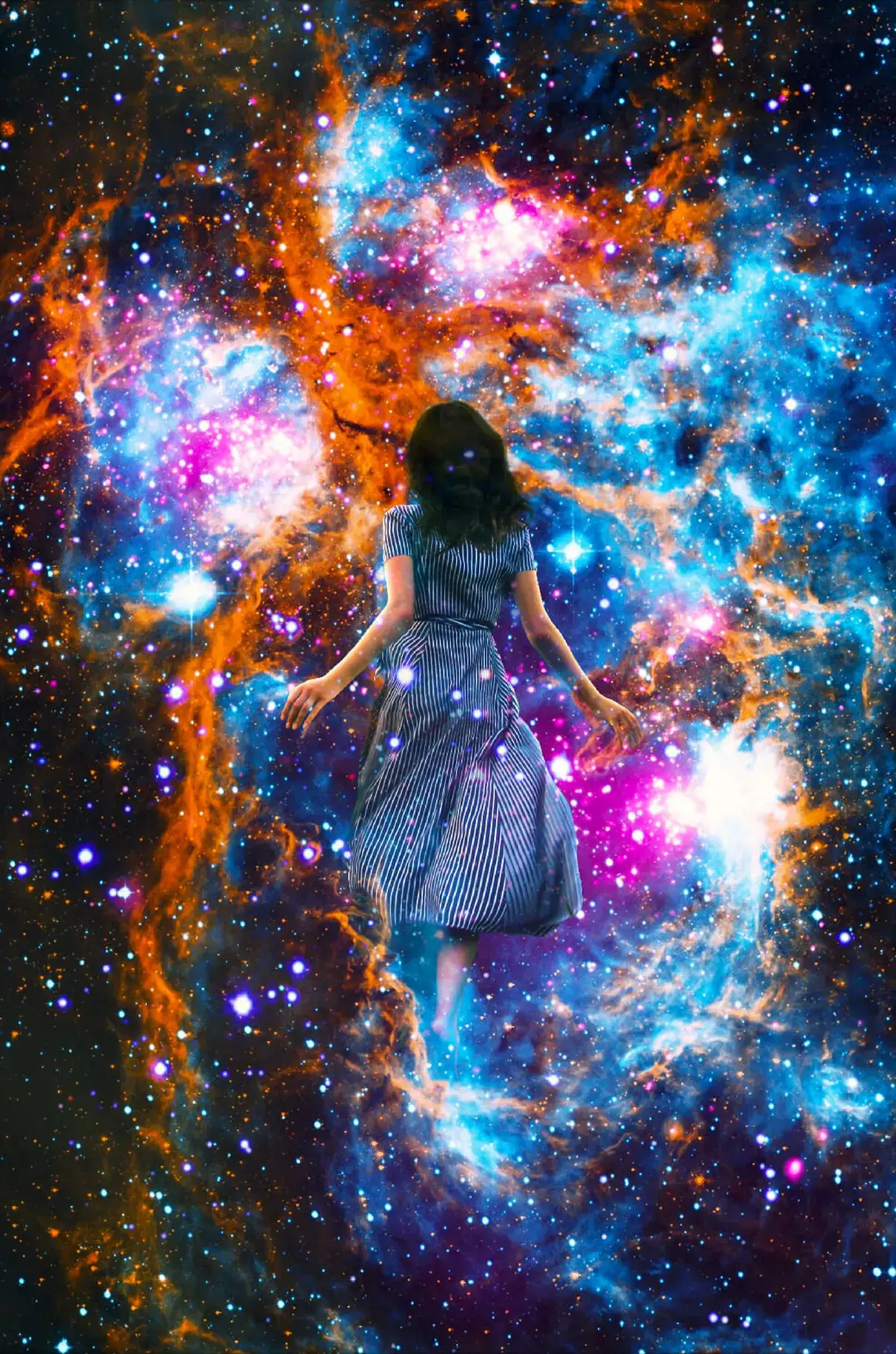 A figure in a striped dress stands with her back to the viewer, running through the cosmic vastness of space. The nebulous background swirls with a kaleidoscope of starry blues, pinks, and oranges. Her presence is a human touch amidst the celestial grandeur, a solitary silhouette against the infinite.