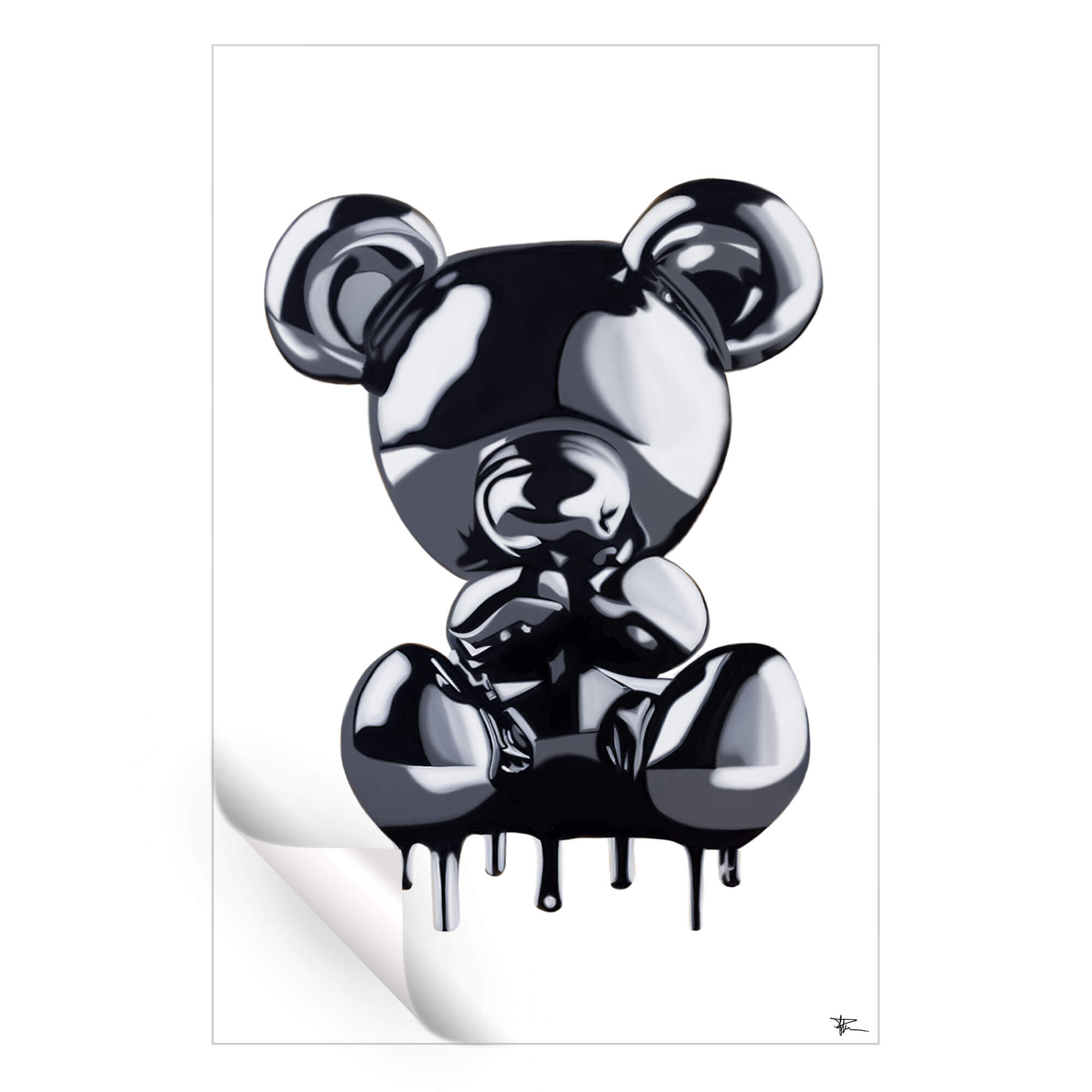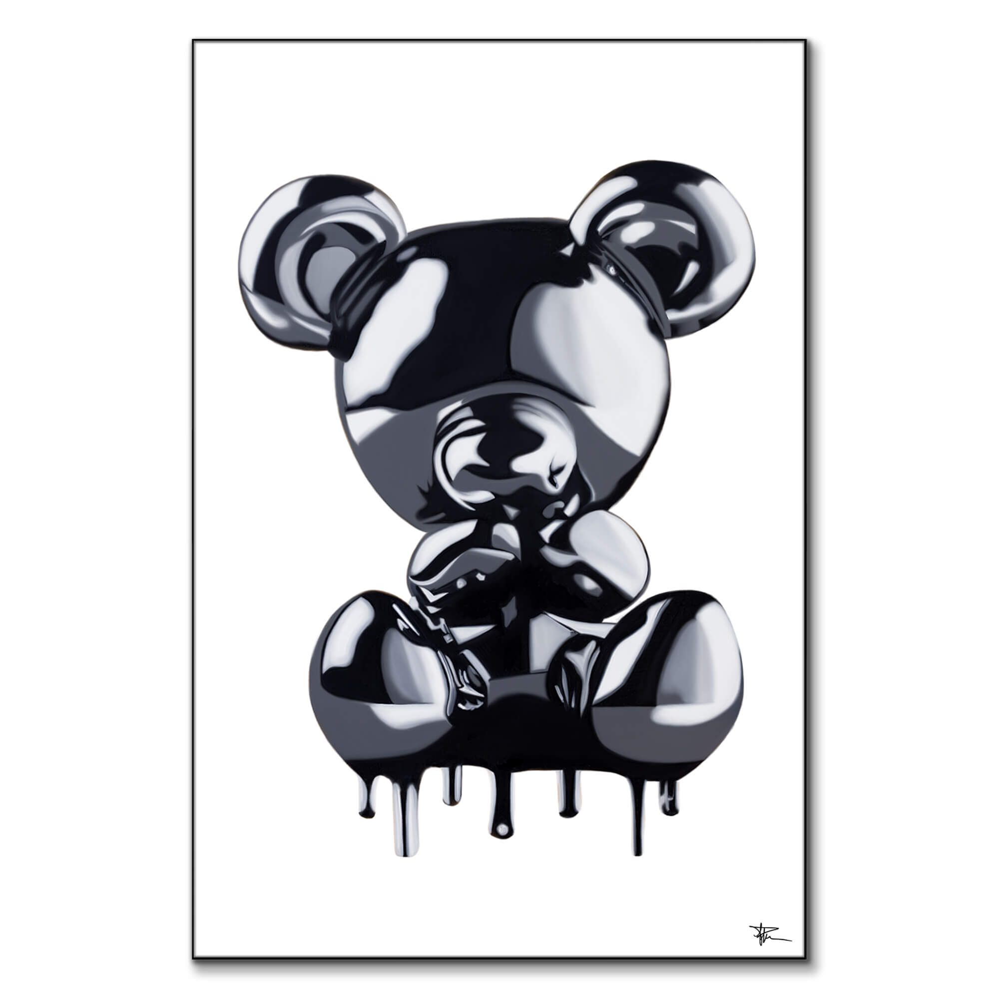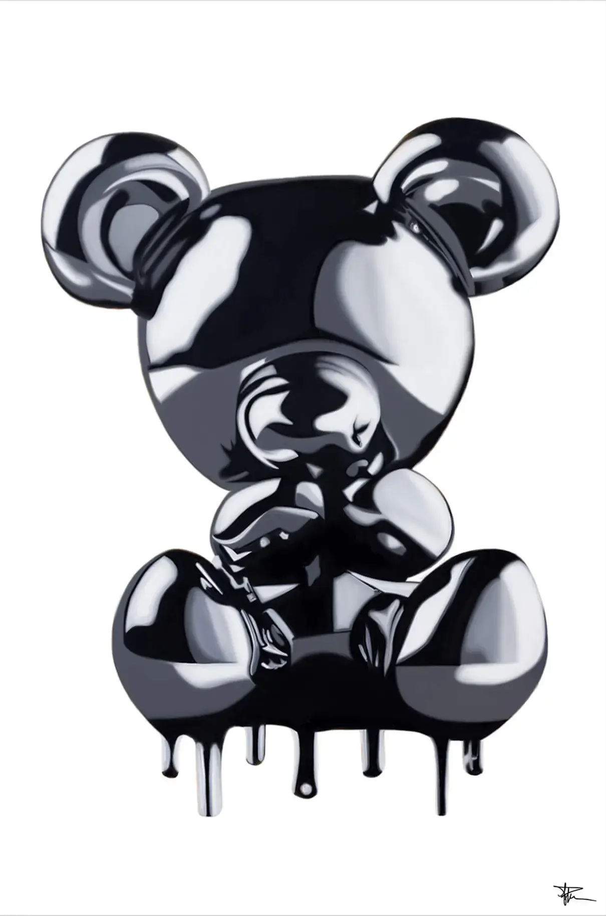 A glossy, black bear-like figure is depicted mid-meltdown, its form appearing to dissolve into a pool of liquid art. The reflective surface bends light and space, creating an illusion of depth and movement.
