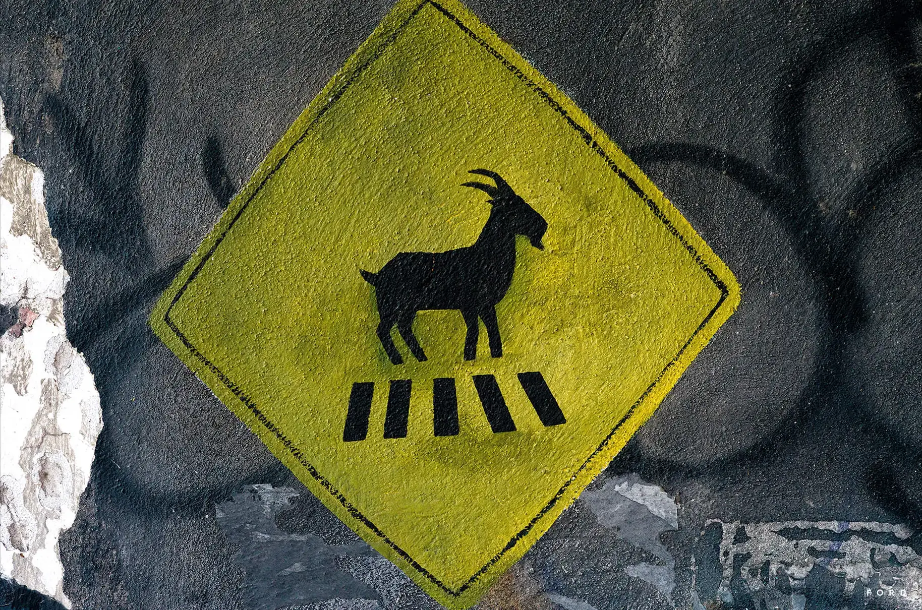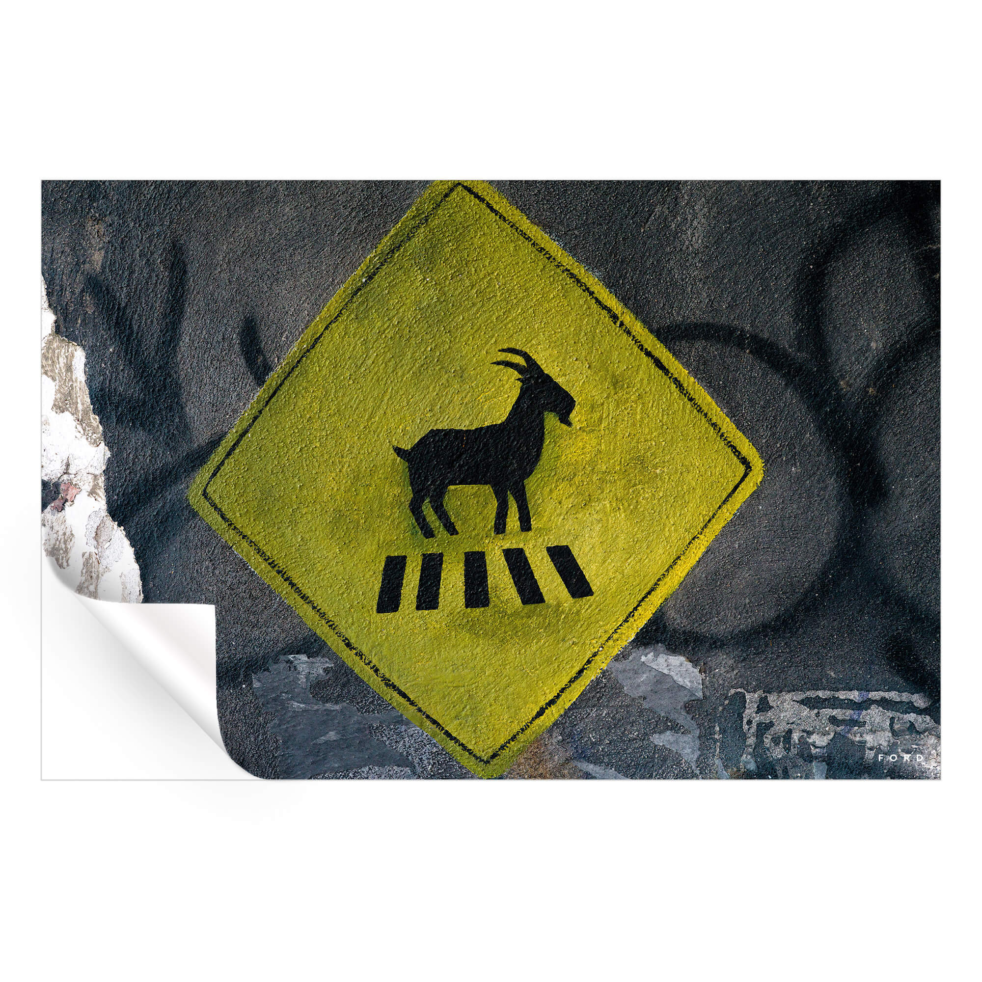 This bold and quirky artwork features a street sign depicting a goat crossing the road. Set against a backdrop of textured graffiti, the piece creates a playful juxtaposition of urban life and nature. The yellow diamond sign stands out vibrantly, adding a splash of color, while the abstract background brings an edge to this contemporary piece. This artwork is a perfect conversation starter and an ideal addition for those who enjoy humor, street art, and an unexpected touch of charm in their space.
