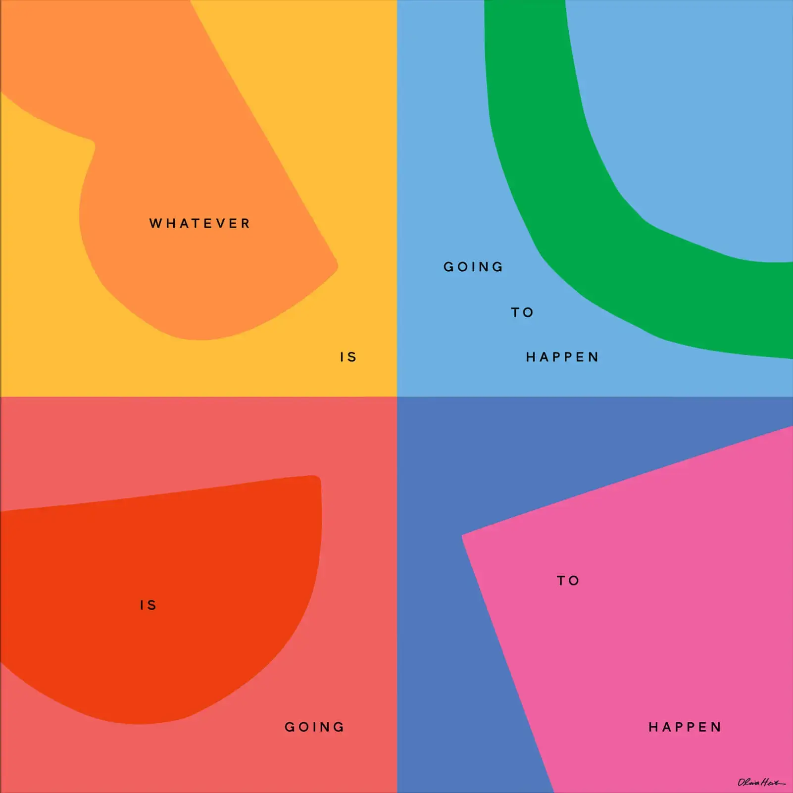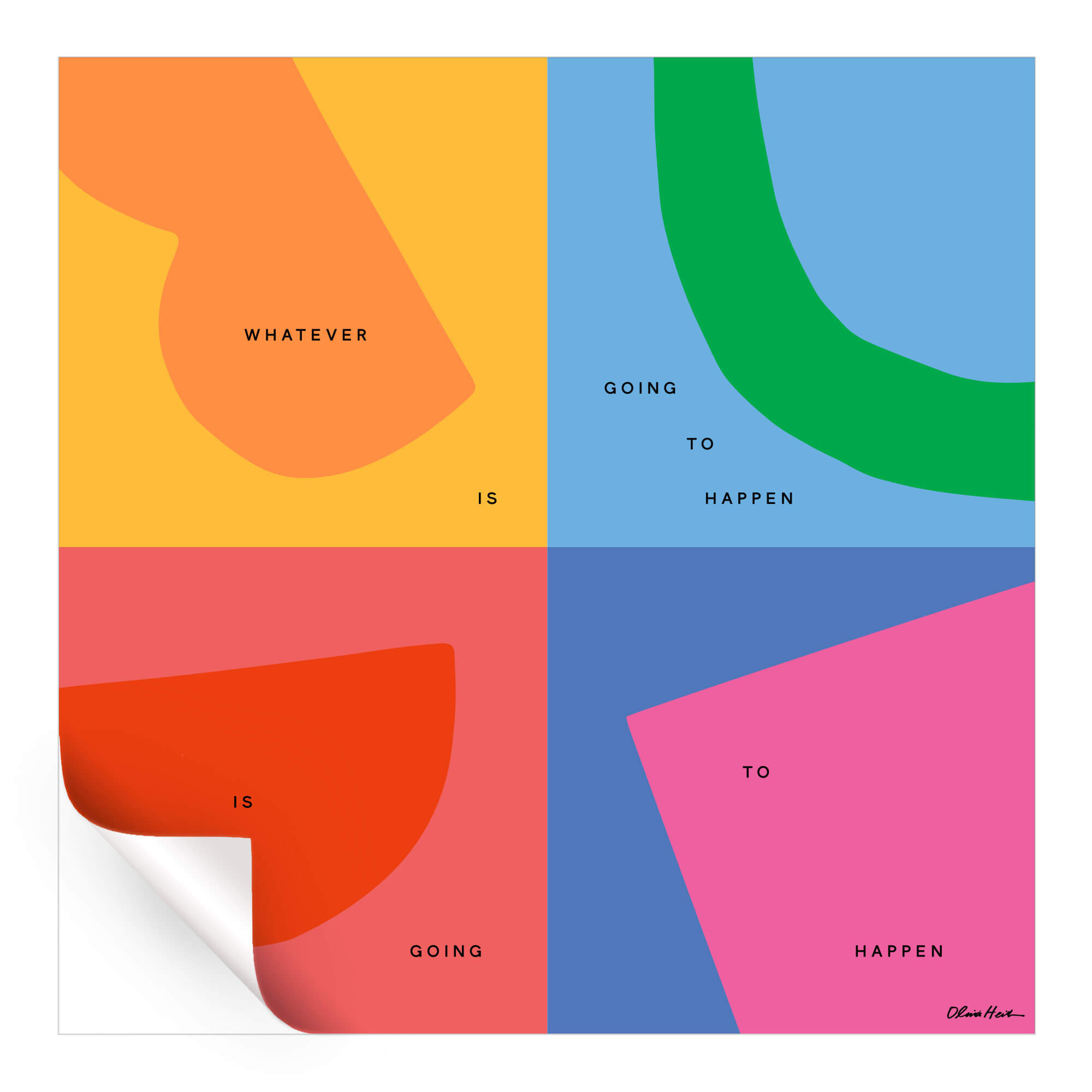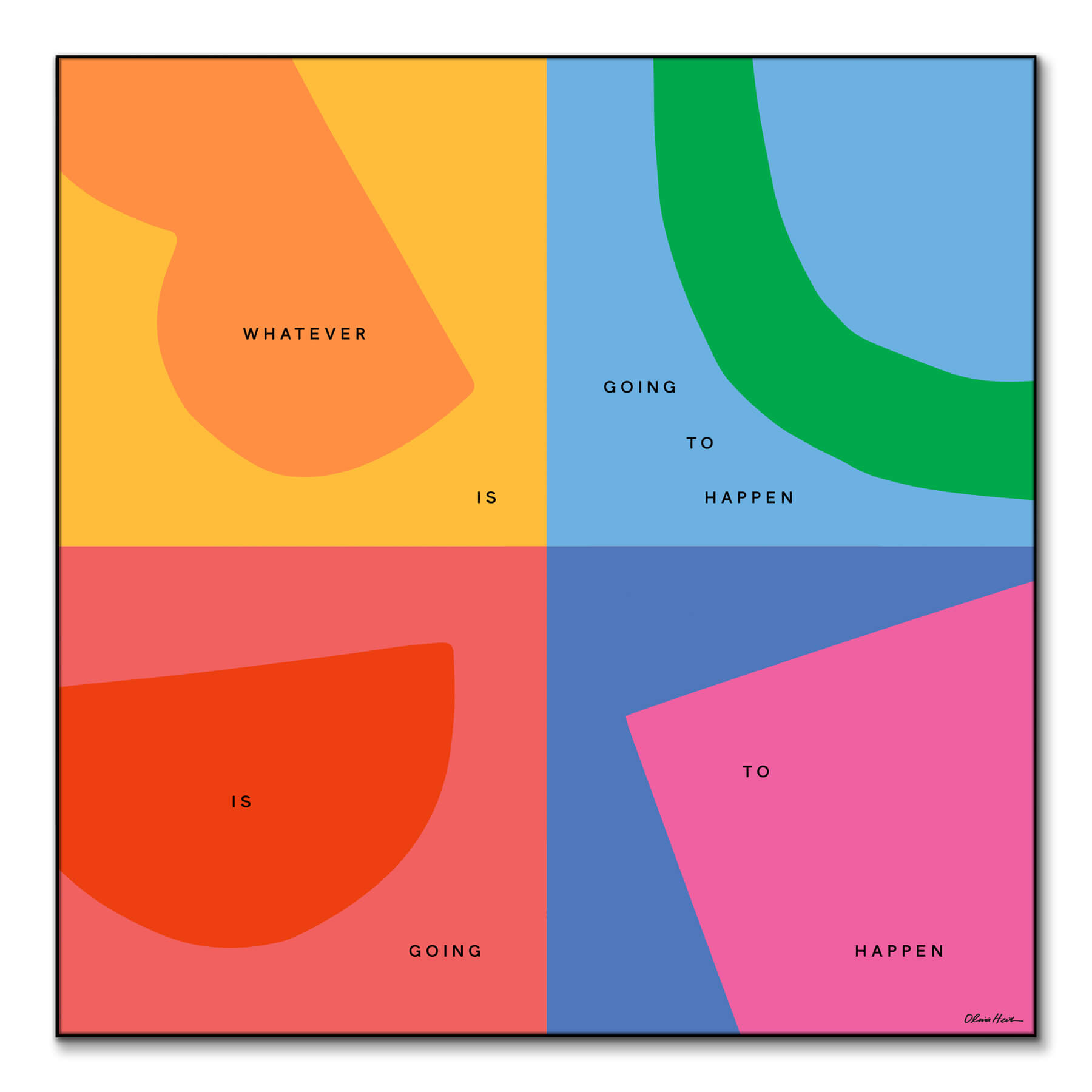 Bold geometric shapes in a quartet of saturated colors form the backdrop for the fragmented yet reassuring phrase “WHATEVER IS GOING TO HAPPEN” in Olivia Herrick’s artwork.