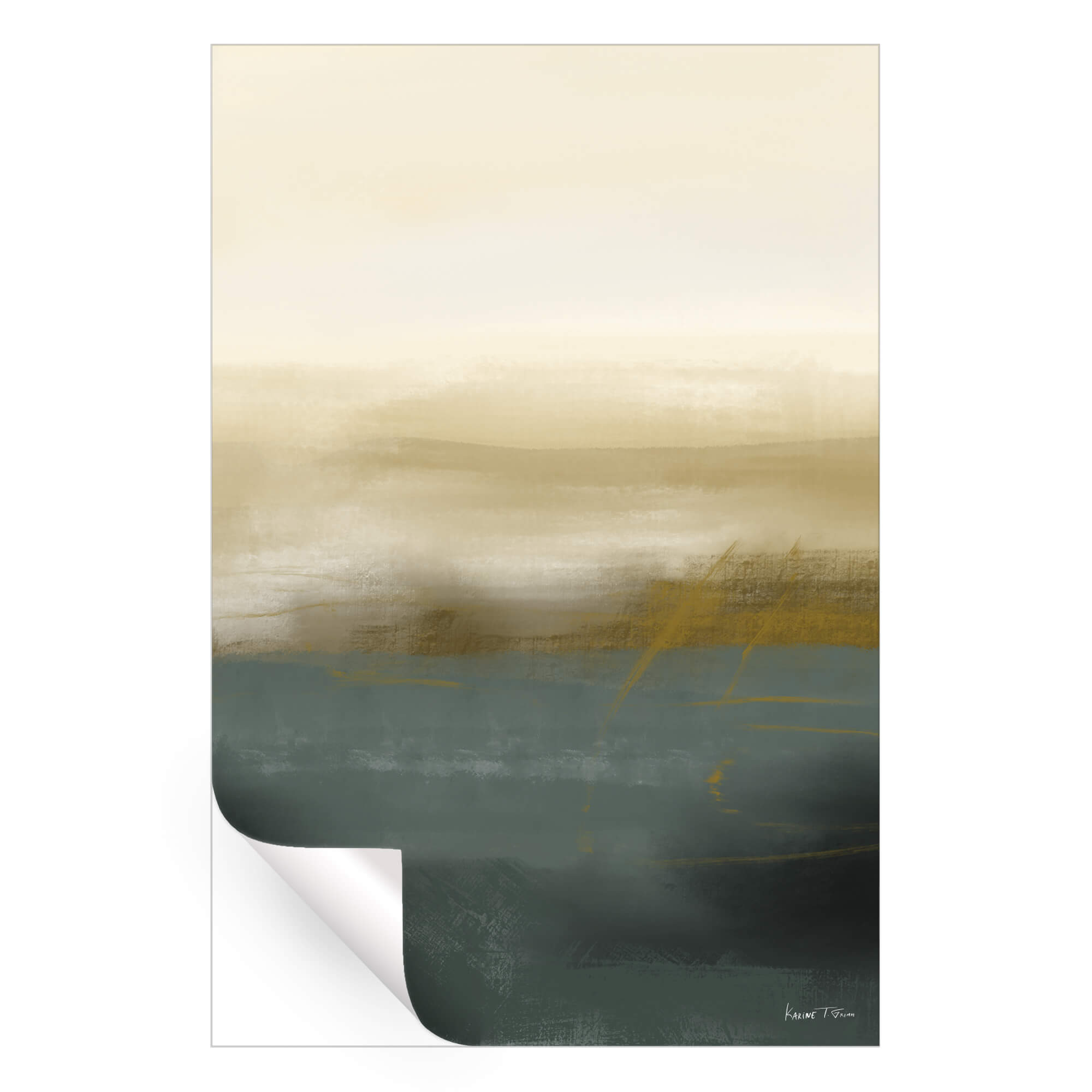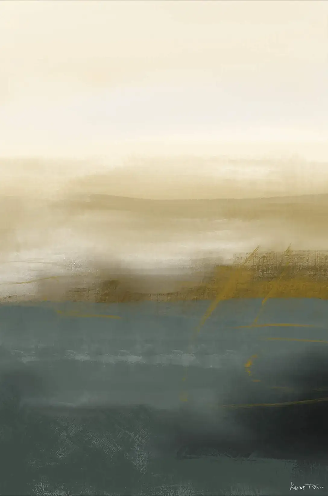 Layered bands of misty cream and cool green-slate grey meld into each other, creating an ethereal horizon. This exchange of light and dark is accentuated by a horizon line tinged with gold. Below, deep charcoal grey is textured, reminiscent of rugged landscape shrouded in shadow. Occasional brushstrokes of gold break through, hinting at hidden treasures.