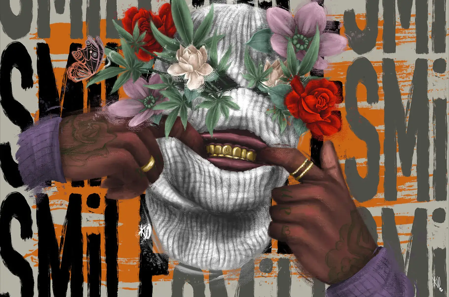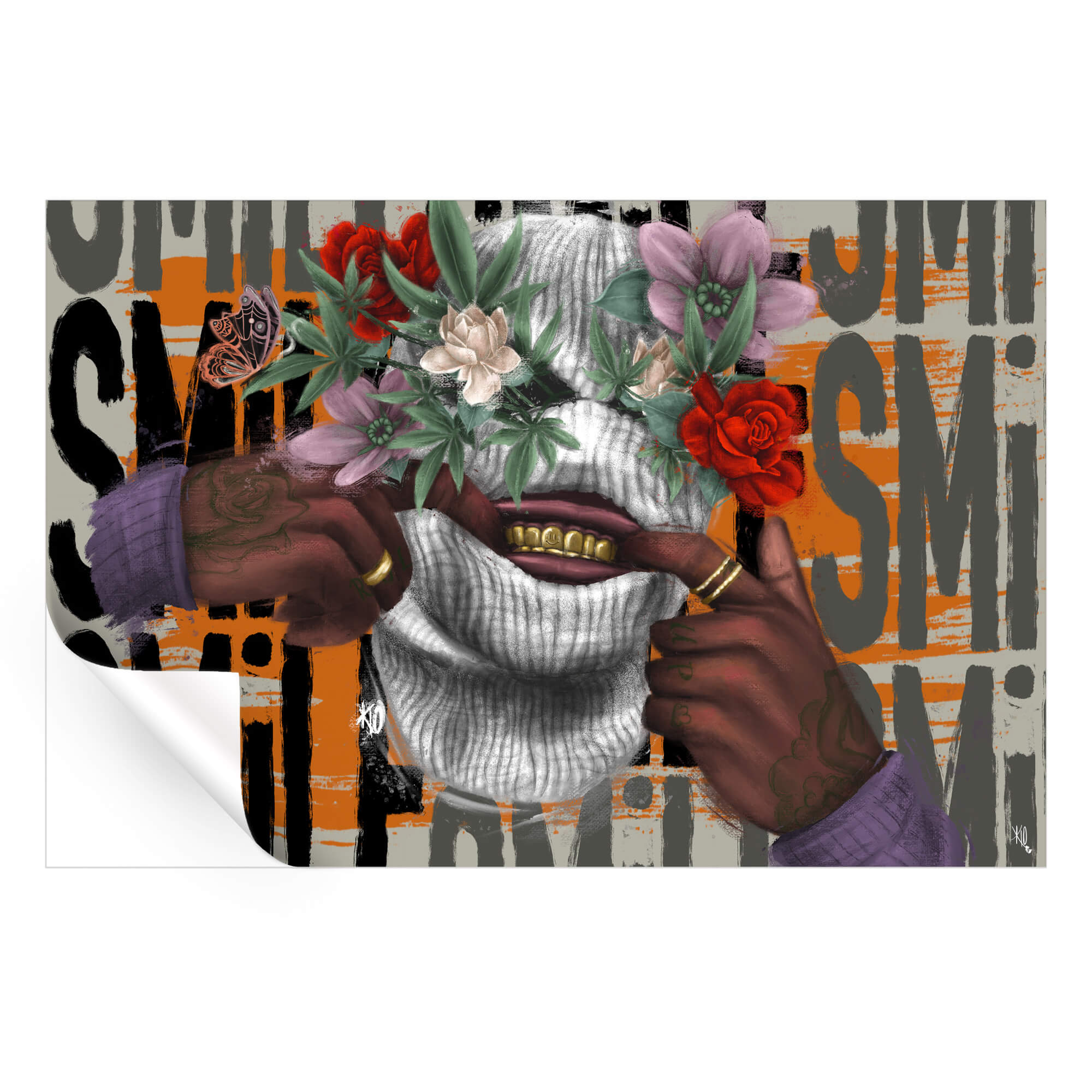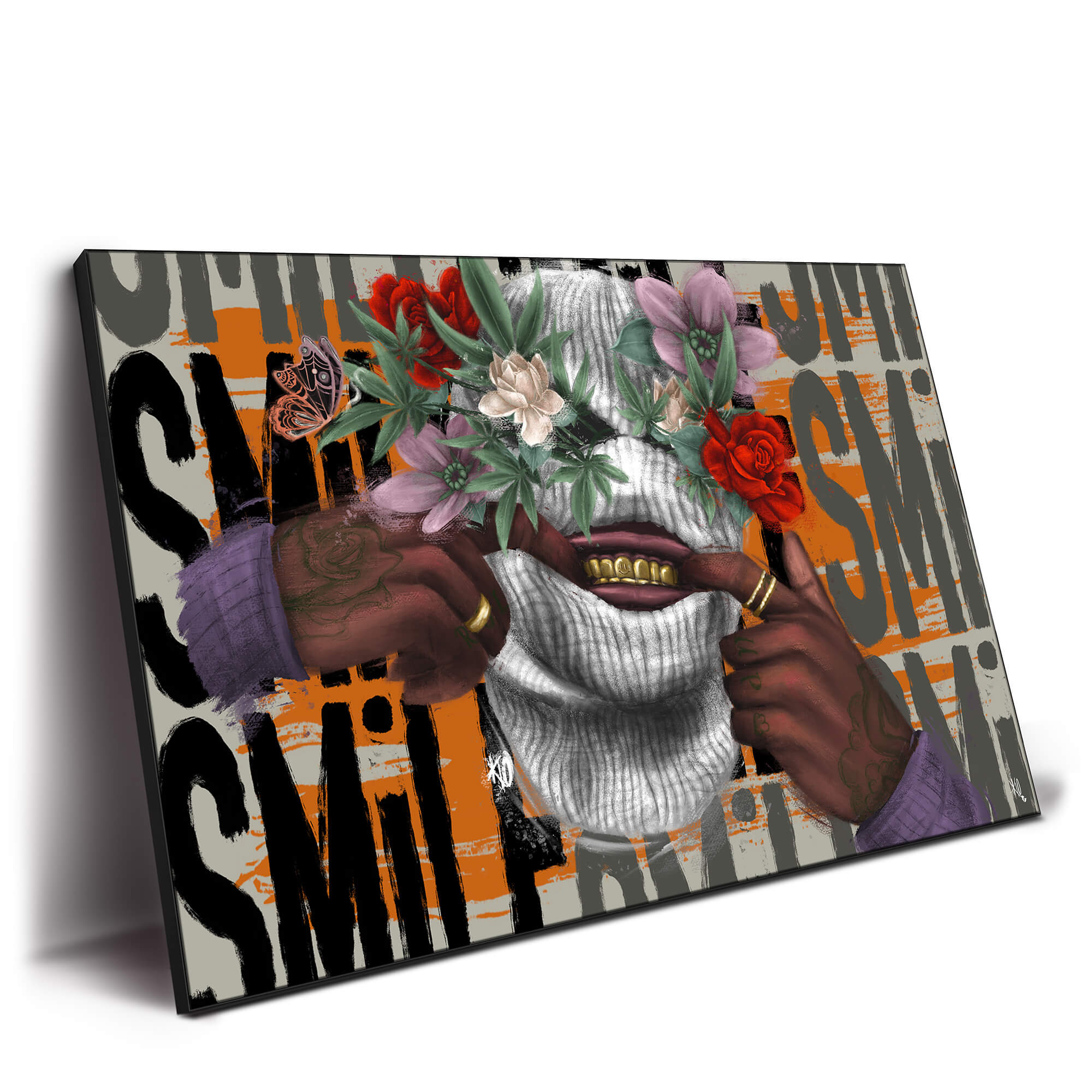 The background features graffiti-style lettering that spells out “SMILE,” reinforcing the artwork’s upbeat and urban vibe.