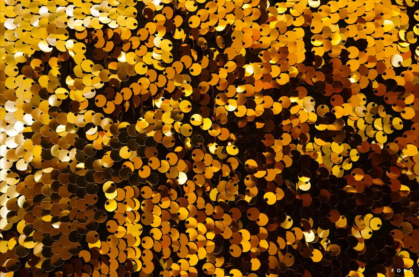 Thousands of gold sequins in many shades of gold and amber create a luxurious, shimmering surface. The gold sequins overlap and vary in orientation, catching the light at different angles and giving the appearance of a glittering, textured fabric. This dazzling display evokes a sense of celebration and opulence.