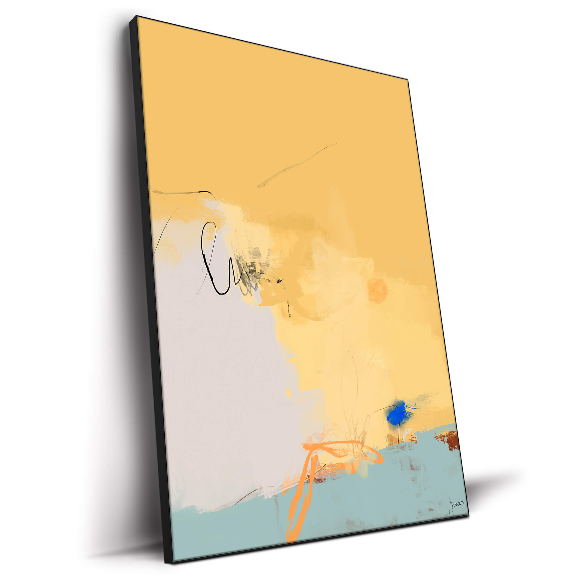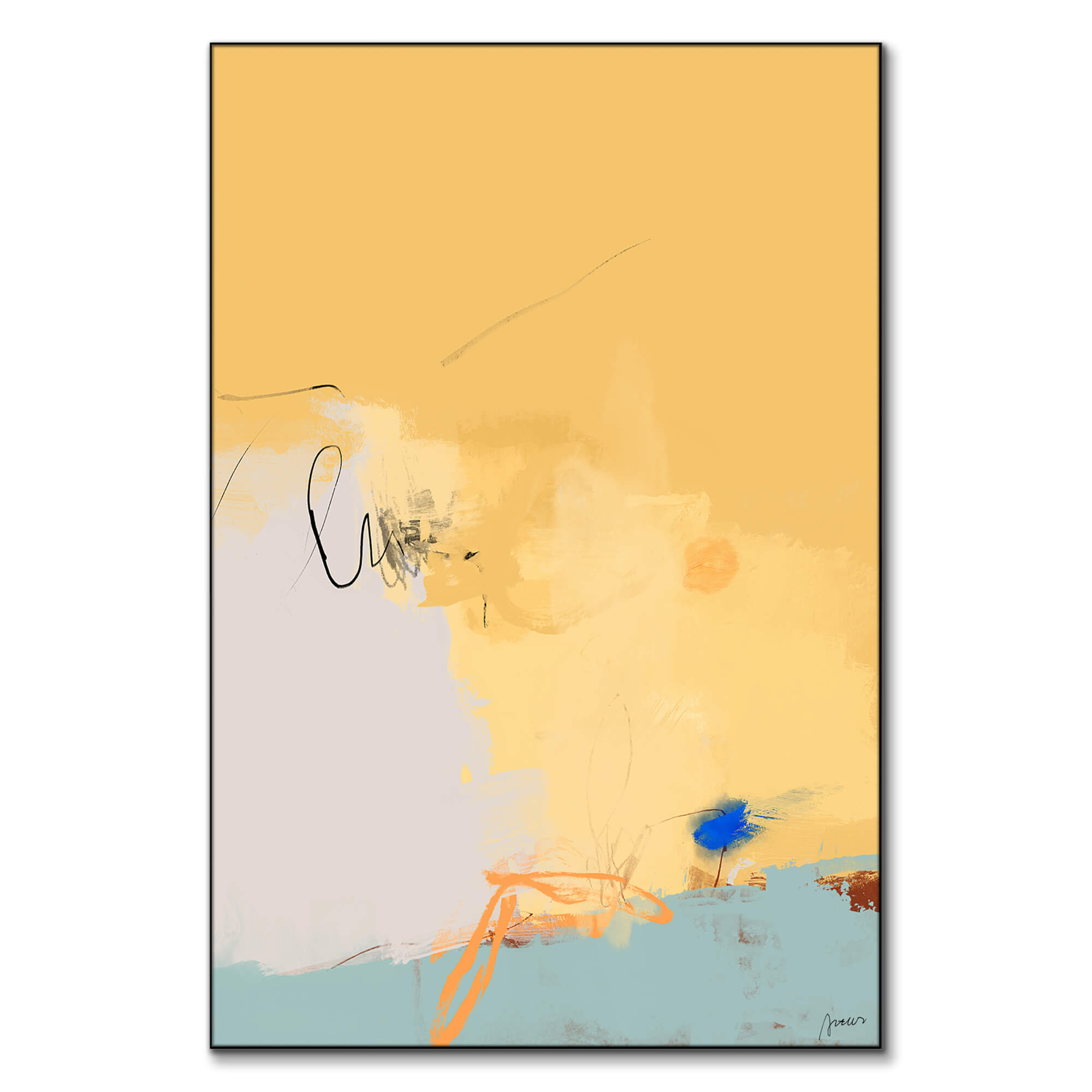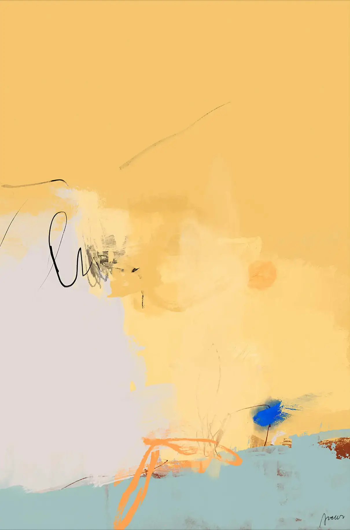 A golden mustard backdrop is graced with a whimsical dance of lines and colors. A solitary splash of light blue sits near the base, while soft off-white and a blue brushstroke give the impression of a gentle breeze. Wisps of orange add warmth, suggesting the last rays of a setting sun.