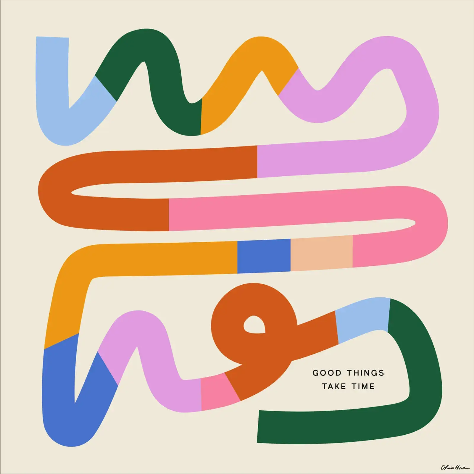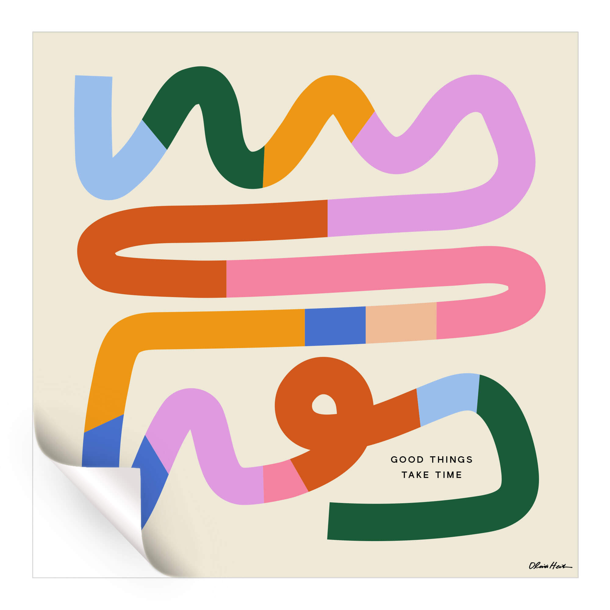 Near the bottom, the phrase GOOD THINGS TAKE TIME sits neatly inside one of the open curves, acting as a gentle reminder to slow down and enjoy the process. The negative space around the colorful line keeps the piece airy and balanced, letting the message stand out without feeling heavy. The mix of calm neutrals and cheerful tones makes this artwork feel both peaceful and energizing at the same time. This piece blends minimal design with a cheerful, optimistic mood, making it a great fit for anyone who loves bright simplicity and positive energy in their space.
