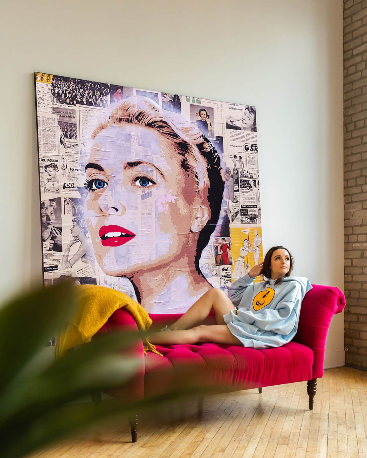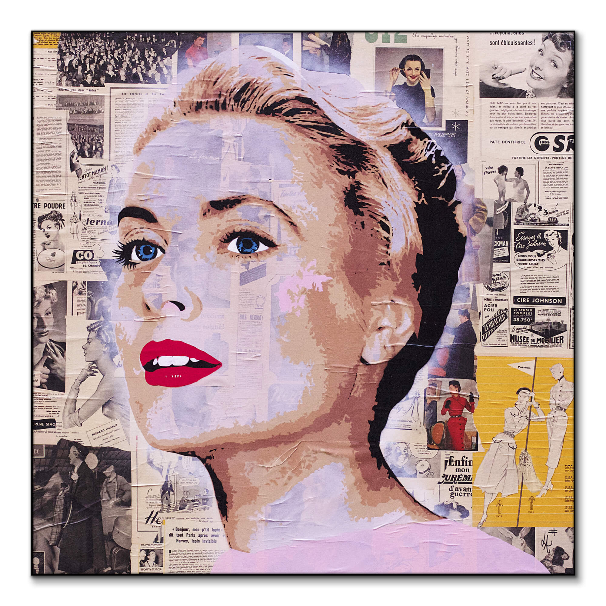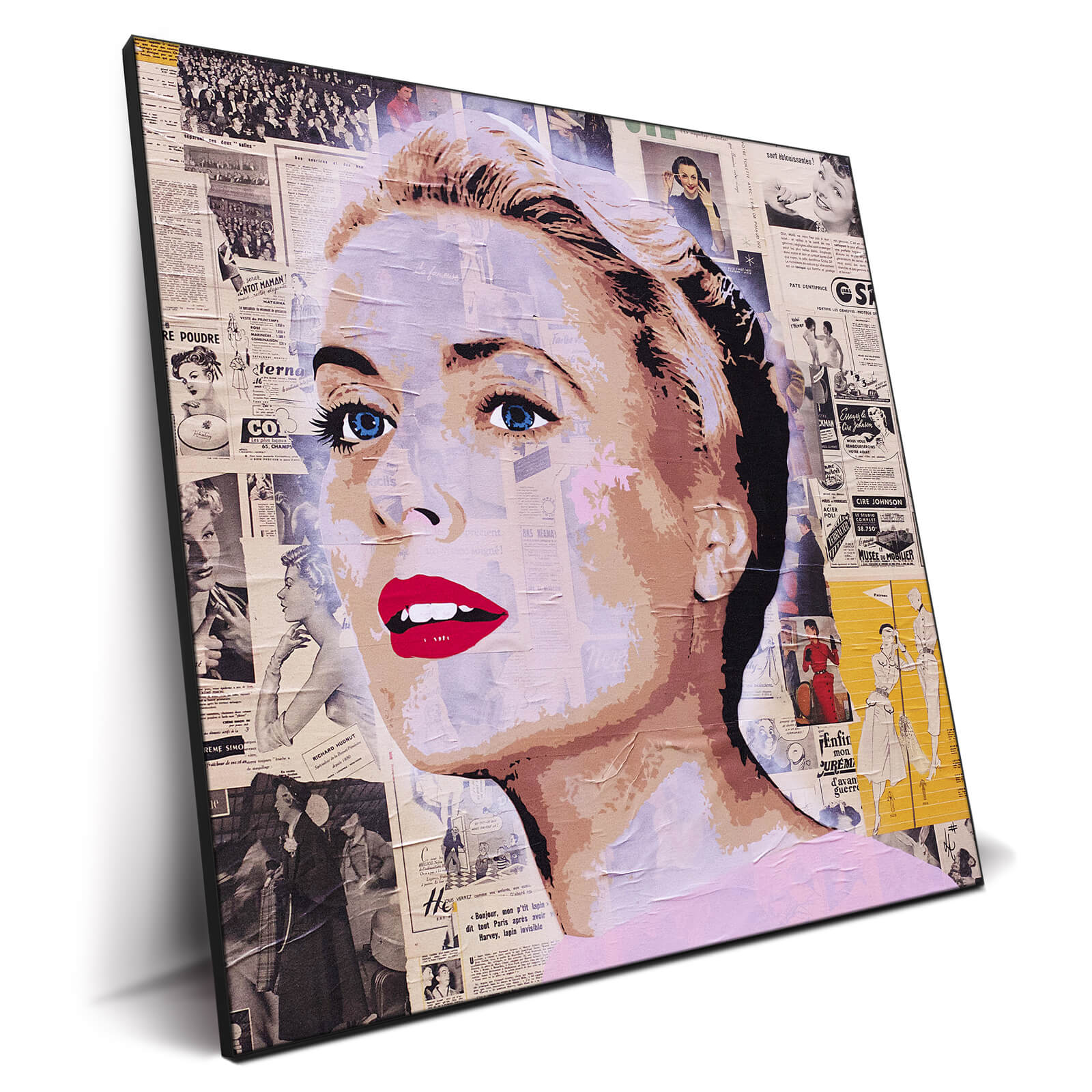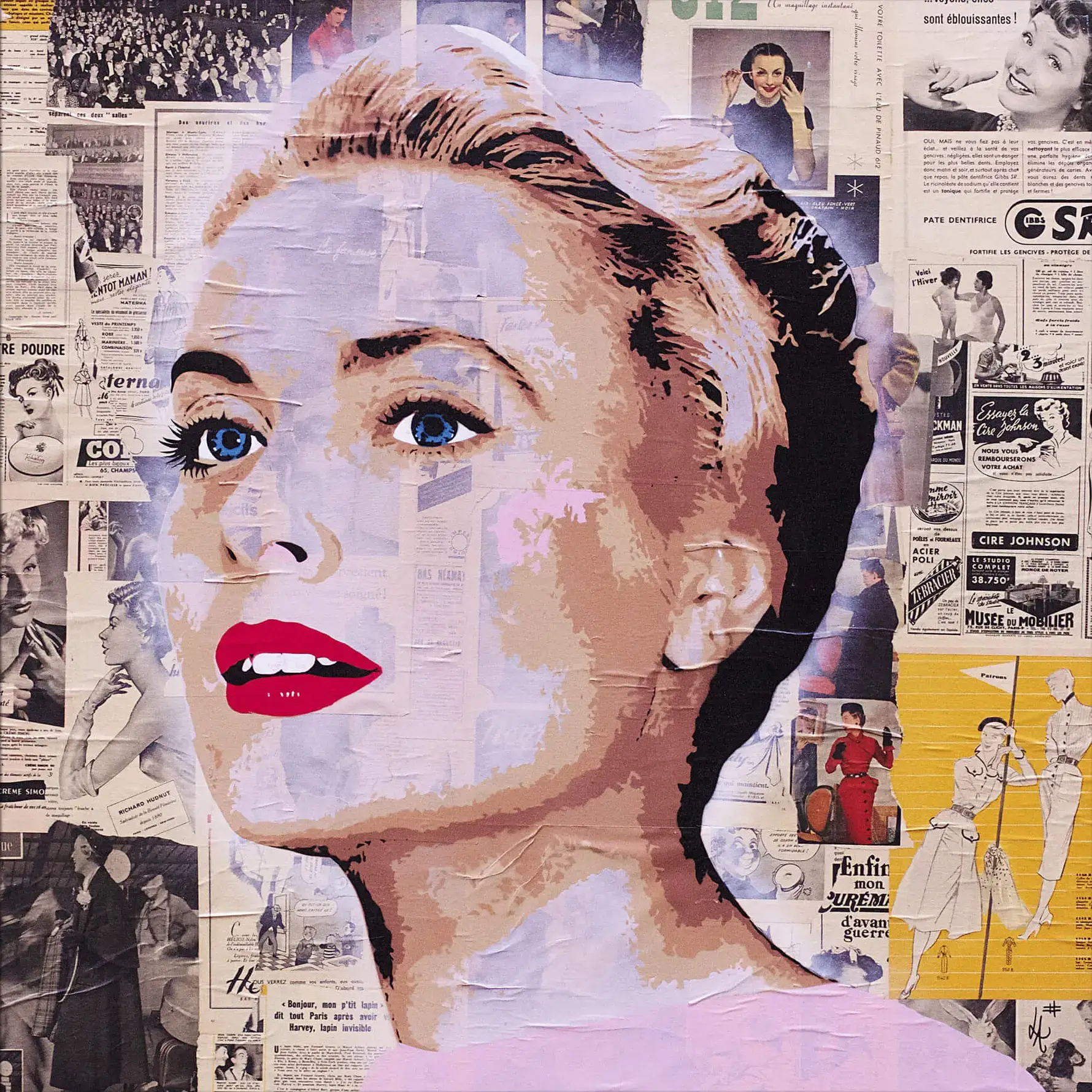 A profile collage of Grace Kelly, her image pieced together with vintage newspaper clippings that speak to the era she reigned as a star.