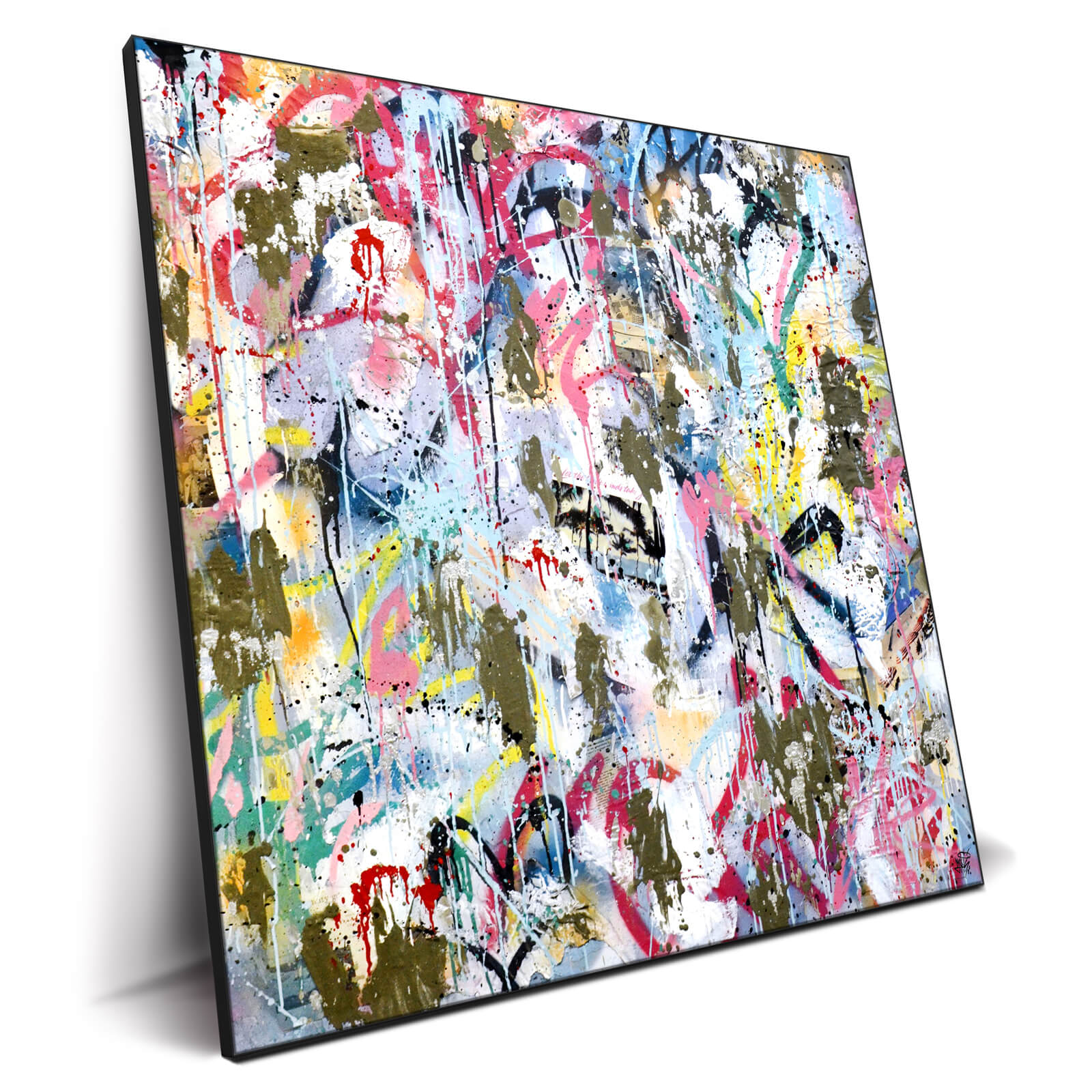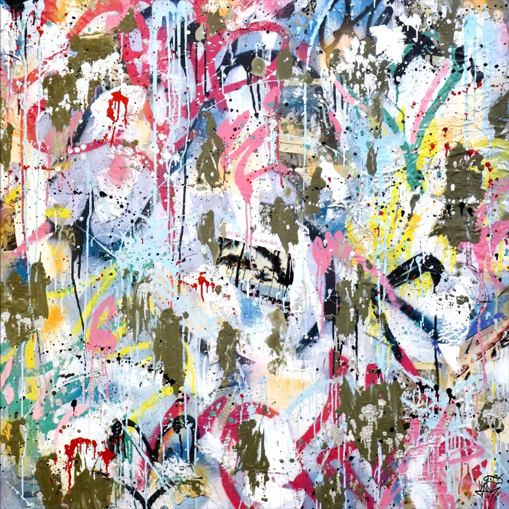 Bold splashes of color intersect with gestural streaks and drips, converging into an abstract visual. Hints of urban graffiti and a palette of vibrant hues suggest a dynamic fusion of street art and expressionism. The layered composition creates depth, drawing the viewer into a visual dialogue with the spirited forms.