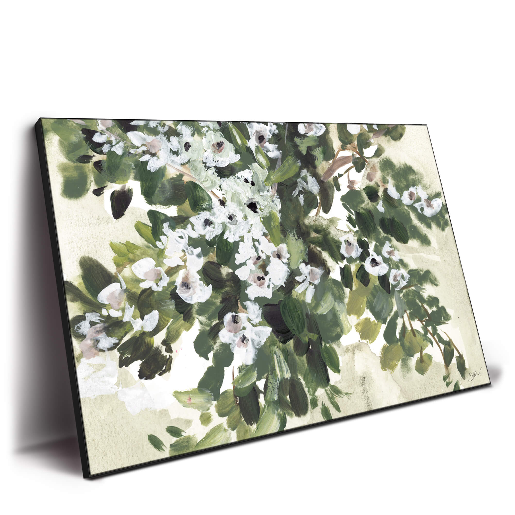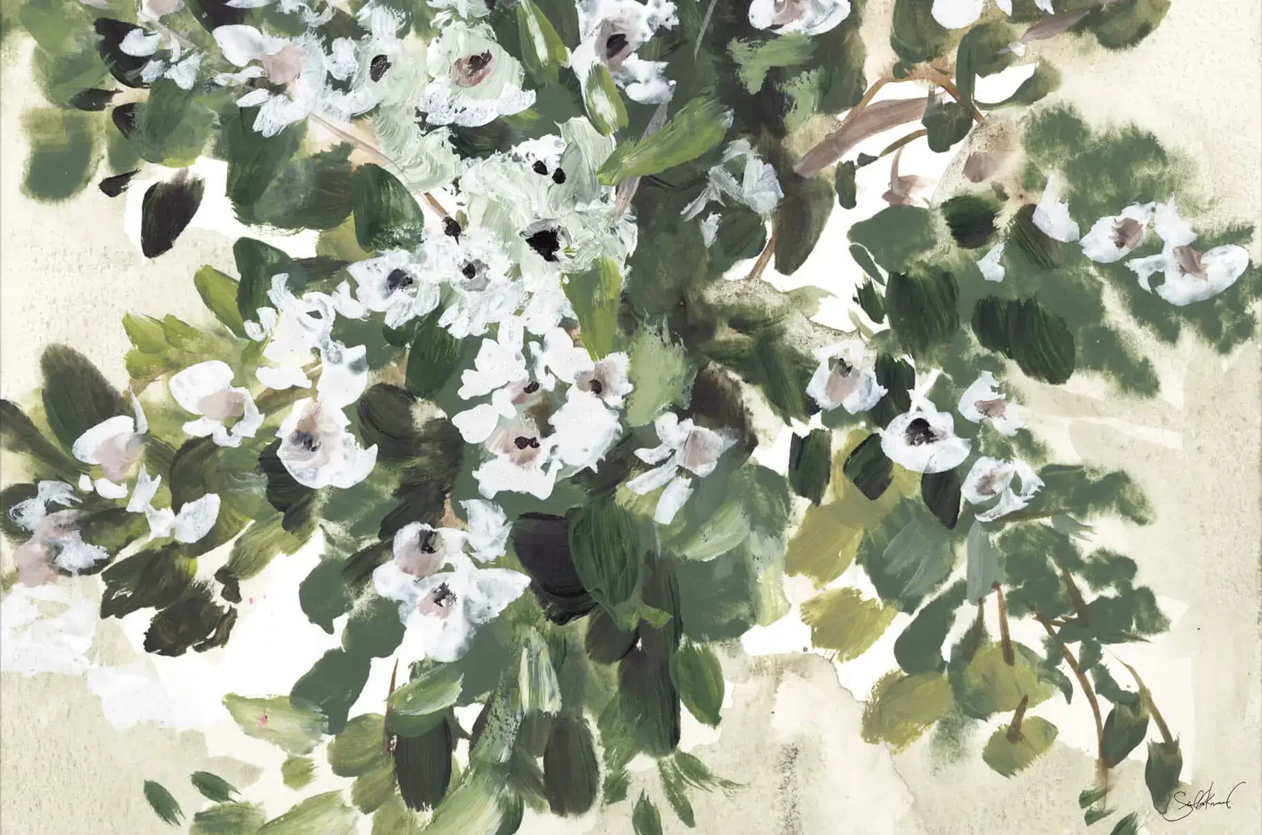 An overhead perspective of blooming white flowers amidst lush greenery evokes a feeling of a fresh, verdant garden. The strokes of green and white create a natural and organic texture, giving the viewer a sense of the blossoms’ delicate nature. The artwork is a celebration of floral simplicity and the vibrant life found within a garden in bloom.