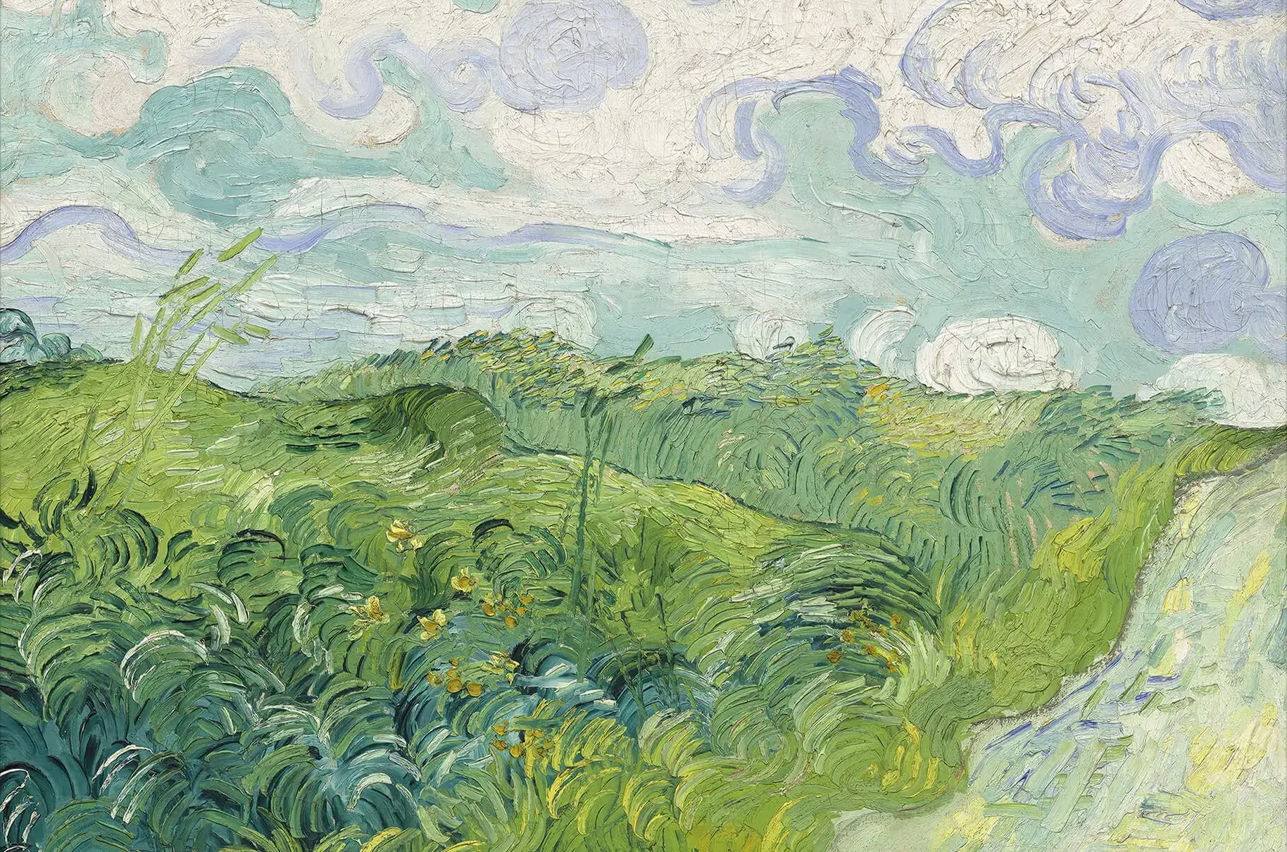 In Green Wheat Fields by Vincent van Gogh, lush wheat rises in thick, paint-loaded strokes that sweep across the foreground, each blade bending as if pushed by a soft French breeze. The hills ripple in tiered bands of jade, chartreuse, and teal, guiding the eye toward a pale horizon. Above, milky turquoise sky curls into whorls of lavender and powder blue, evoking wandering summer clouds. Light catches scattered yellow blossoms and hints of gold, adding flickers of warmth amid the cool greens.