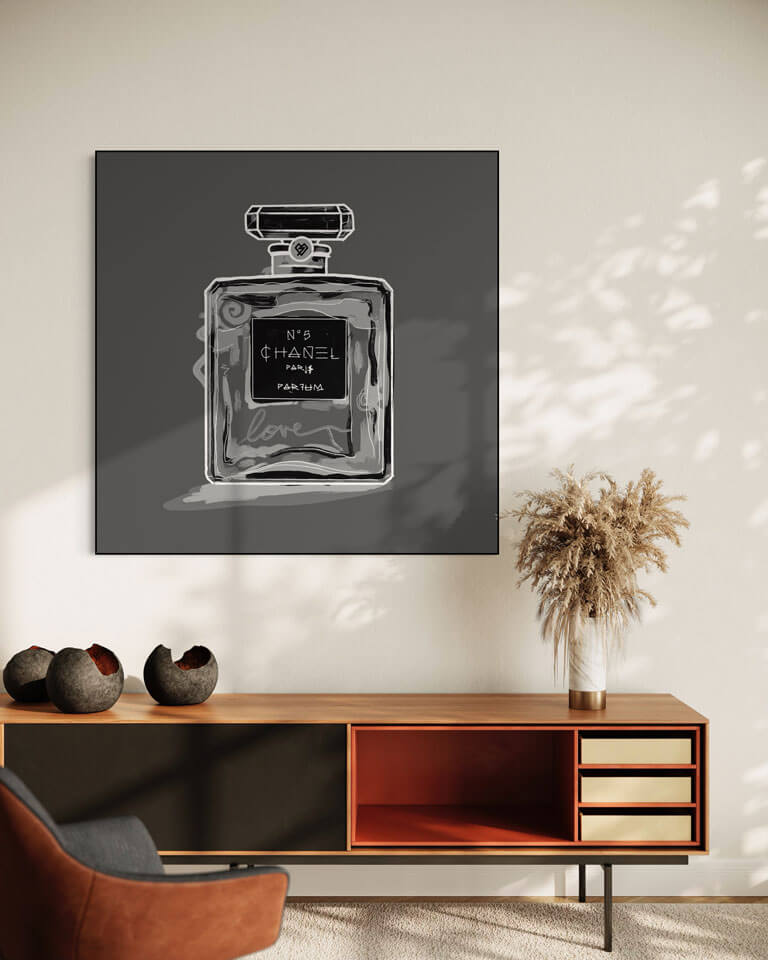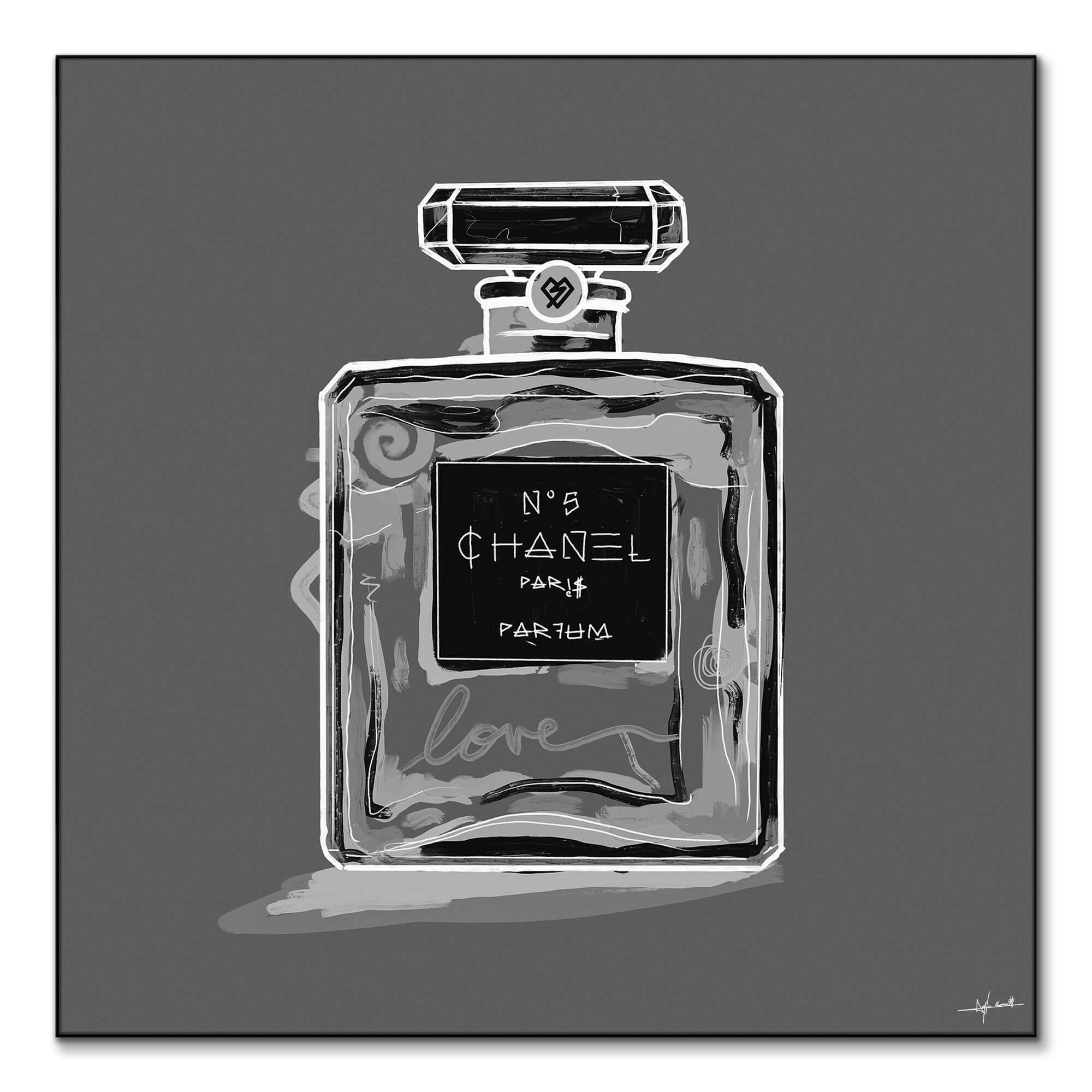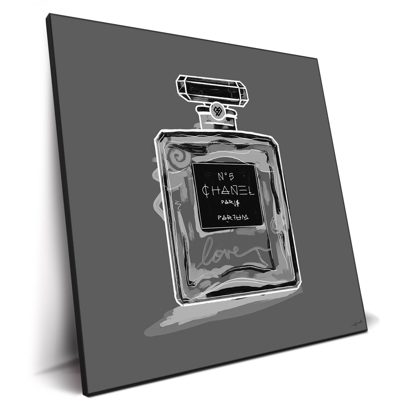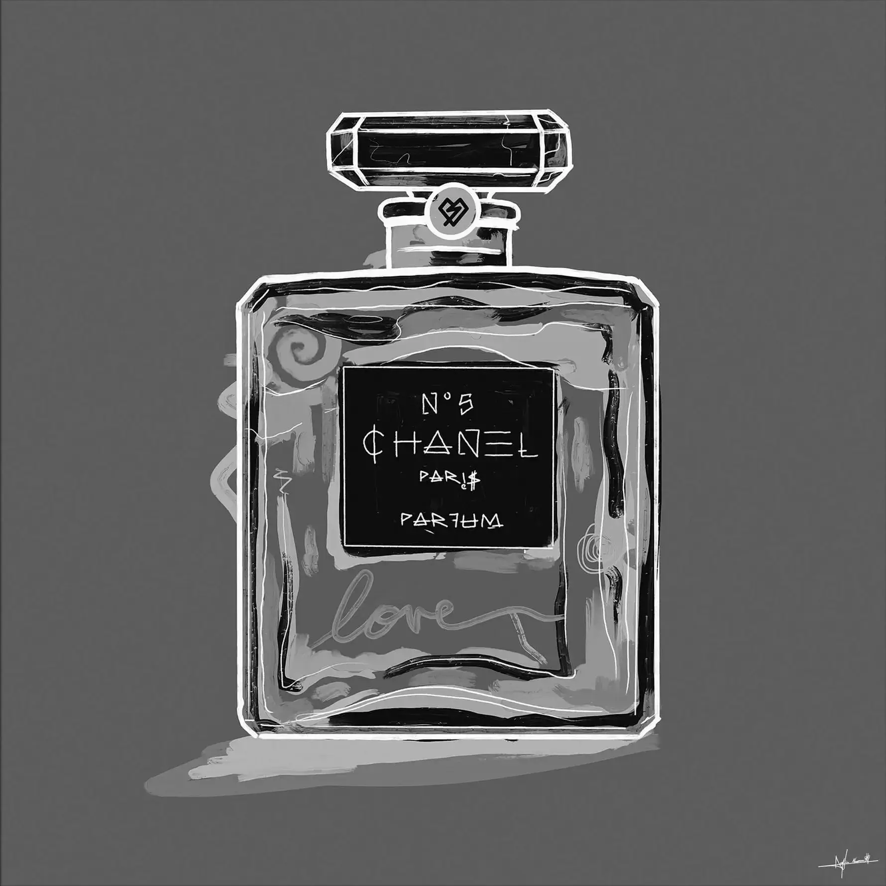 Rendered in grayscale tones, this digital illustration captures the iconic Chanel No. 5 perfume bottle with a minimalist yet expressive style. The simplicity of the drawing emphasizes the timeless elegance of the perfume, with “love” playfully inscribed, adding a personal touch to the classic design.