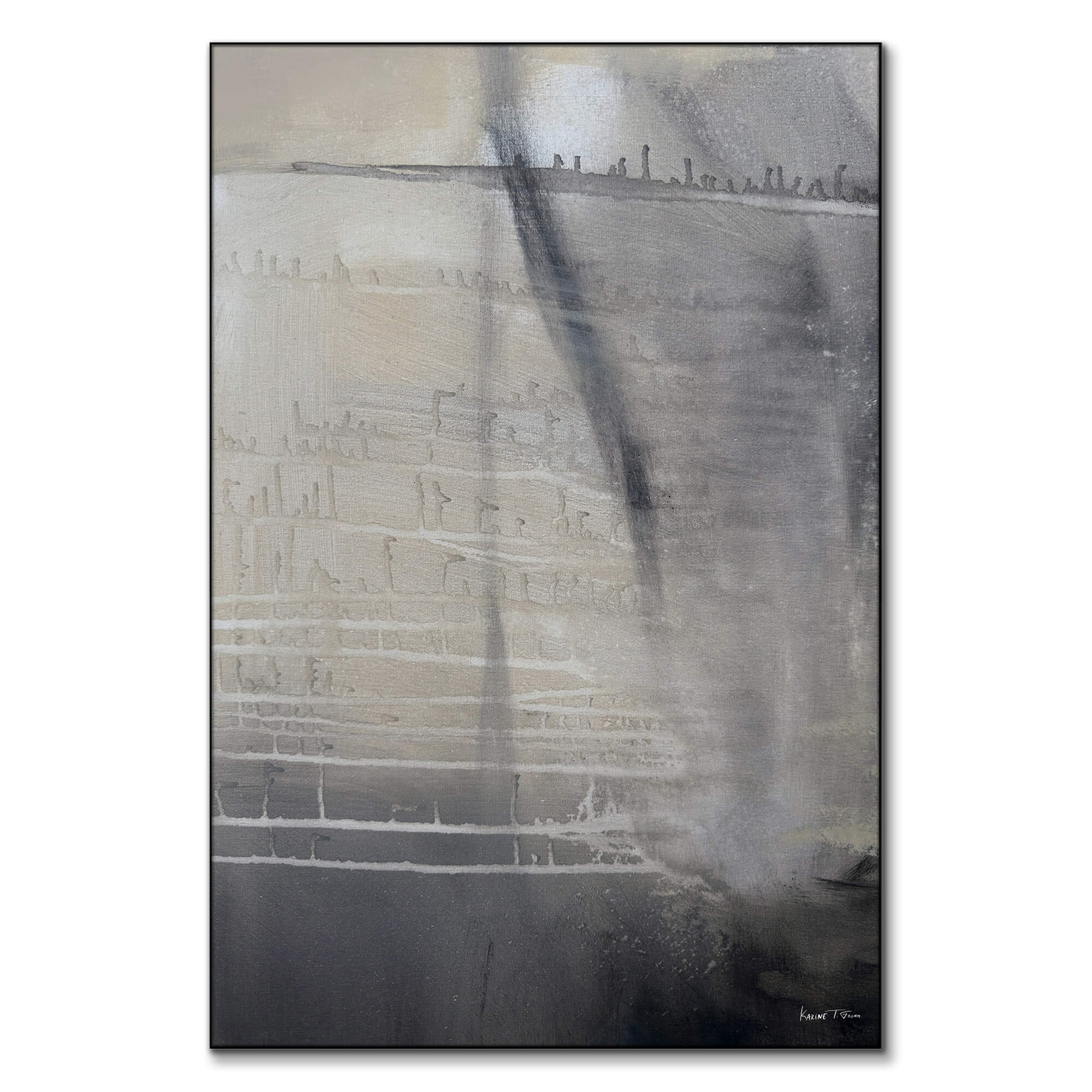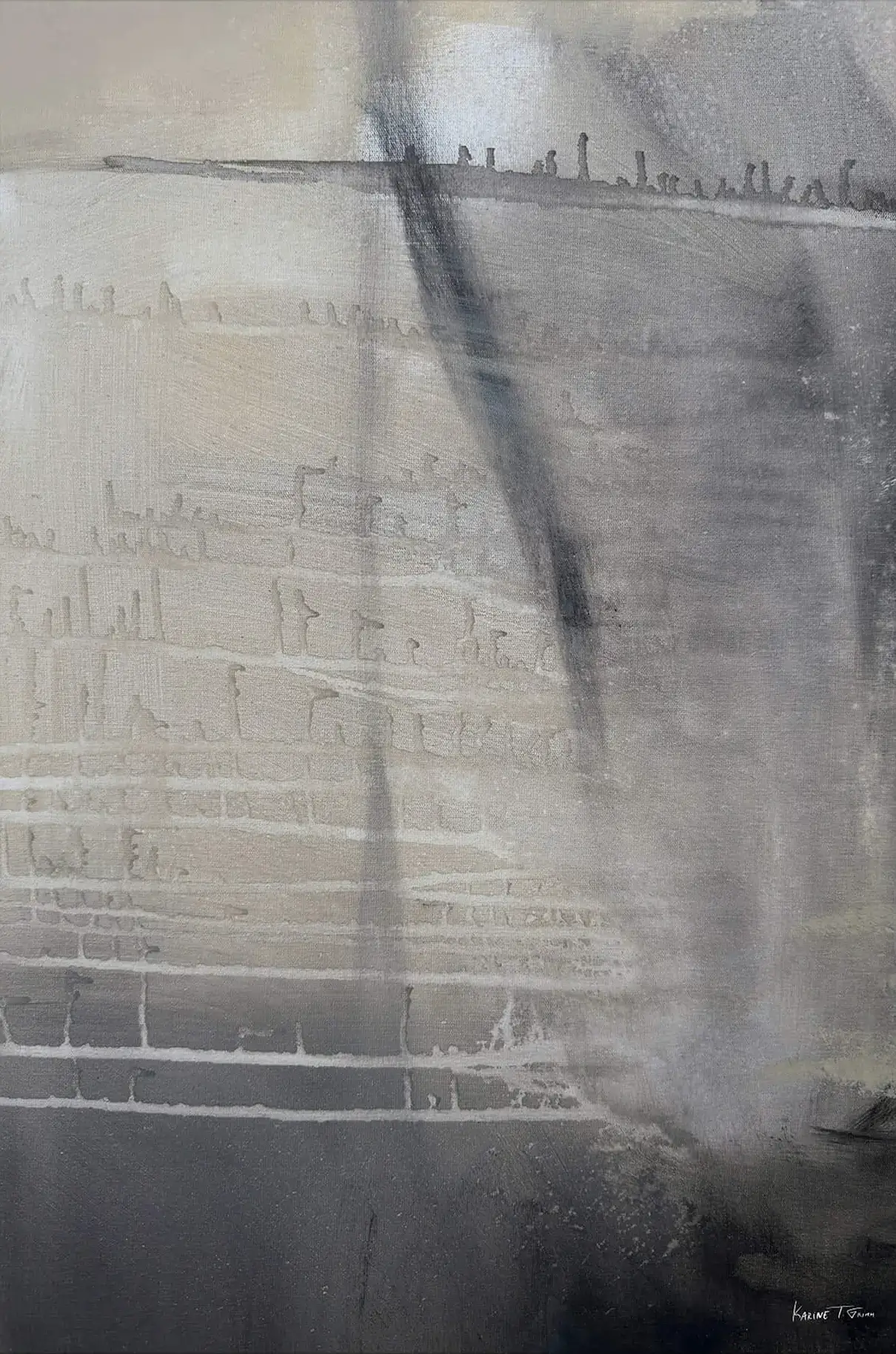 A muted palette of grays evoke a sense of calm and introspection. Horizontal lines etched across the artwork suggest a distant horizon, fading into the background. A vertical streak adds depth, creating a focal point that invites contemplation. The gentle gradation of colors and the soft textures blend seamlessly, creating airy atmosphere.
