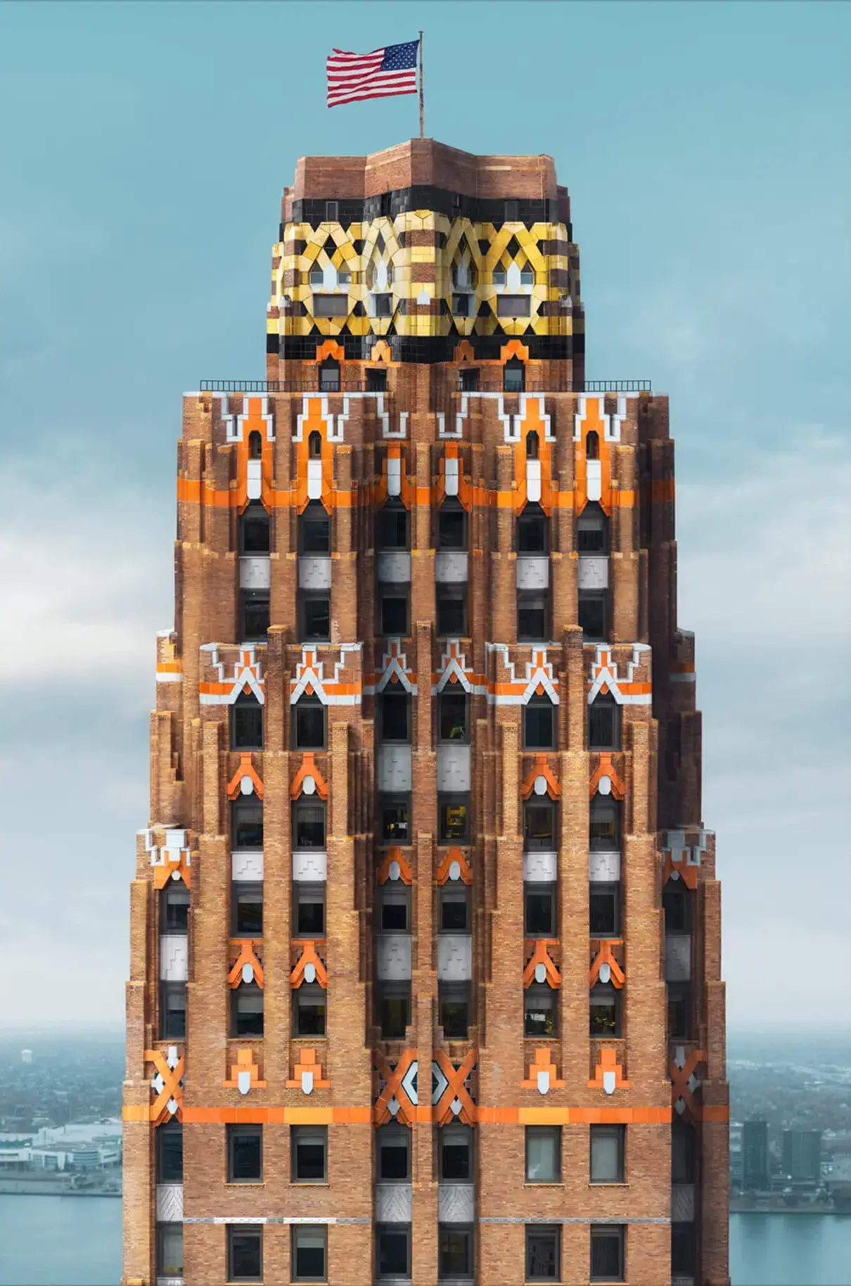 Rising majestically against the cityscape, the Guardian Building showcases a spectacular example of Art Deco grandeur, its facade adorned with vibrant orange and tan geometrical embellishments. The centerpiece of the image is the stately American flag, unfurling in the breeze atop the historic edifice.