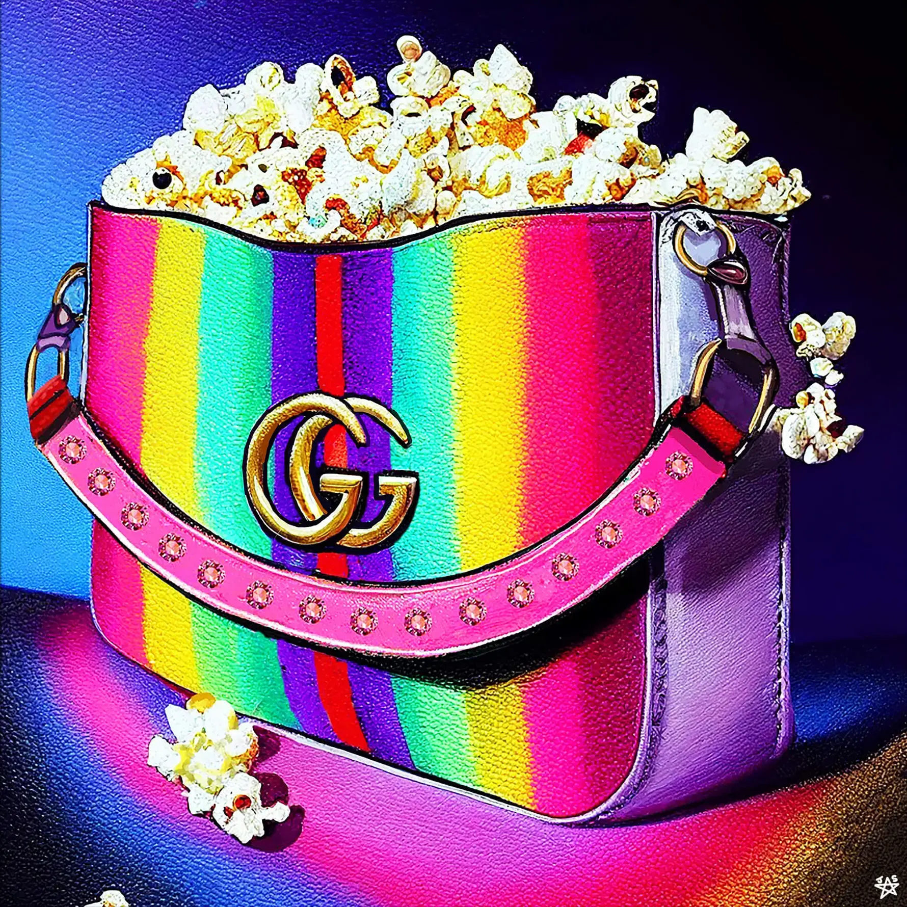 A Gucci Bag with multicolored stripes is filled with popcorn, against a dark background. The purse features a prominent gold logo and pink trim with studs. Some popcorn kernels have fallen onto the surface below the purse. The image has a vibrant, high-contrast look.